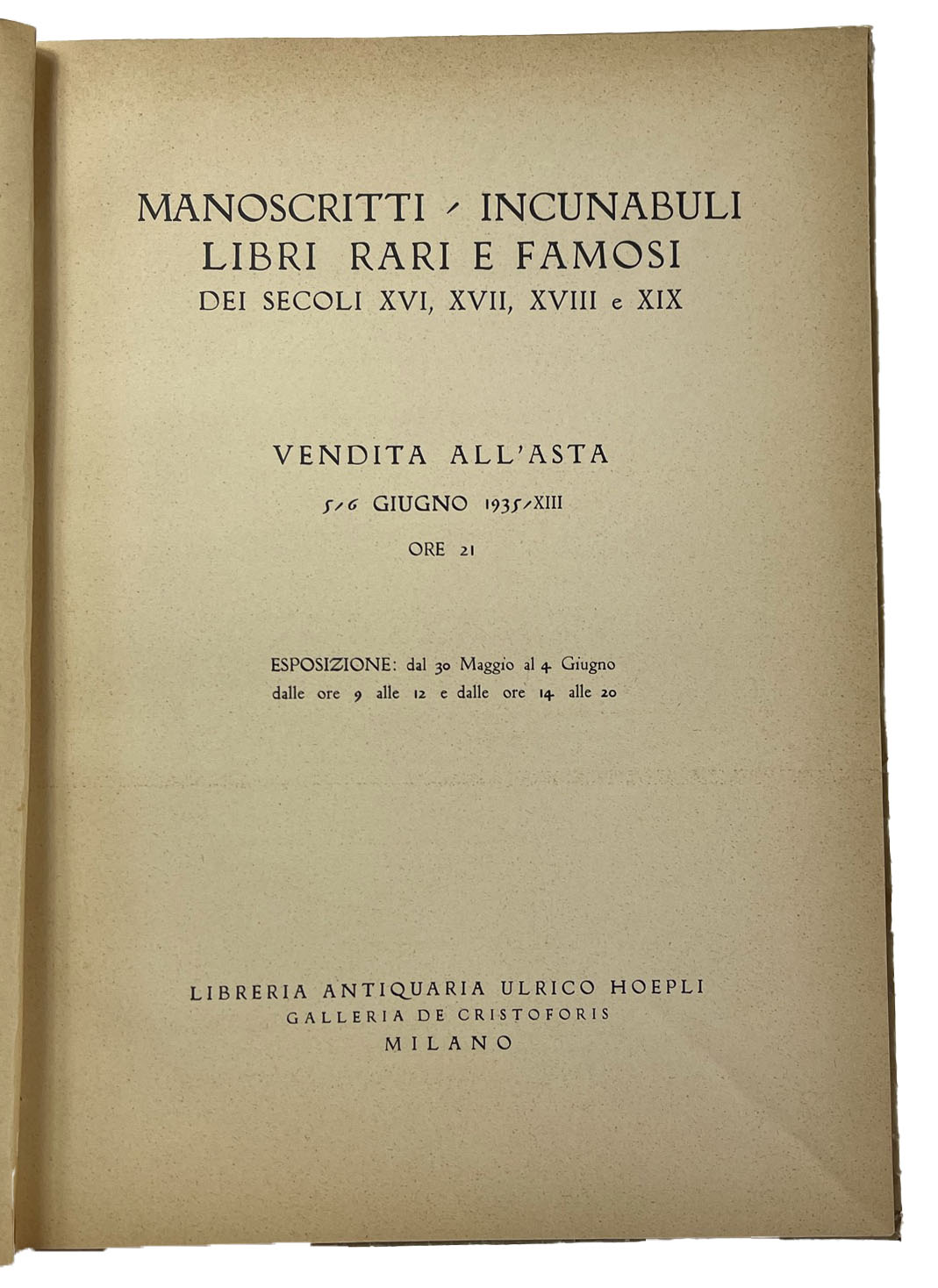 Catalogo vendita all'asta di manoscritti ecc. - giugno 1935 - Hoepli- Milano
