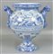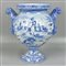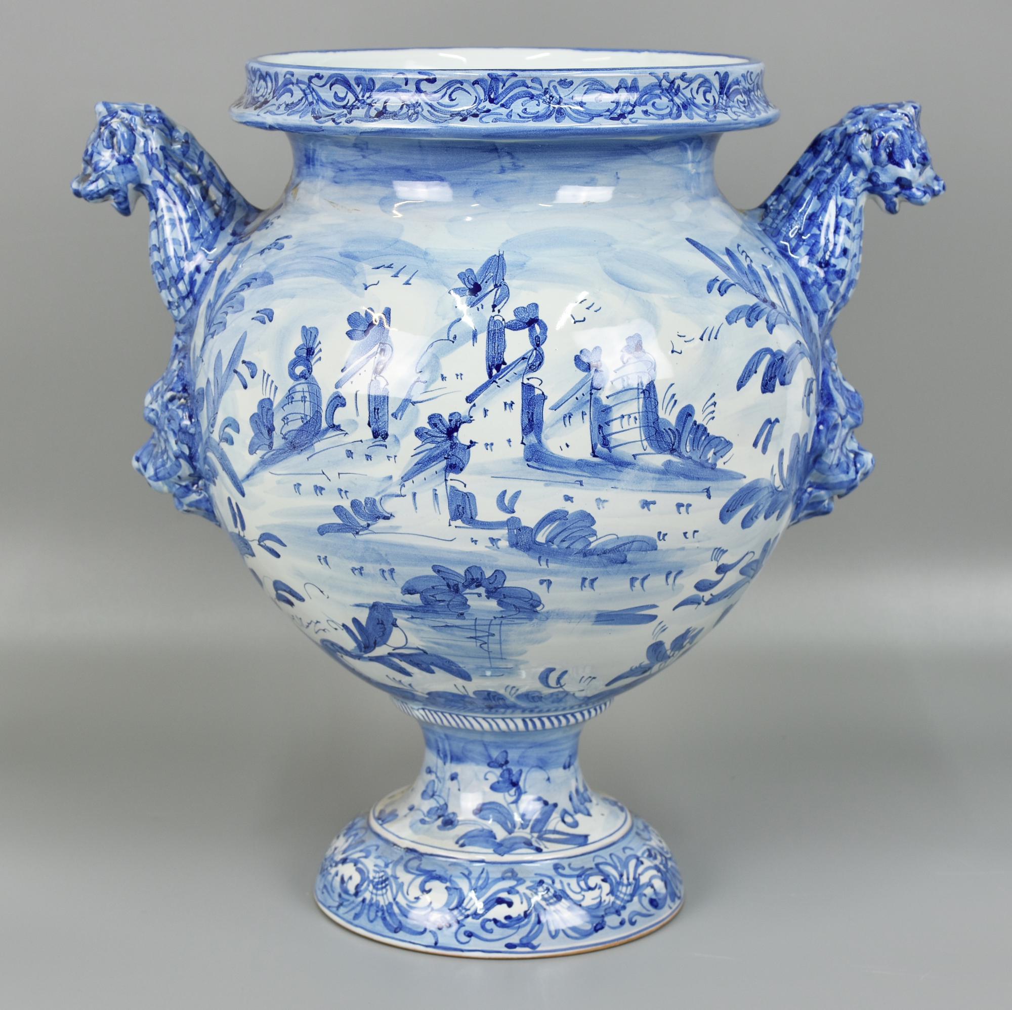 grande vaso in ceramica di Albissola nei toni dell'azzurro e del cobalto, manici a teste di leone e chimera, firmata Musumeci Albissola sotto la base