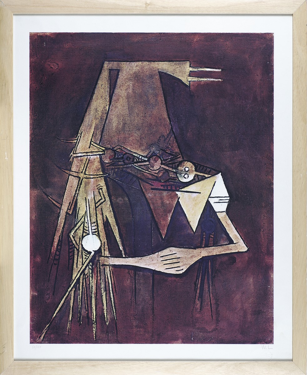 LAM WILFREDO (1902 - 1982) Senza titolo. Litografia. Cm 70,00 x 85,00. 51/150. Tiratura e firma in basso a matita. In basso a destra timbro a secco Galleria Nuovo Sagittario, Milano. Cornice presente