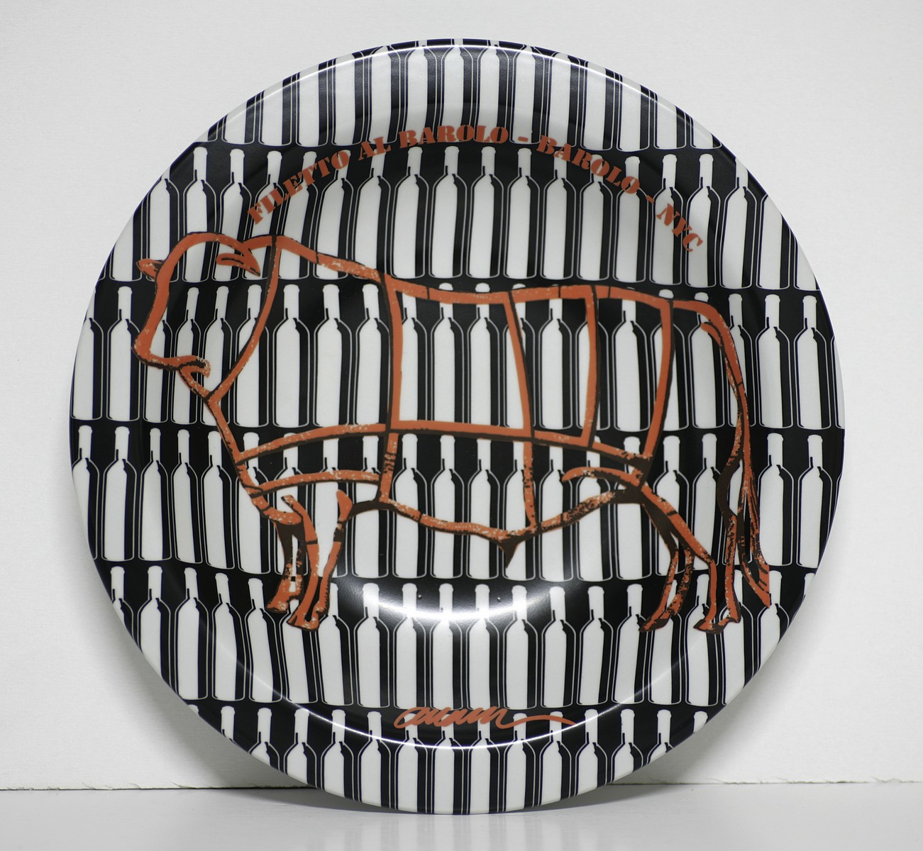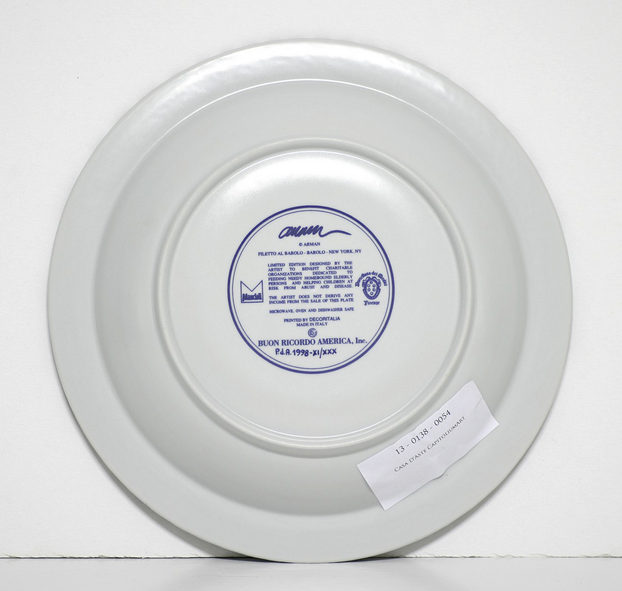 ARMAN FERNANDEZ (1928 - 2005) Filetto al Barolo-Barolo-New York City. 1998. Serigrafia. . Piatto fondo in porcellana serigrafata, diametro 26cm. Edizione limitata realizzata a scopo benefico. Firma serigrafata sul fronte e sul retro. Al retro descrizione e tir. P.D.A.-1998-XI/XXX.