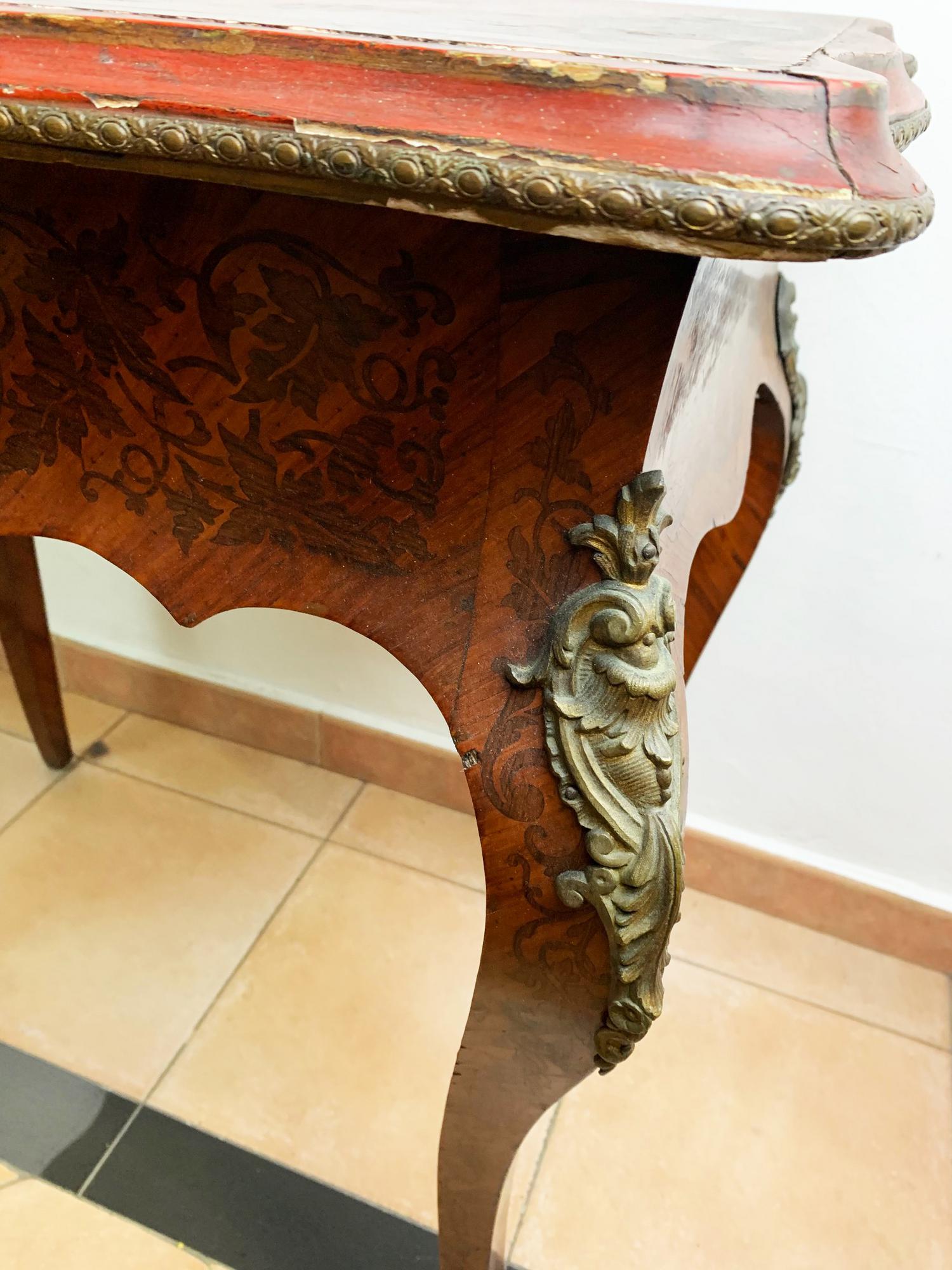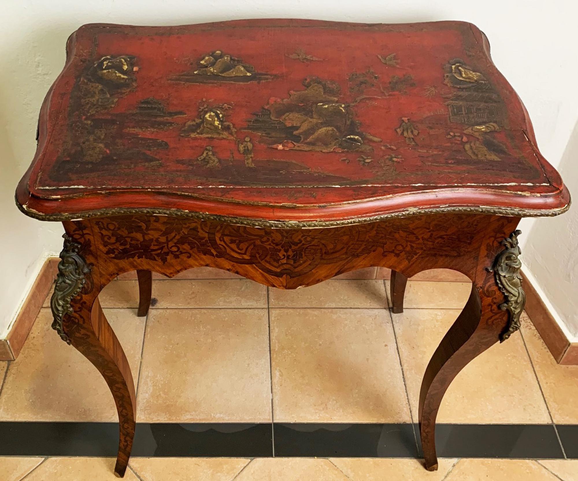 con intarsi di legni di varie essenze a motivi floreali, gambe mosse con placche di ottone dorato, piano in lacca rossa a decorazioni orientaleggianti bordato da modanatura in ottone dorato