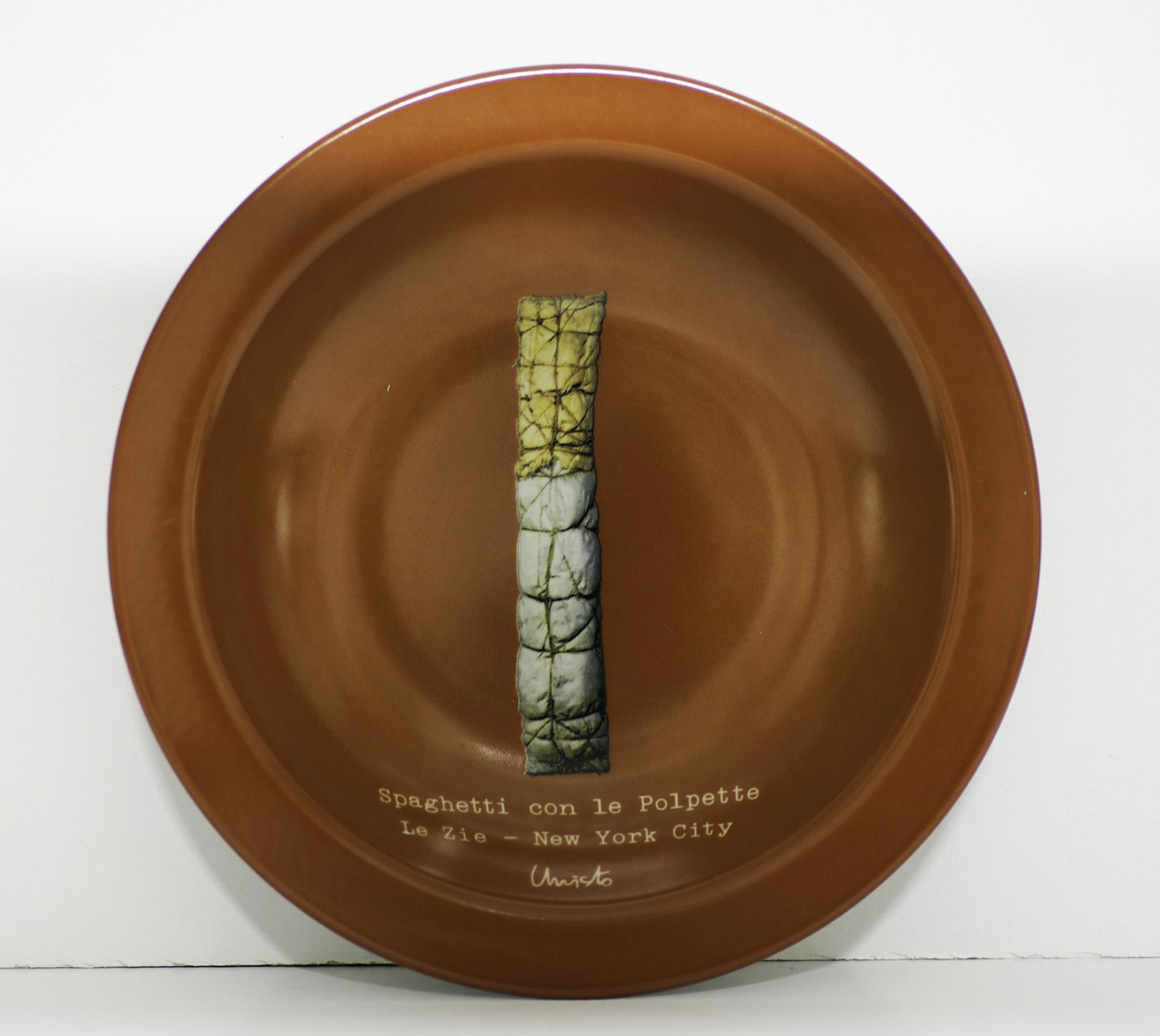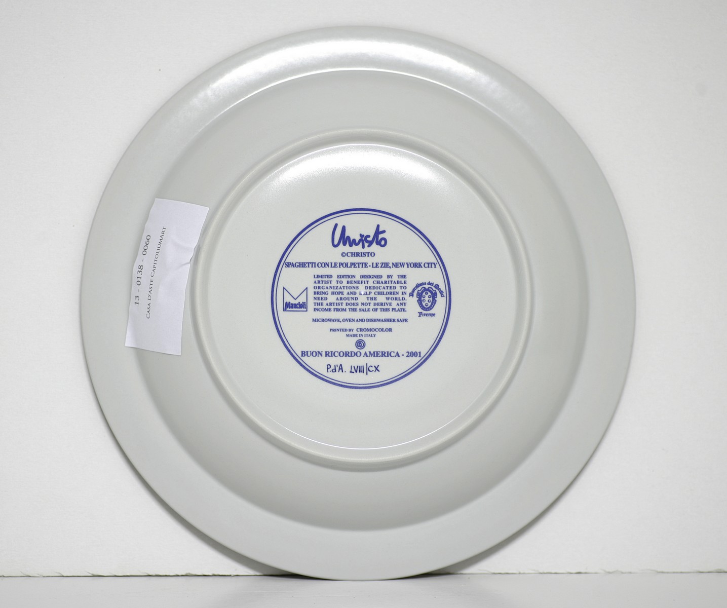 CHRISTO (n. 1935) Spaghetti con le polpette-Le zie-New York City. 2001. Serigrafia. . Piatto fondo in porcellana serigrafata, diametro 26cm. Edizione limitata realizzata a scopo benefico. Firma serigrafata sul fronte e sul retro. Al retro descrizione e tir. P.D.A.LVIII/CX.