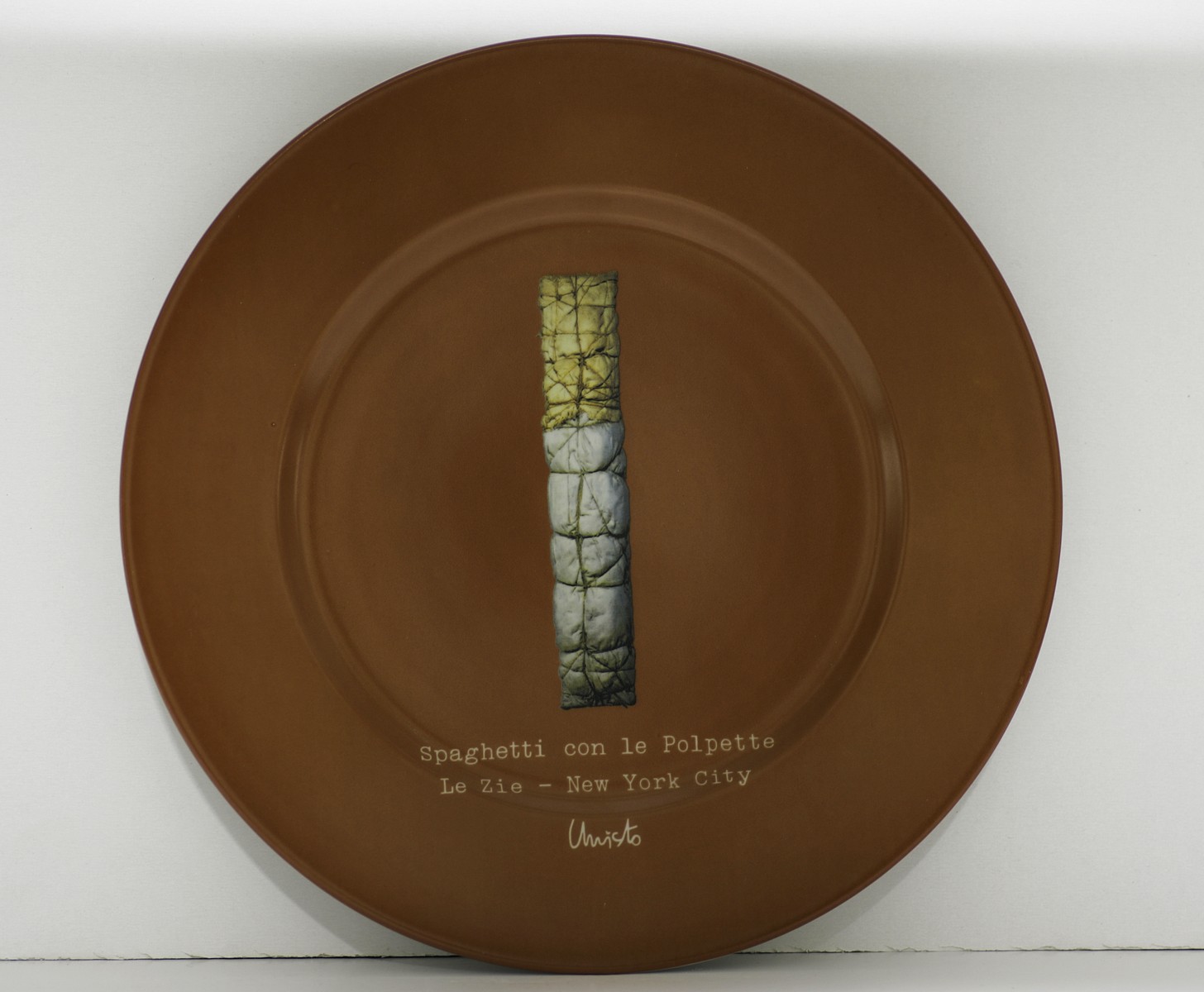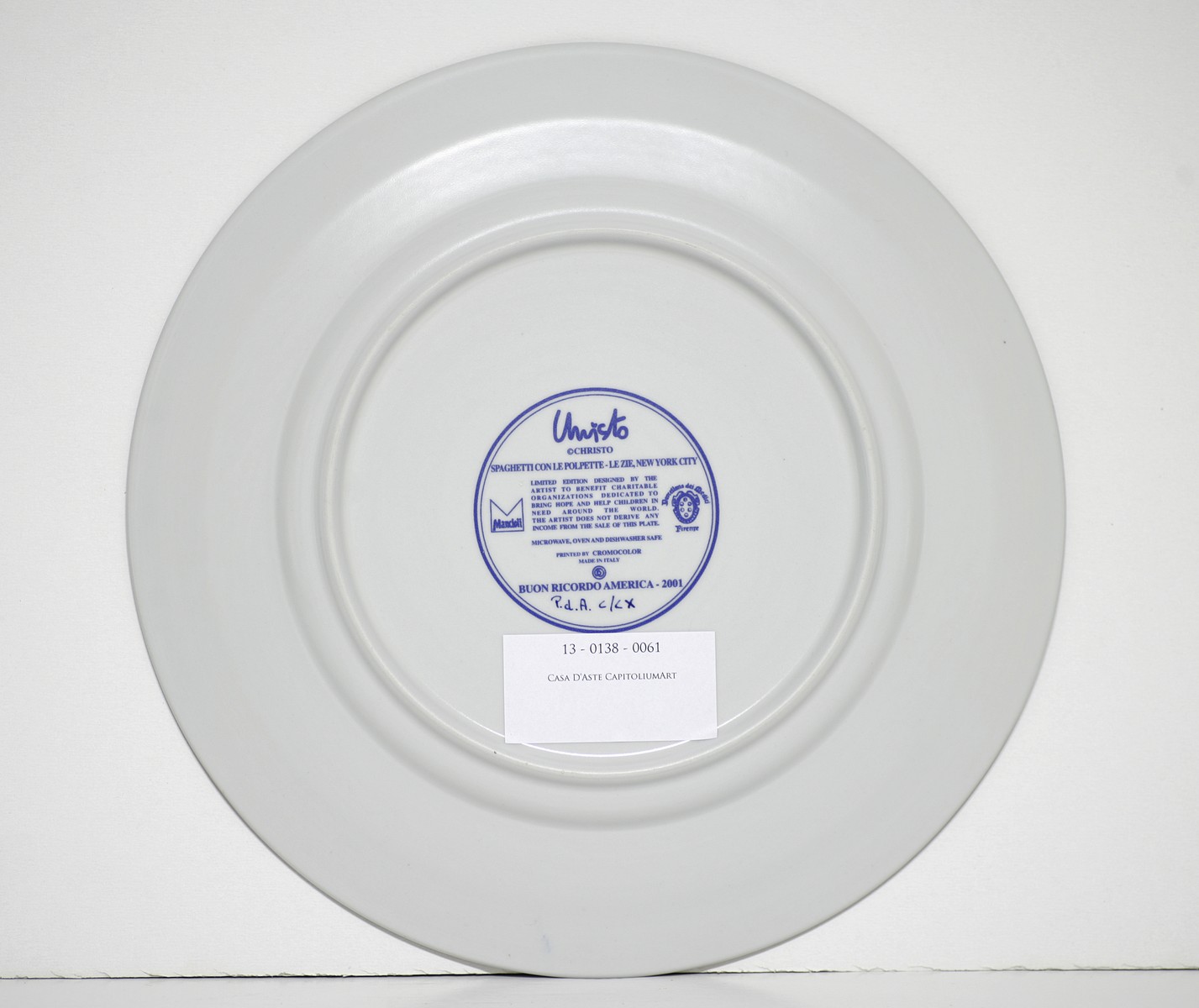 CHRISTO (n. 1935) Spaghetti con le polpette-Le zie-New York City. 2001. Serigrafia. . Piatto piano in porcellana serigrafata, diametro 32cm. Edizione limitata realizzata a scopo benefico. Firma serigrafata sul fronte e sul retro. Al retro descrizione e tir. P.D.A. C/CX.