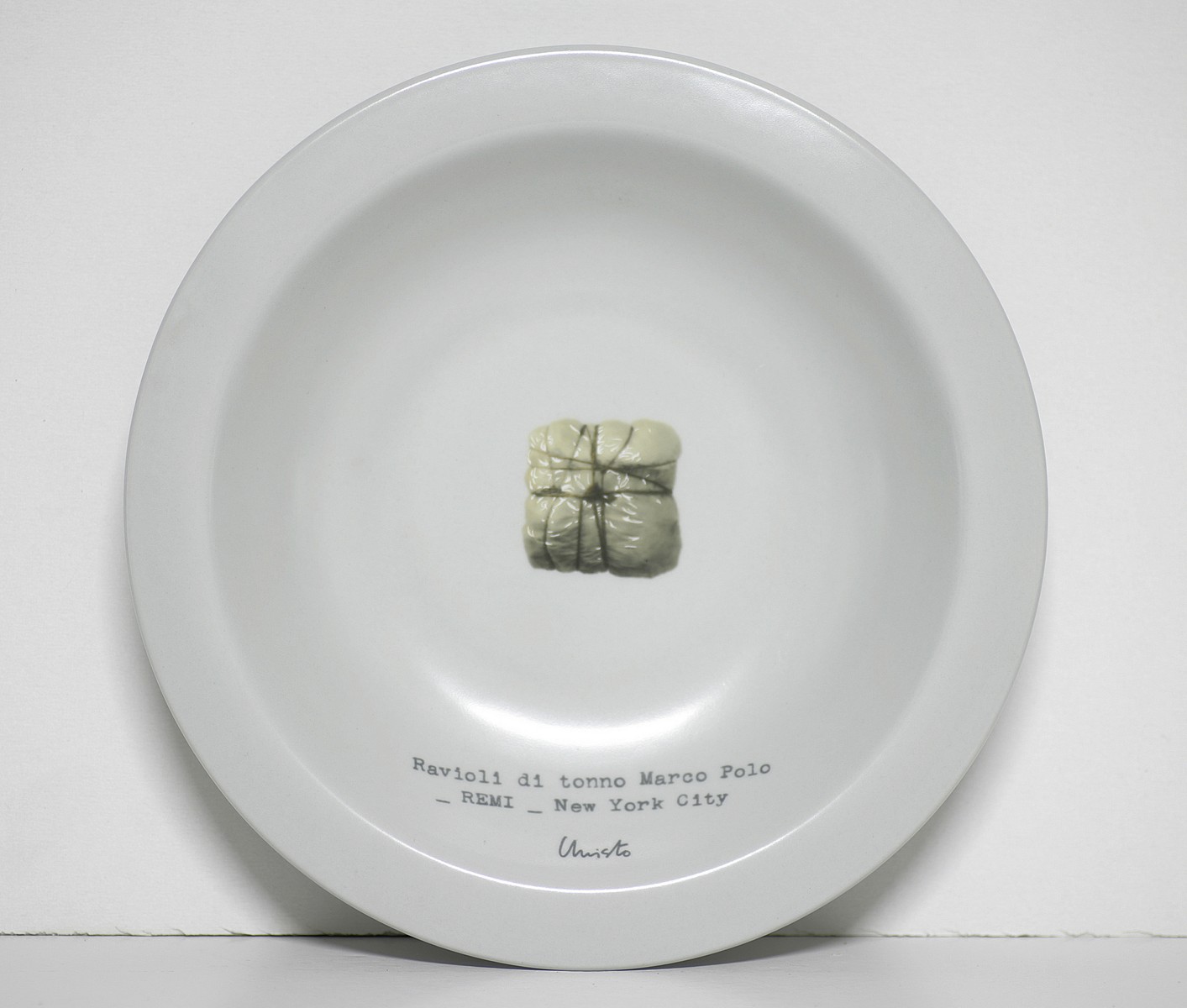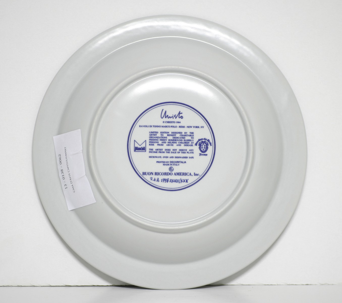 CHRISTO (n. 1935) Ravioli di tonno Marco Polo-Remi-New York City. 1998. Serigrafia. . Piatto fondo in porcellana serigrafata, diametro 26cm. Edizione limitata realizzata a scopo benefico. Firma serigrafata sul fronte e sul retro. Al retro descrizione e tir. P.D.A.1998-XXVIII/XXX.