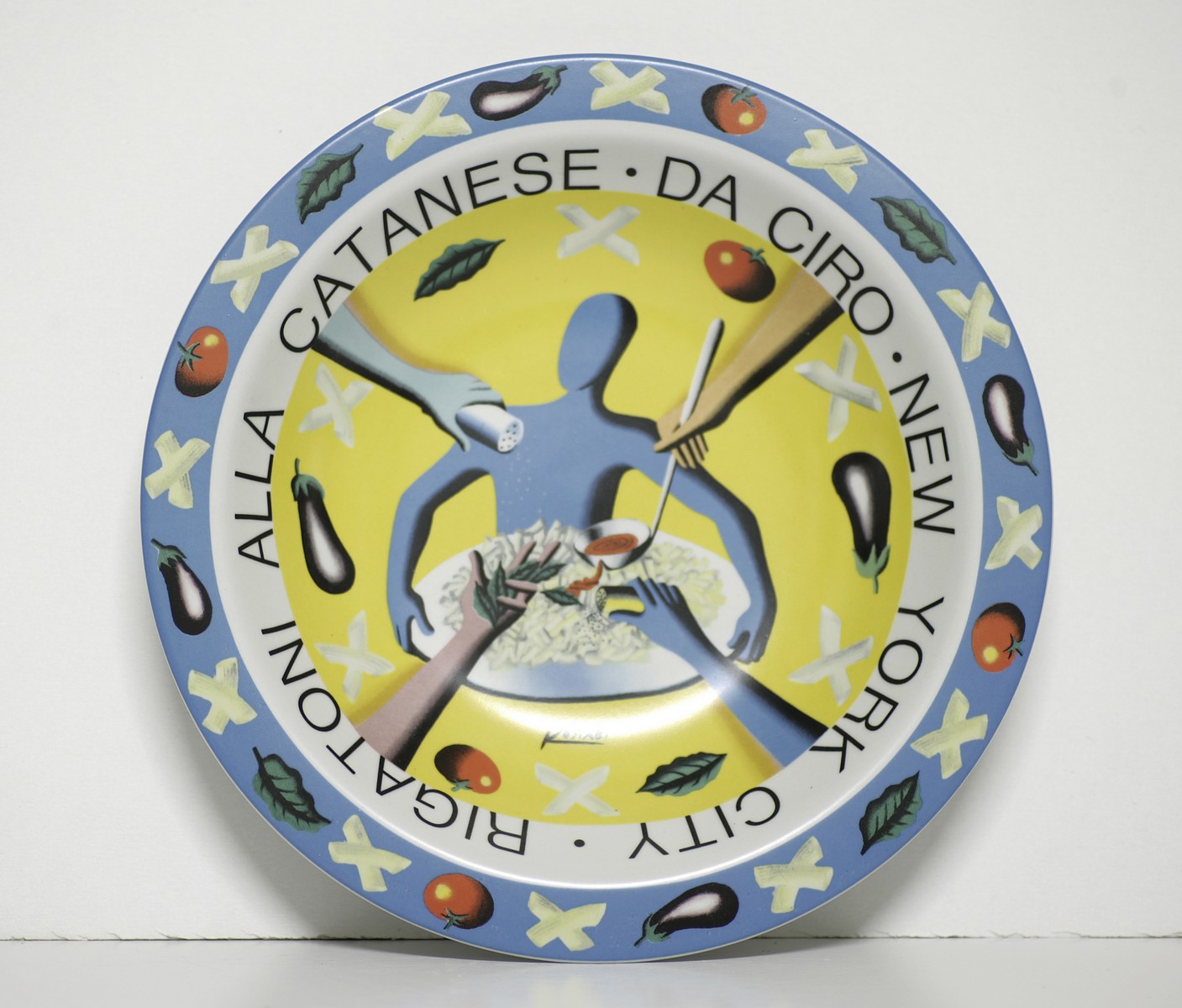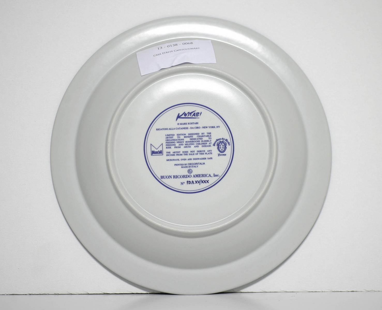 KOSTABI MARK (n. 1960) Rigatoni alla catanese-Da Ciro-New York City. 2000. Serigrafia. . Piatto fondo in porcellana serigrafata, diametro 26cm. Edizione limitata realizzata a scopo benefico. Firma serigrafata sul fronte e sul retro. Al retro descrizione e tir. P.D.A.XV/XXX.
