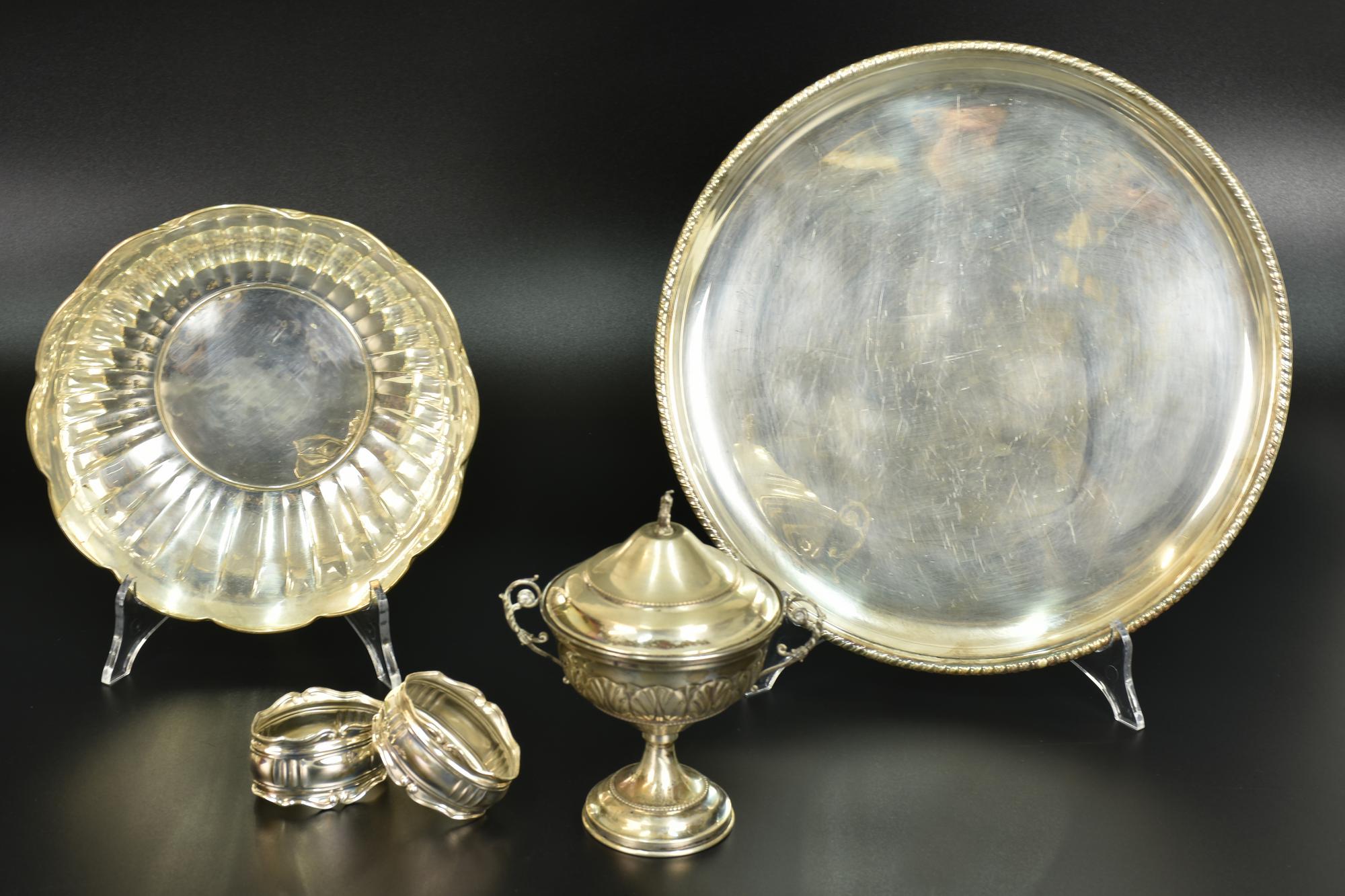 LOTTO DI ARGENTI composto da vassoio, centro tavola, zuccheriera e coppia di...