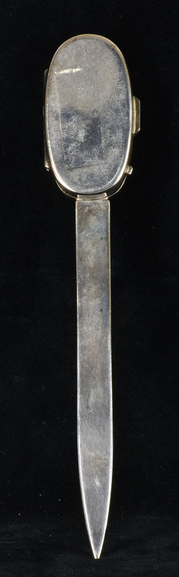 TAGLIACARTE con porta pastiglie argentato Italia, 1970 ca lungh cm 16
