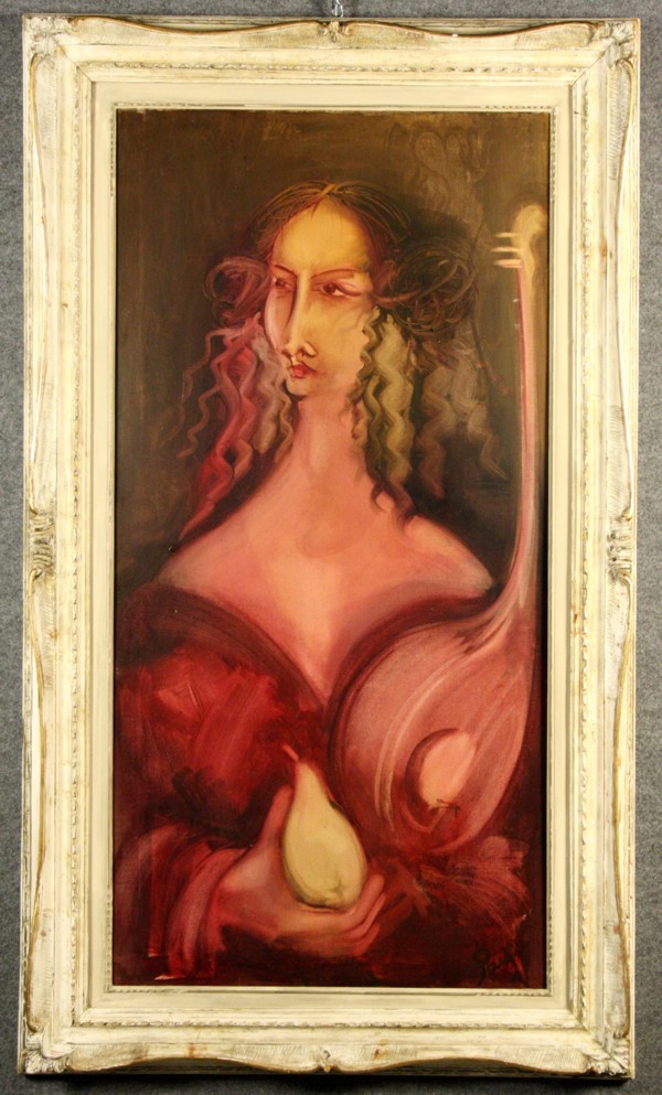 Firmato, datato. Dipinto olio su tela intitolato ''LA CONTESSA GIUDITTA E LA SUA CONTROFIGURA IN SOGNO''. Firmato PAUL RIPAMONTI in basso a destra, controfirmato e datato 1974 sul retro, dove si trova anche il timbro della galleria Schettini. In cornice. Mis. Lung. cm. 60 Alt. cm. 120 ca.