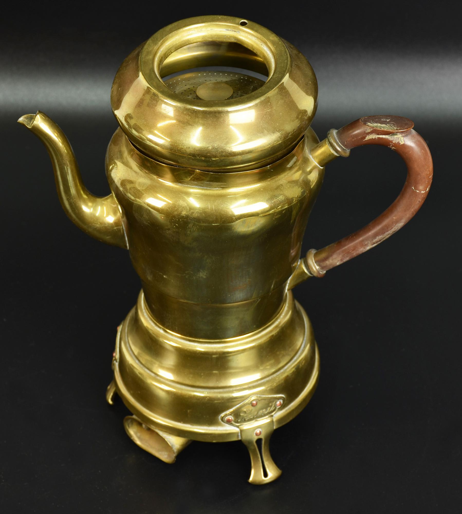 caffettiera elettrica in ottone dorato con manico in legno scuro