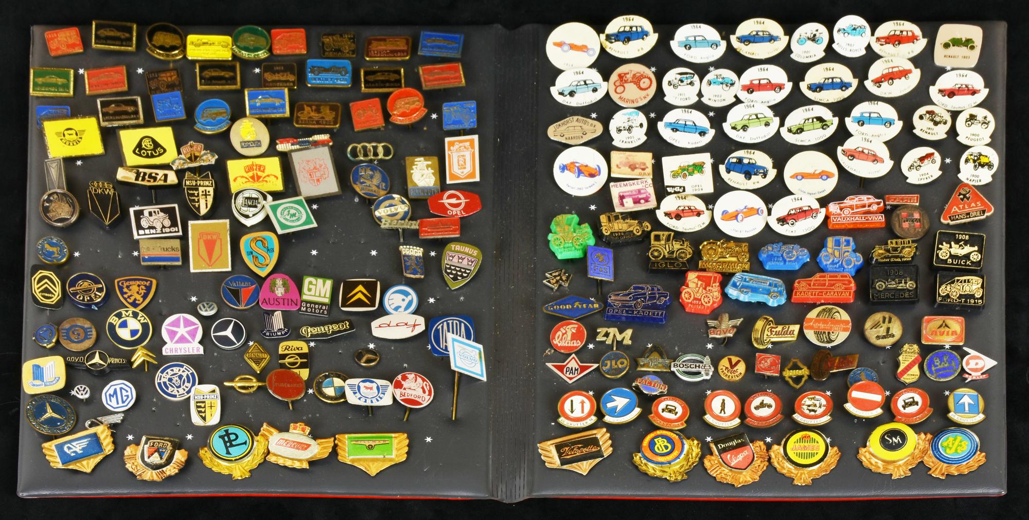 set di spille in metallo raffiguranti autoveicoli e stemmi di case automobilistiche