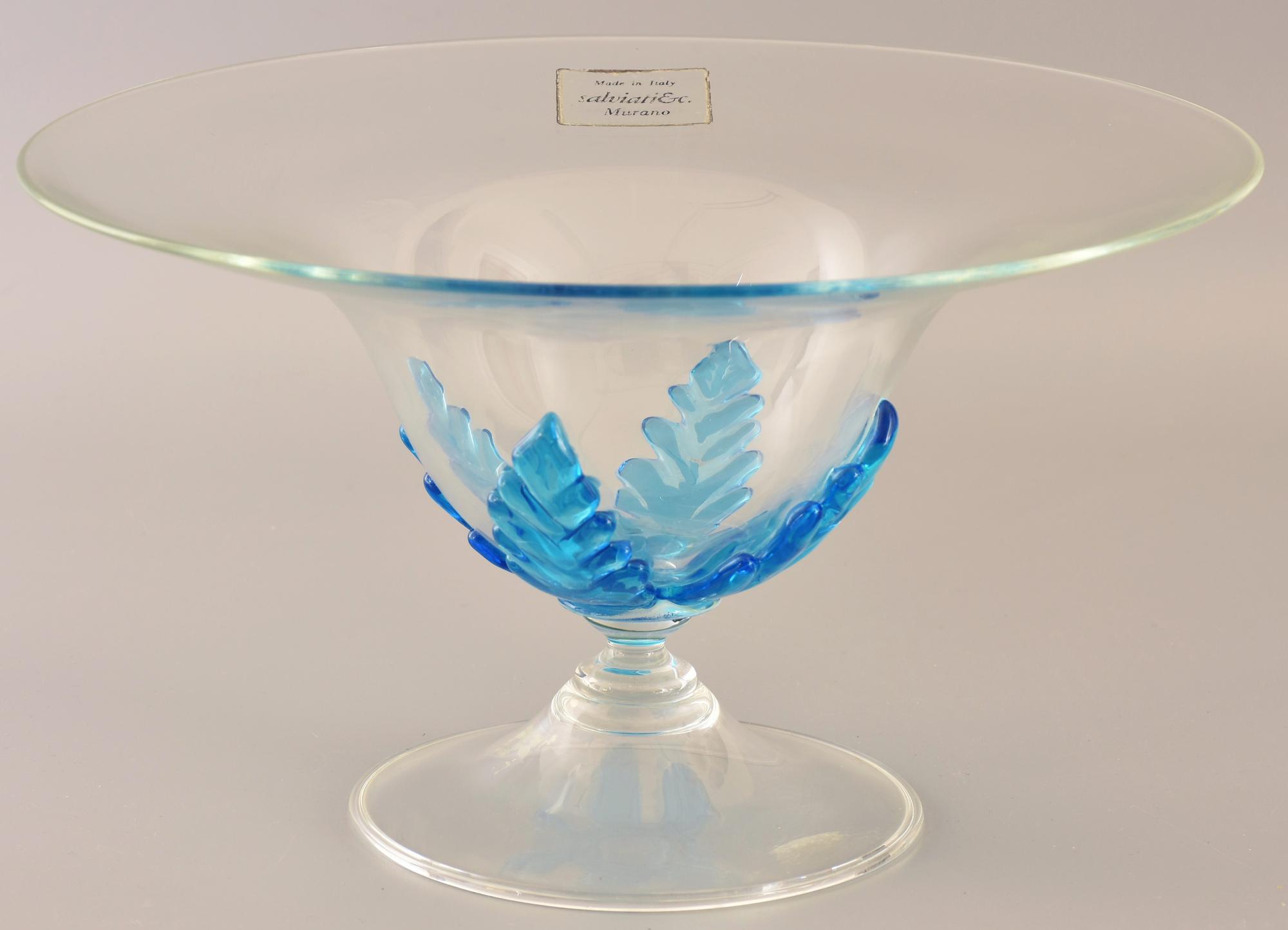 coppa in vetro soffiato con decorazioni in foglie azzurre, con etichetta dell'autore, Salviati Murano