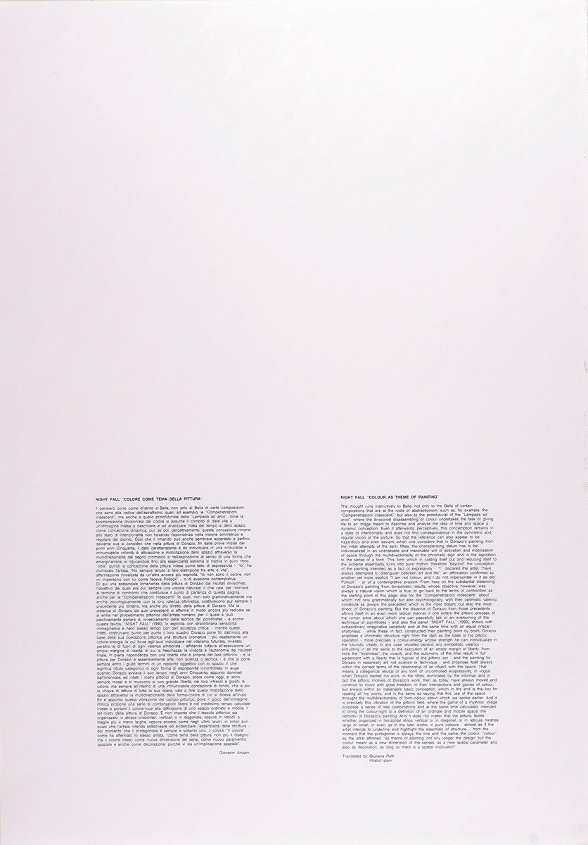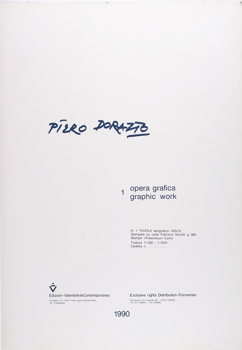 DORAZIO PIERO (1927 - 2005) Night Fall. 1990. Serigrafia. Cm 70,00 x 100,00. Cartella completa contenente n.1 serigrafia a 22 colori a 22 colori firmata e numerata dall'autore a gessetto. Tiratura: 100 + XXX. Edizioni Valente Arte Contemporanea, con testi di Giovanni Anzani. Stamperie Freecolour, Cantù. Confezione originale numerata. Esemplare: 95