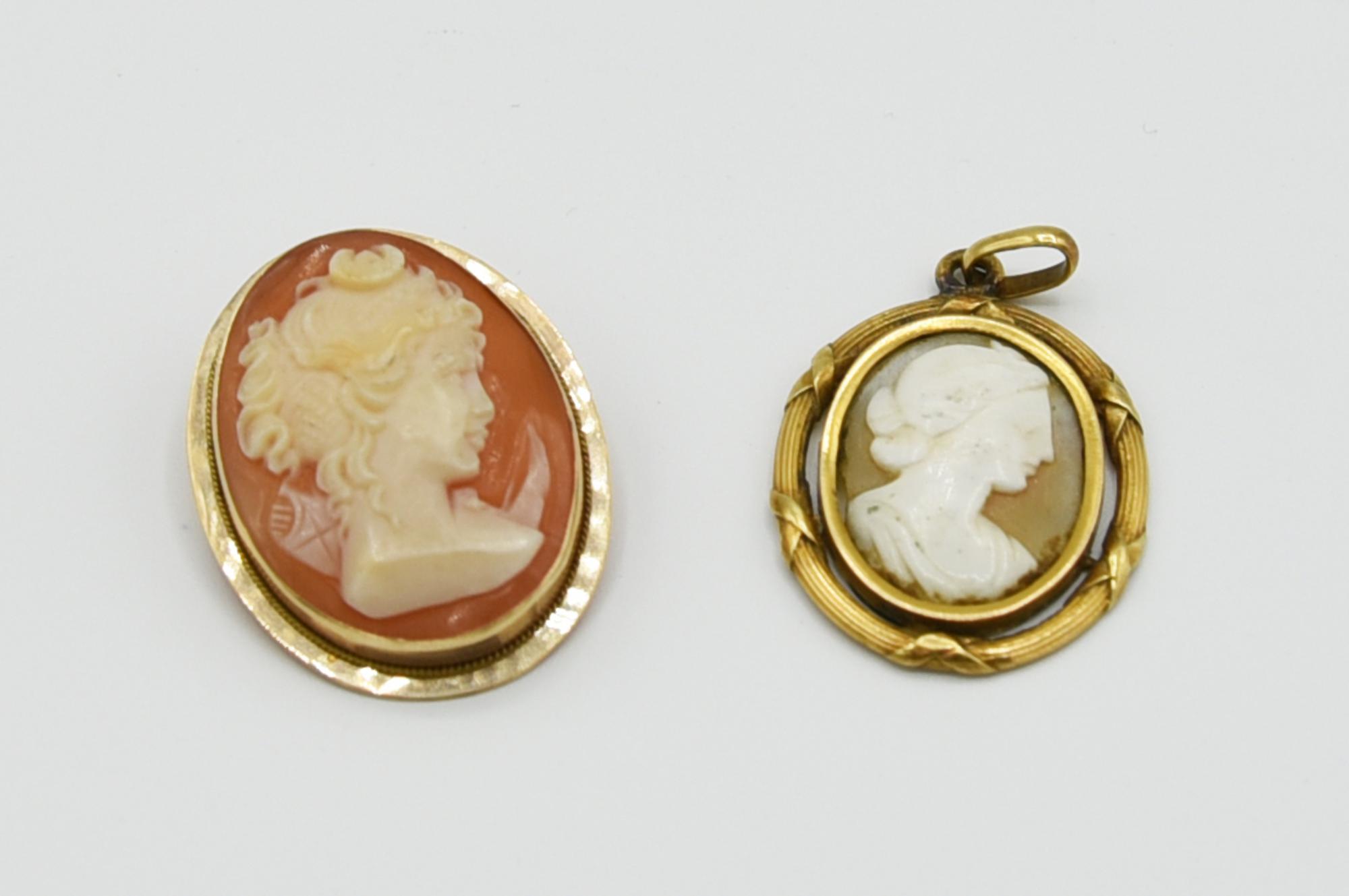 coppia di cammei in conchiglia raffiguranti entrambi busto femminile all'antica, un pendente ovale con cammeo entro cornice a basso titolo e spilla entro cornice dorata, rispettivamente cm 2,5x2 e cm 2,8x2,3 ciascuno, g. 7 complessivi