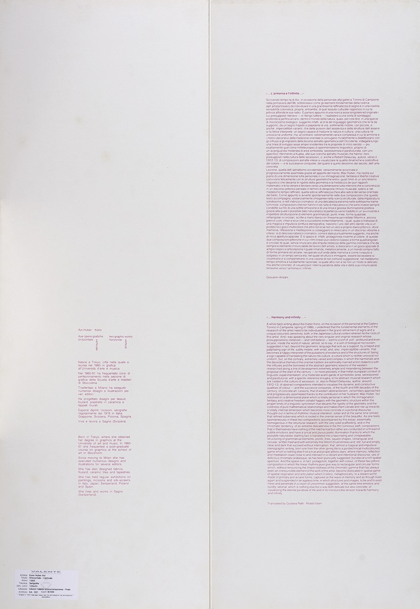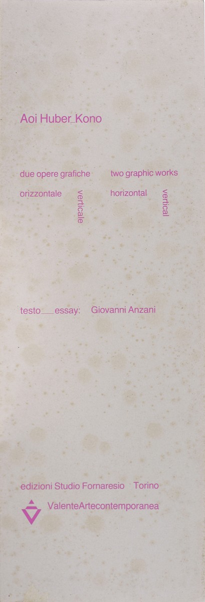 HUBER-KONO KONO (n. 1936) Orizzontale - Verticale. 1989. Serigrafia. Cm 35,00 x 100,00. Cartella completa contenente n.2 serigrafie firmate e numerate dall'autore a matita. Tiratura: 100 + XXX. Edizioni Valente Arte Contemporanea, Studio Fornaresio, con testi di Giovanni Anzani.Confezione originale numerata. Esemplare: 7