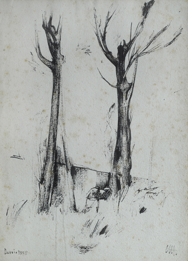Pietro Annigoni (Milano, 1910 - Firenze, 1988) ALBERI E FIGURE, 1933 China su carta, cm.25x17,5 Sigla in basso a destra, data in basso a sinistra.