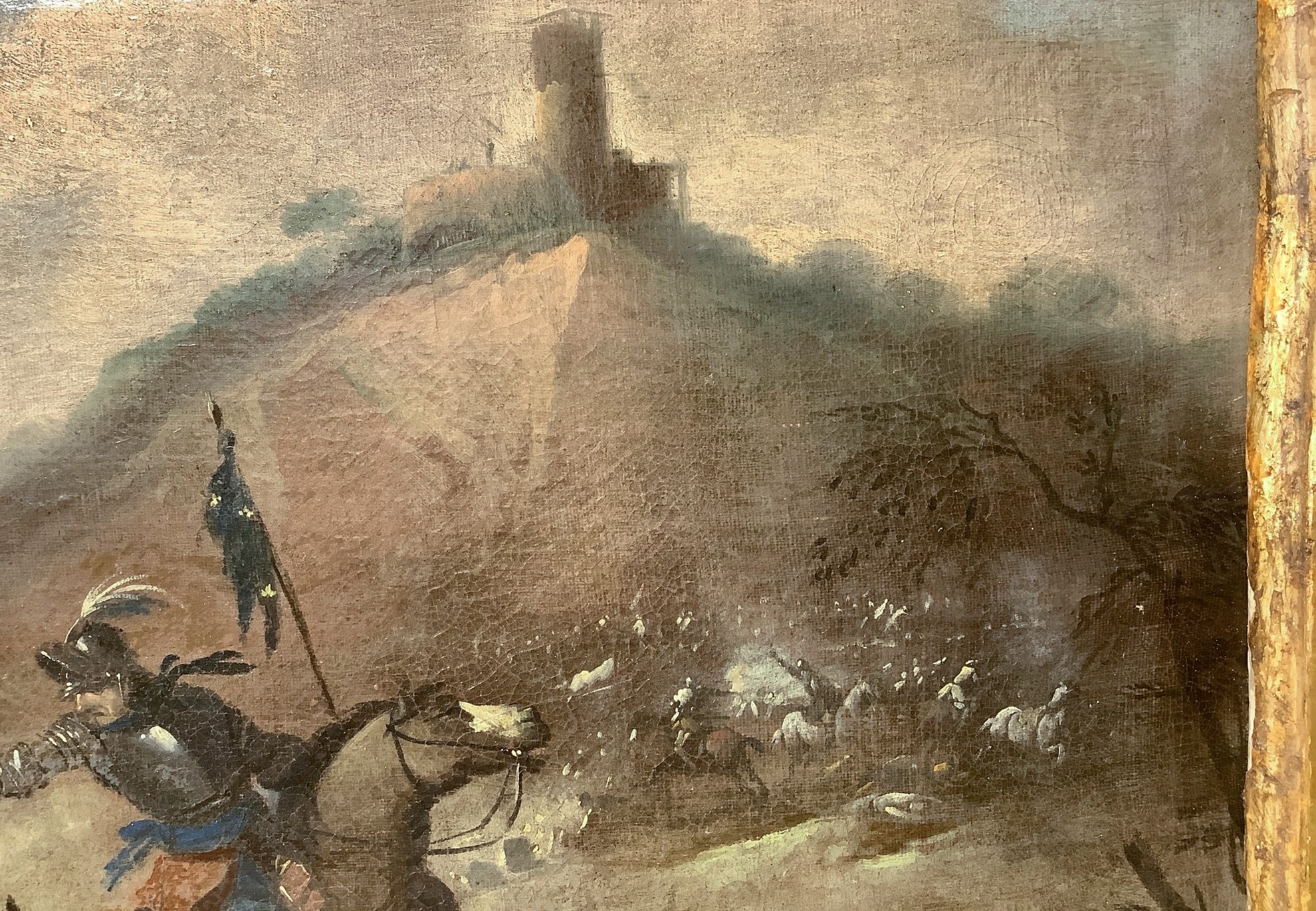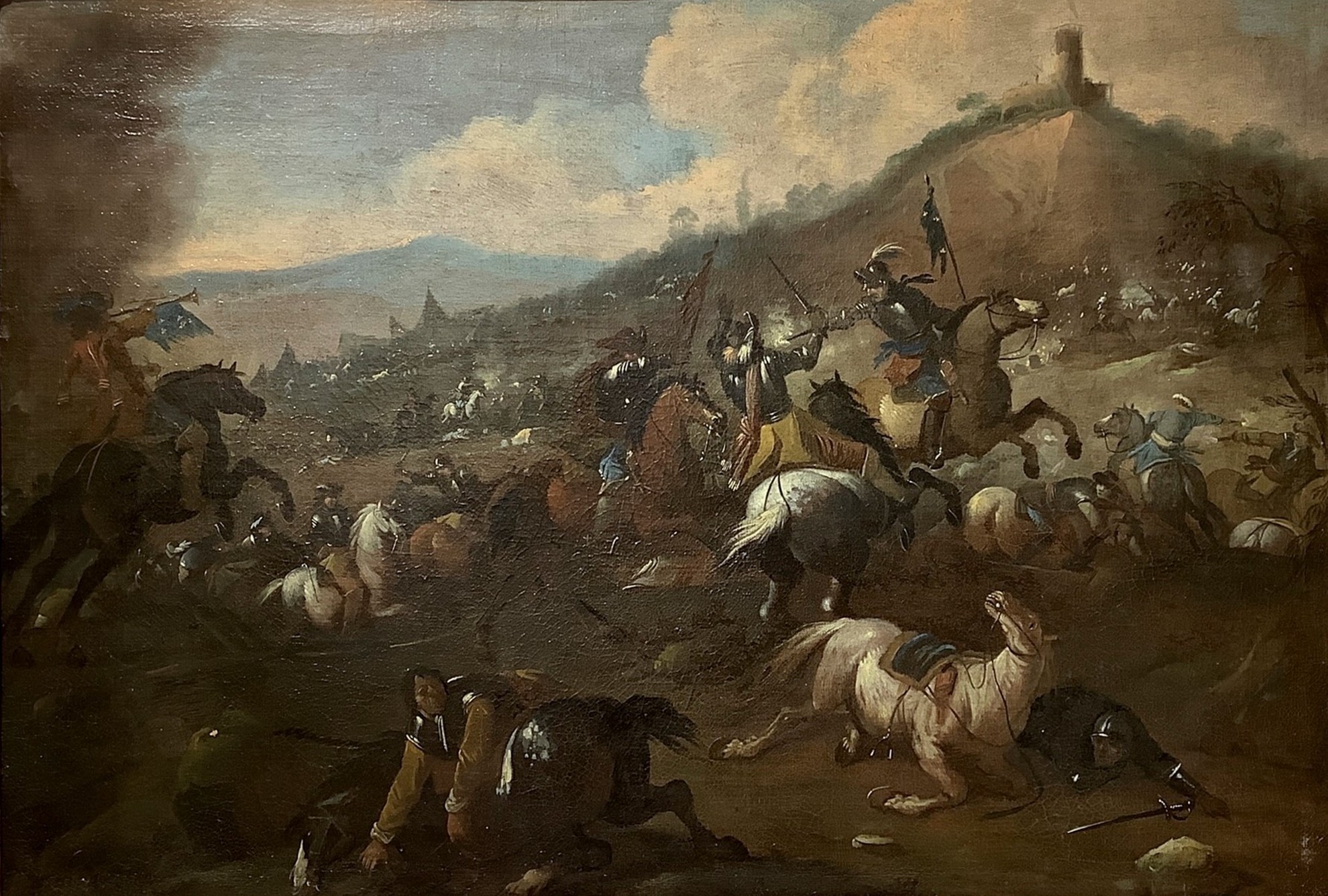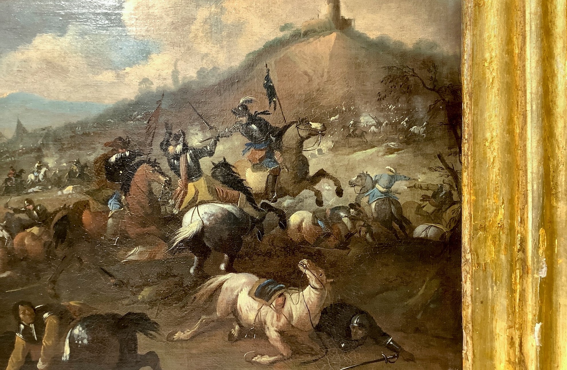 "Sulla destra uno scontro ravvicinato di tre cavalieri, di cui uno di spalle con cappello piumto e spada protesa in avanti su destriero grigio pomellato, viene colpito a bruciapelo dalla pistola di un suo avversario con corazza, elmo piumato e brache azzurre. In primo piano un cavallo bianco giace per terra, essendo il suo cavaliere stato sbalzato di sella; un altro anch'egli appiedato e ferito cerca scampo allontanandosi dalla mischia. Sul lato sinistro, sotto una nuvola di polvere, irrompe sulla scena un trombettiere con drappo azzurro, su cavallo nero. L'epicentro della battaglia è rappresentato in un metro espositivo ridotto in una vallata, ai piedi di un declivio roccioso sormontato da un torrione tondo isolato."