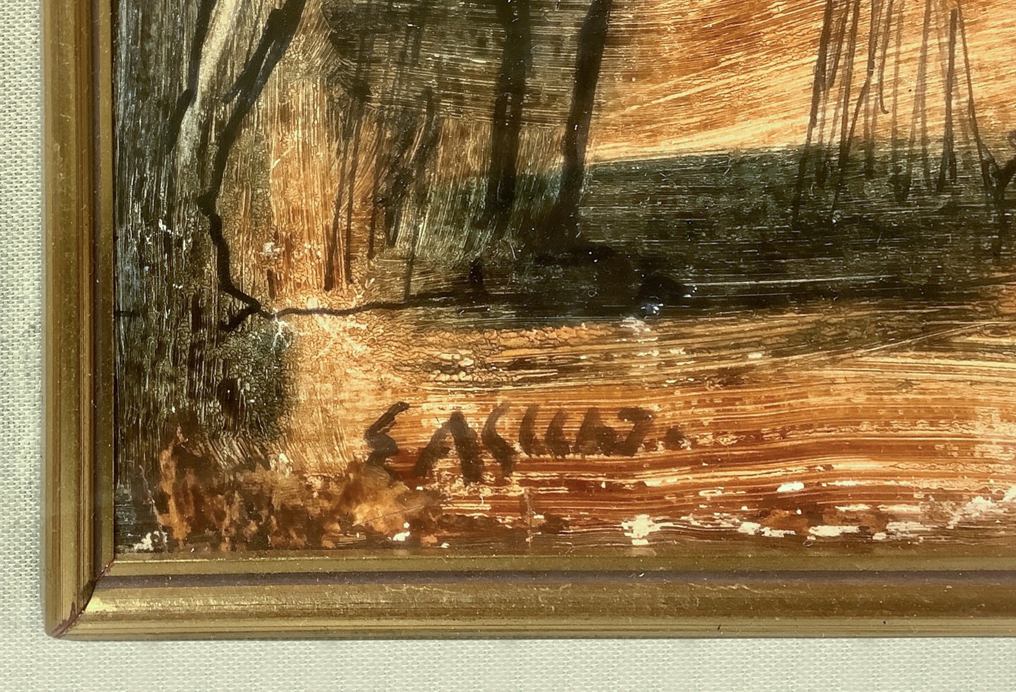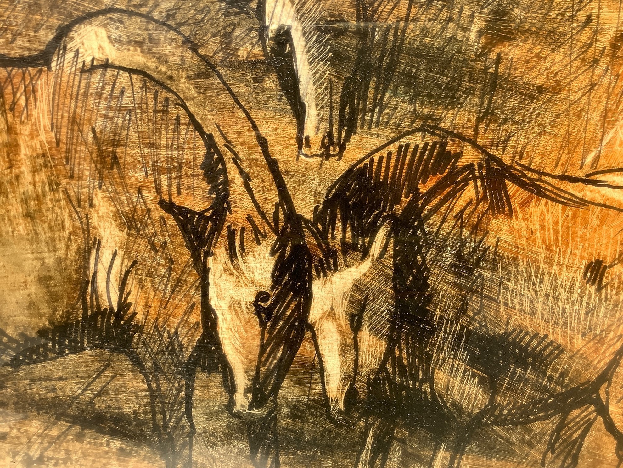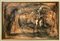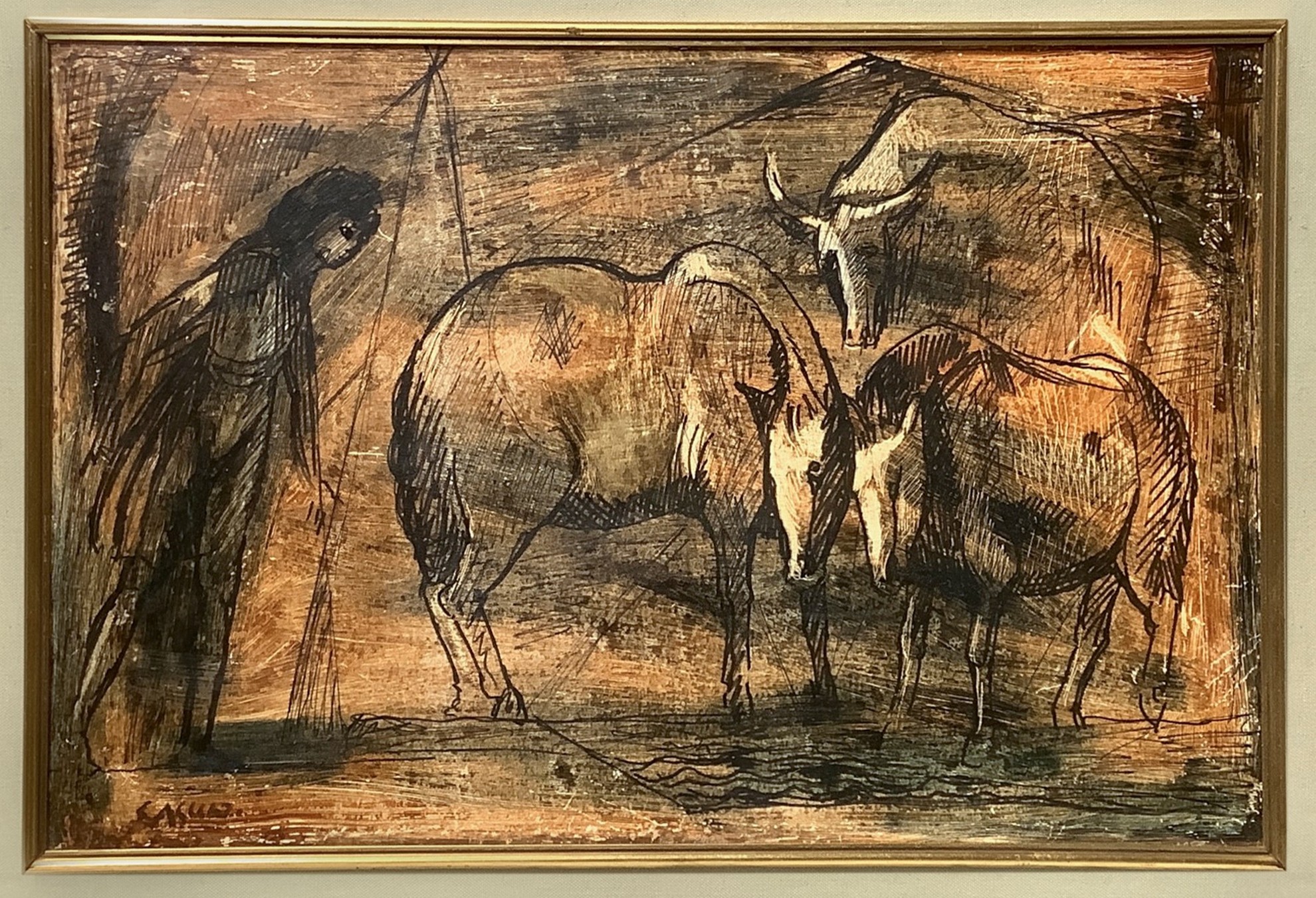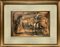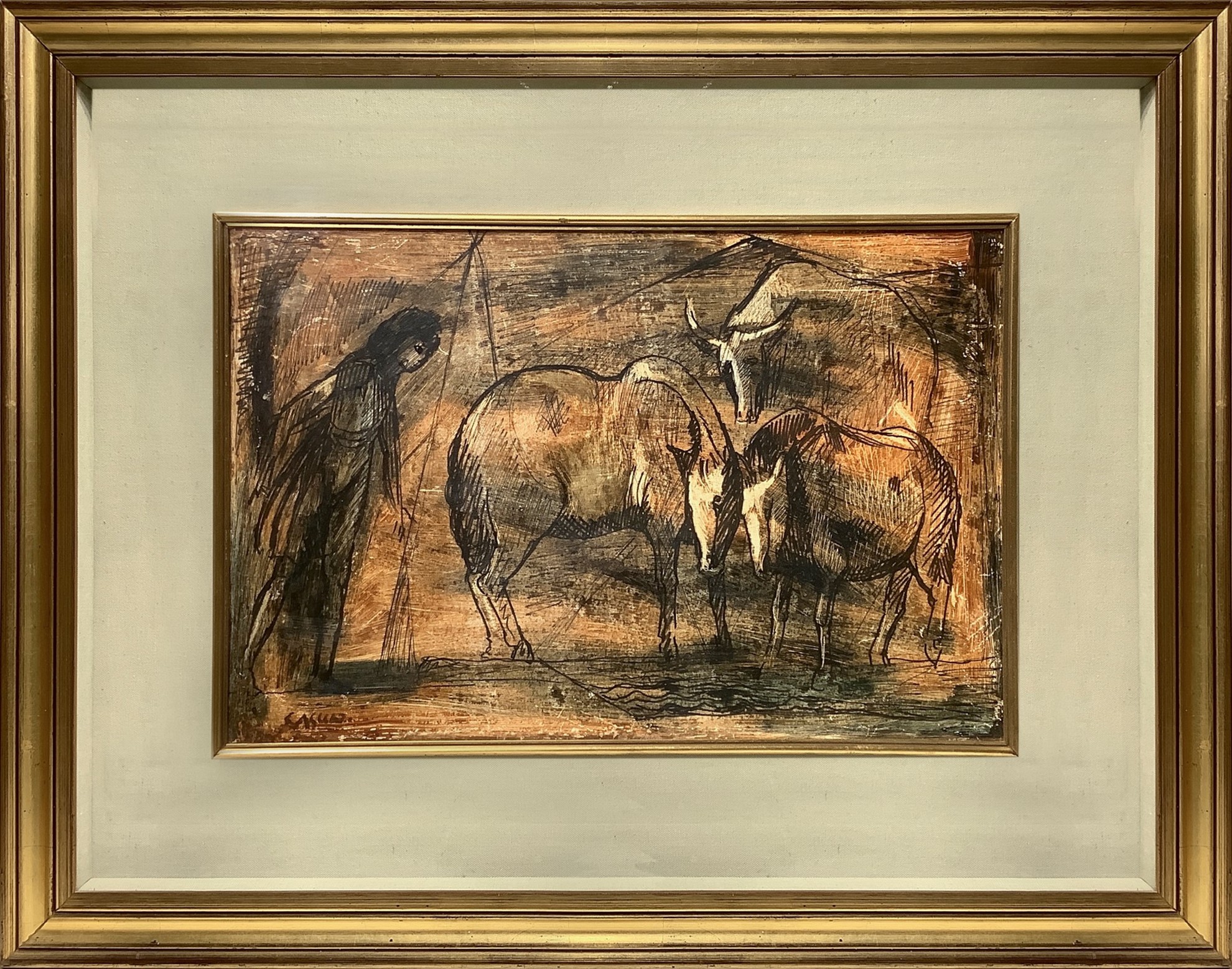 39x57 cm, in cornice 62x88 cm Donna con animali Tecnica mista La traccia decisa, il segno nervoso che modella le immagini nella composizione, rivelano il profilo artistico di Cagli, formatosi presso l’Accademia di Belle Arti di Roma e già attivo, in qualità di illustratore, nella metà degli anni Venti. In un abbozzato paesaggio, lievemente accennate da geometriche linee, una donna si protende in avanti impaurendo le docili bestie, illustrate con una cifra stilistica che dimostra il possesso di un disegno sicuro e poderoso.