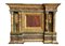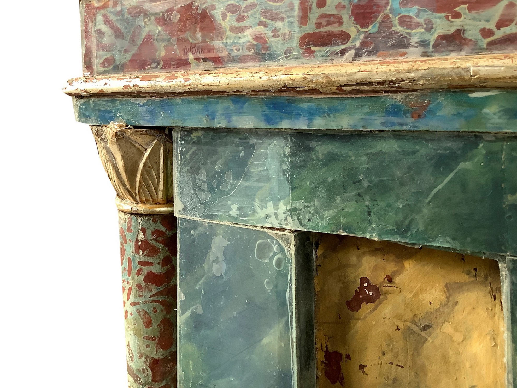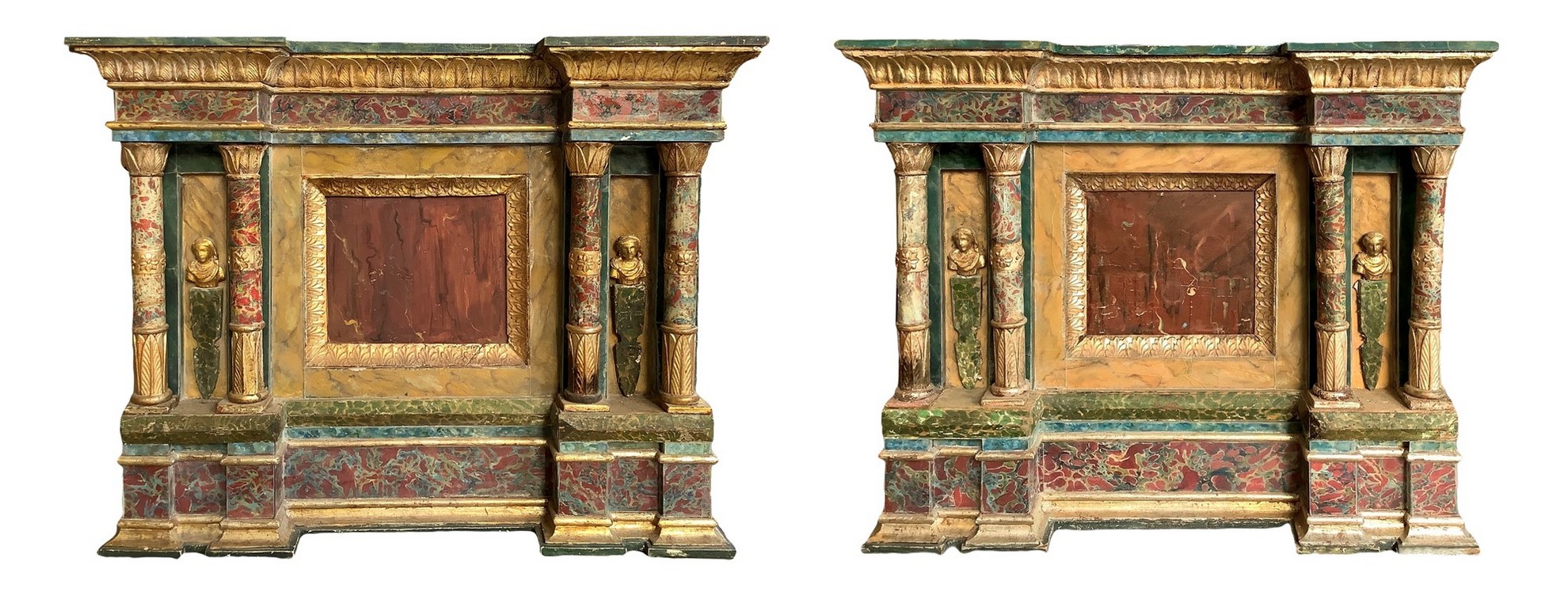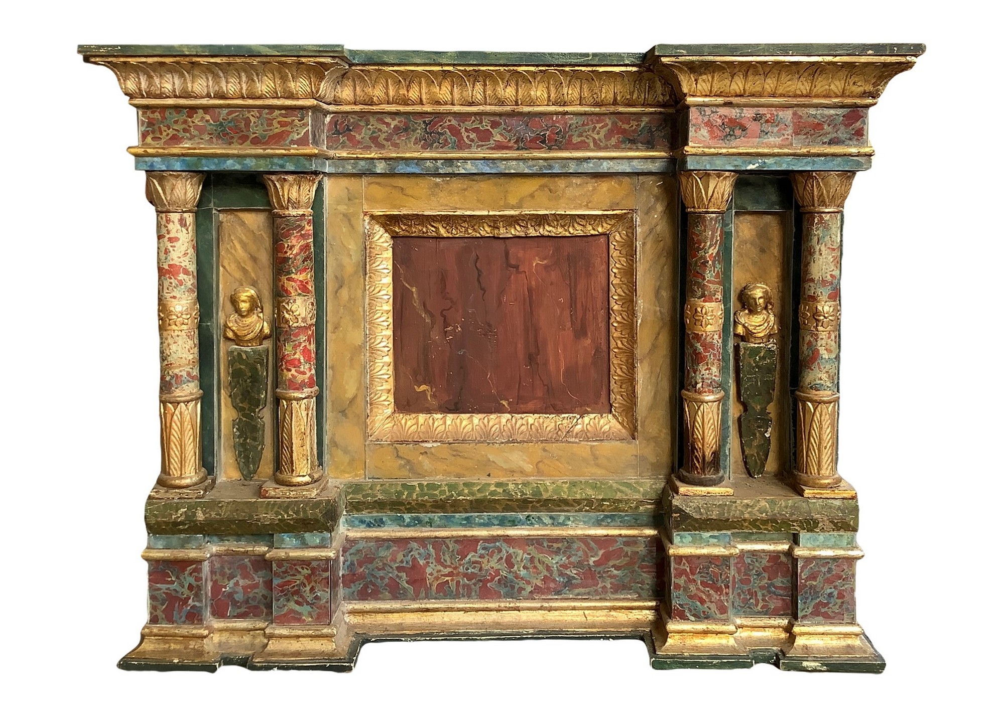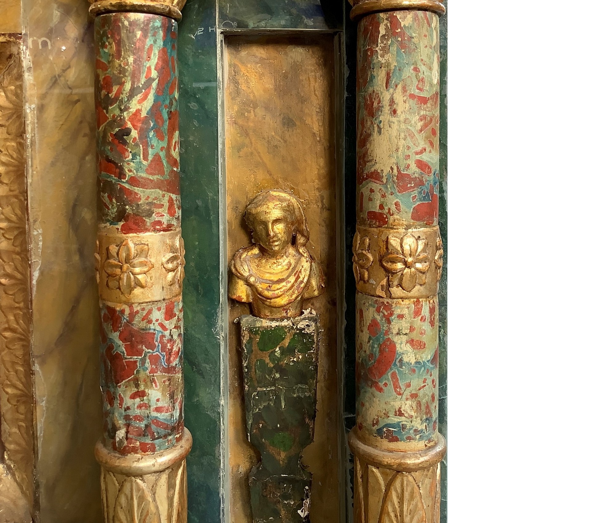 90x112x38 cm XIX secolo Coppia di mobili bassi A console, laccati a finto marmo e dorati con coppia di colonne ai lati.
