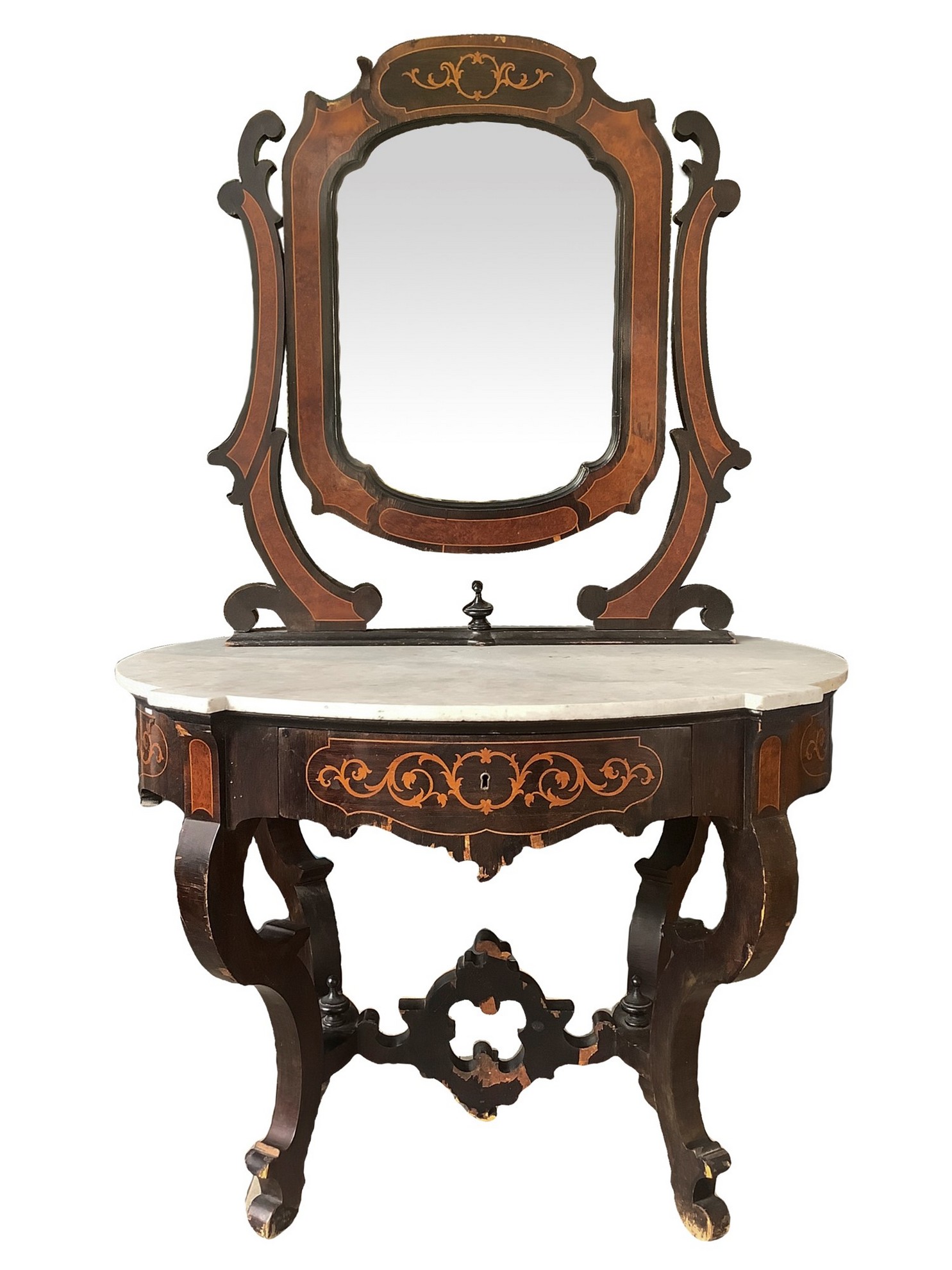 h 170 cm x l 107 cm Metà XIX secolo Tolettina da centro, in legno di palissandro con specchio basculante Piano bianco in marmo con cassetto centrale. Intarsi in legno d'arancio. Provenienza Sicilia. Caduta di piccole parti di impiallacciatura.