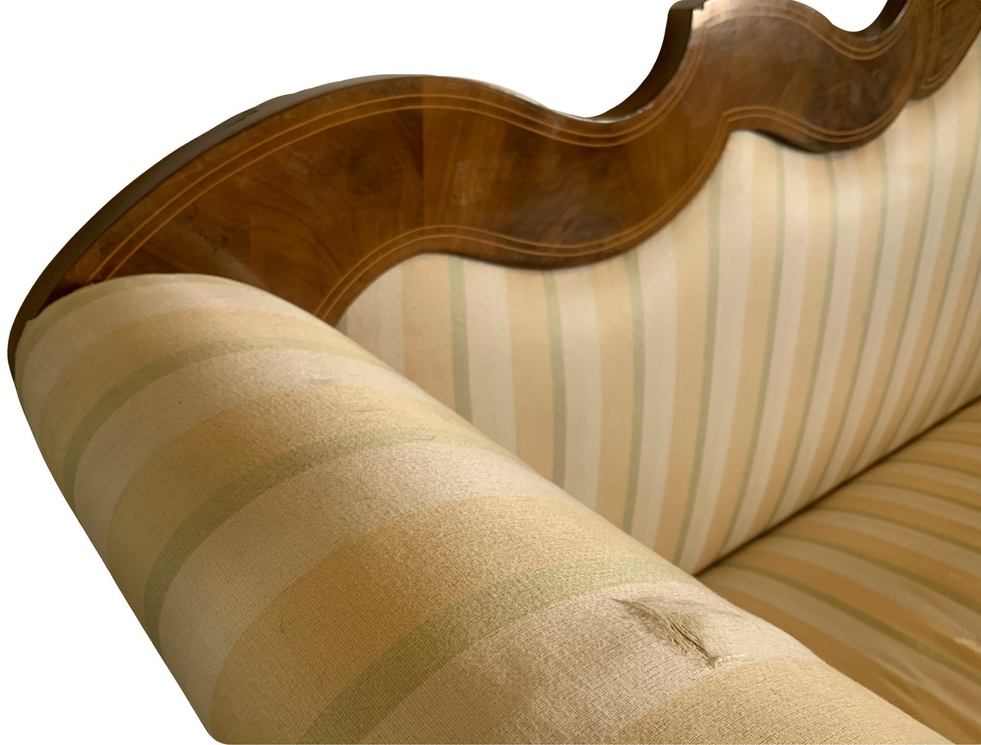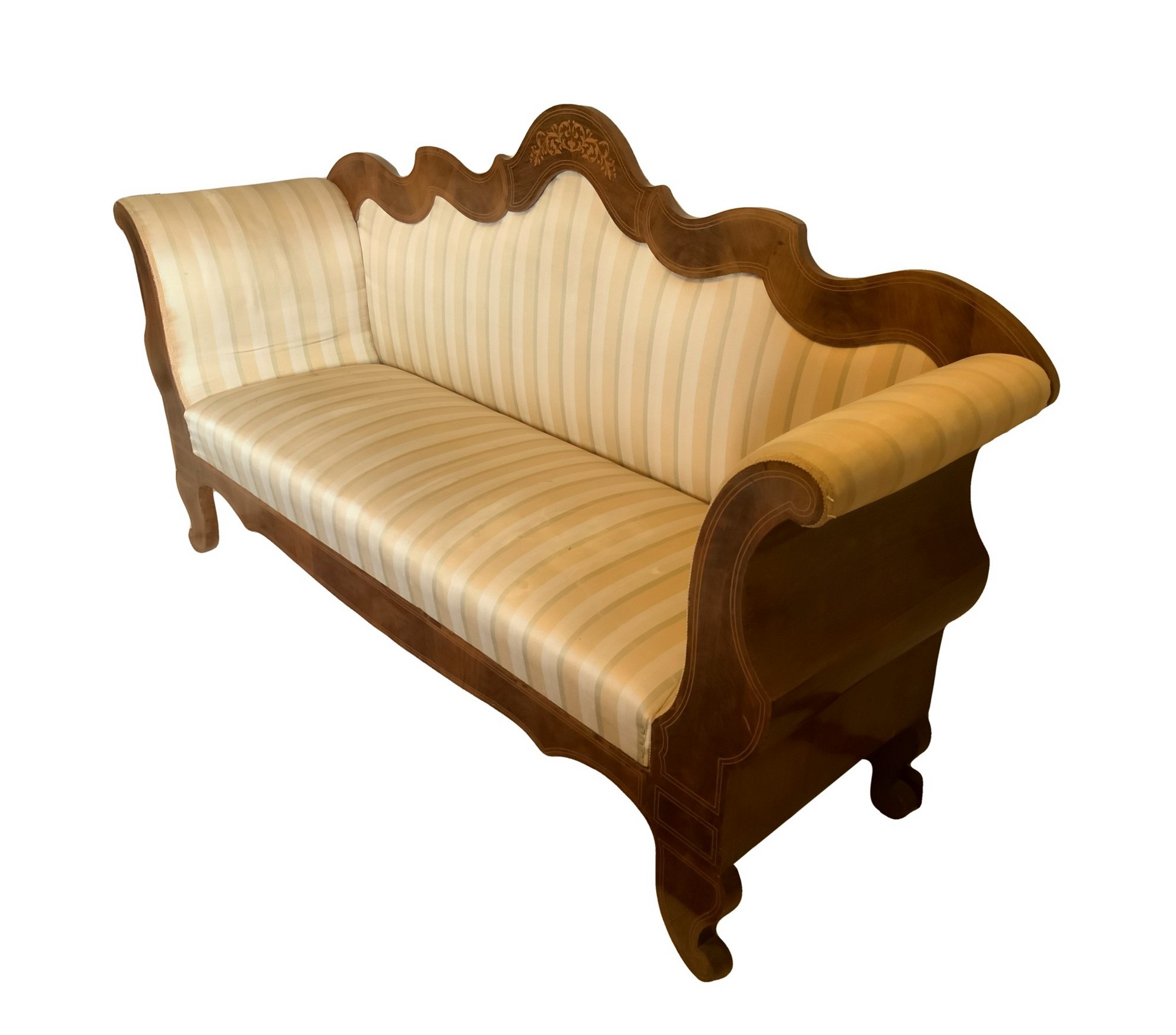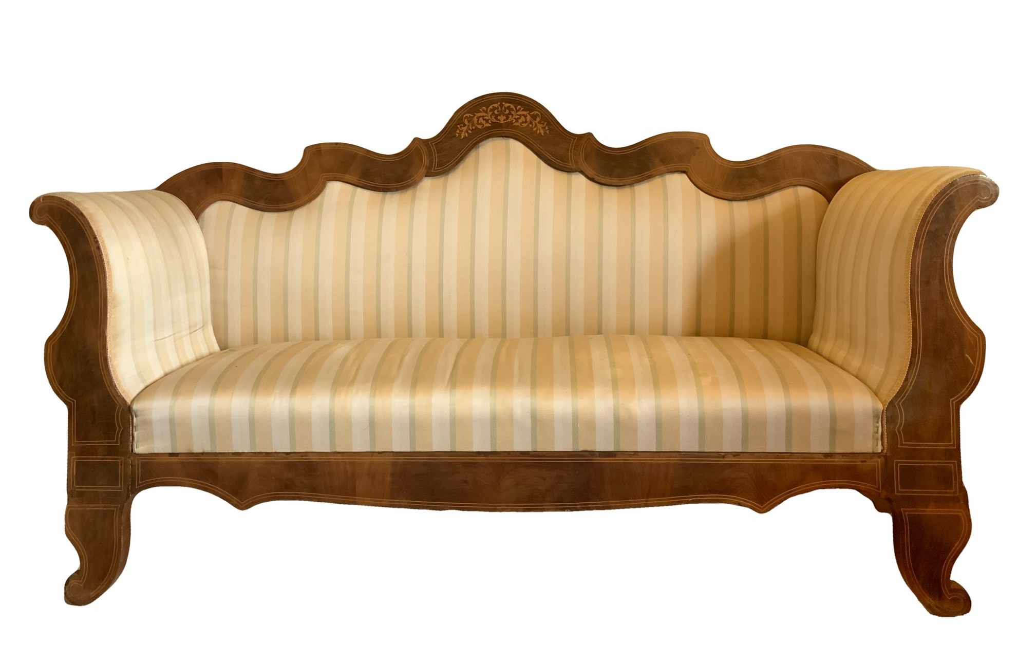 H 90 cm, larghezza 215 cm, profondità 57 cm Metà del XIX secolo DivanoIntarsi in legno chiari alla spalliera e perfilato sul fronte e sul bracciolo. Provenienza Sicilia.