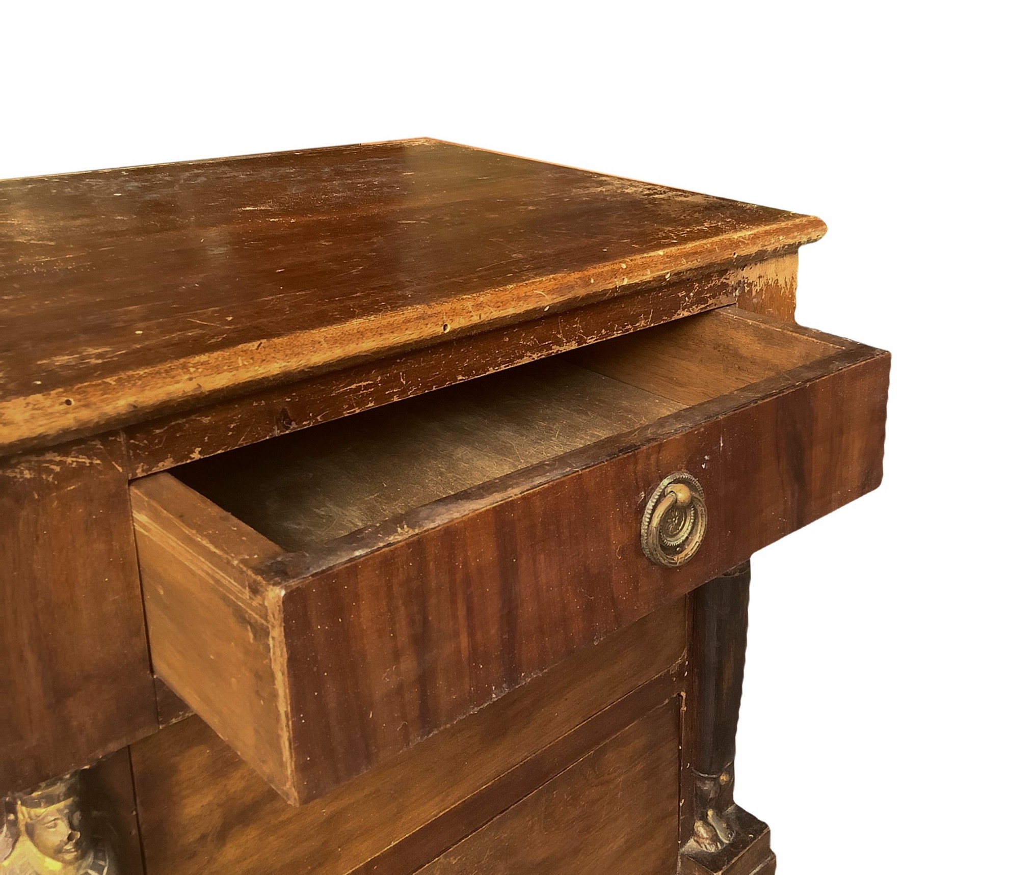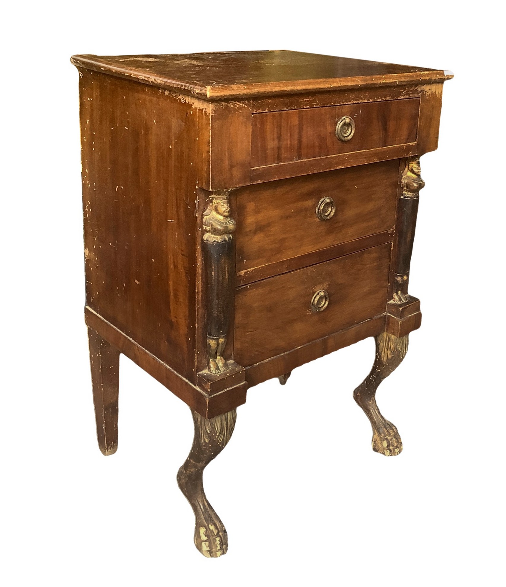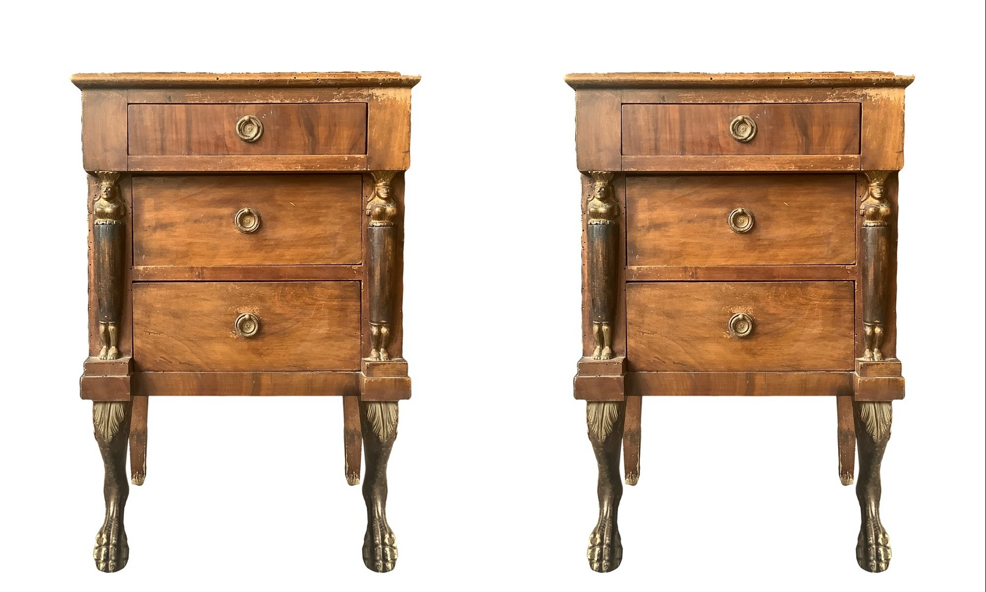 h 69 x 47 cm XIX secolo Coppia di comodini impero, in legno di mogano Tre cassetti, piedi caprini e colonne applicate ai lati, con testa e piedi di sfinge. Provenienza Sicilia. Da effettuare piccoli restauri.