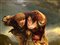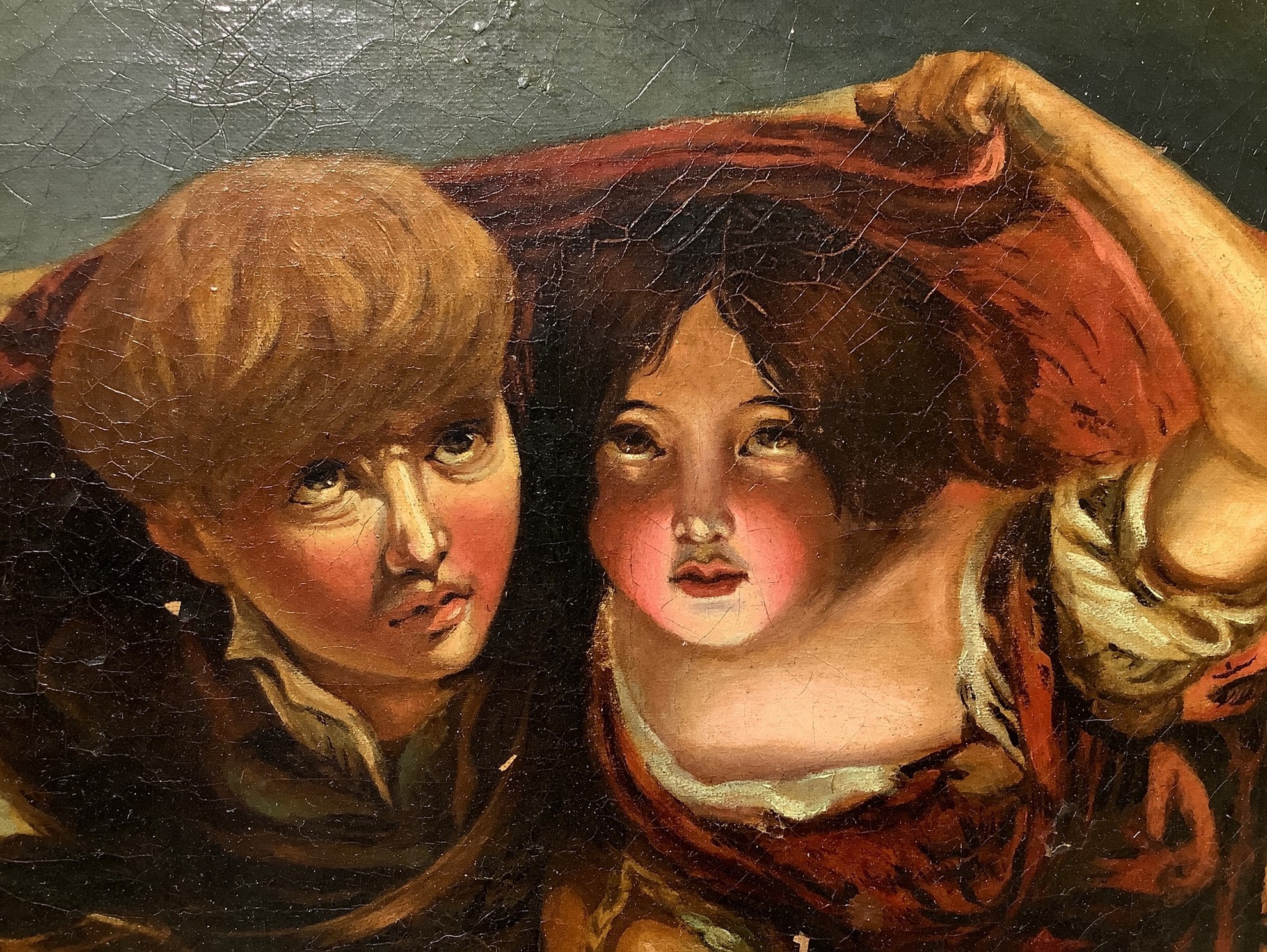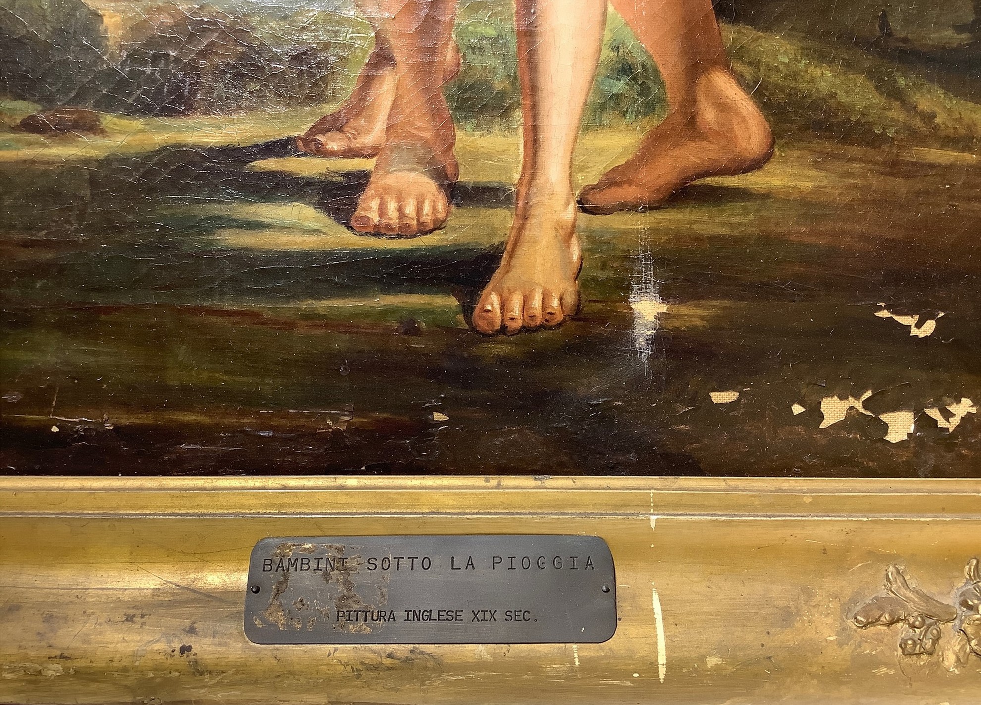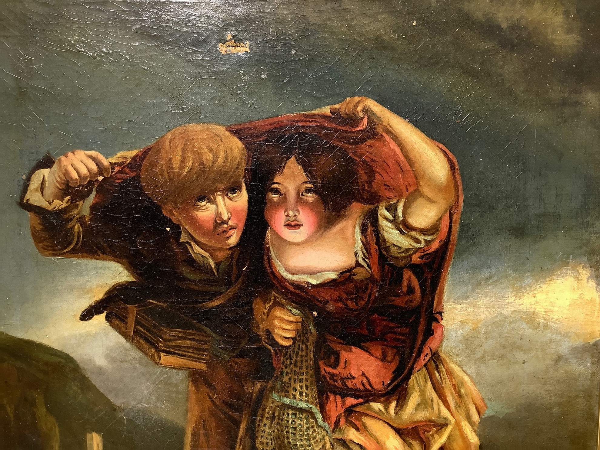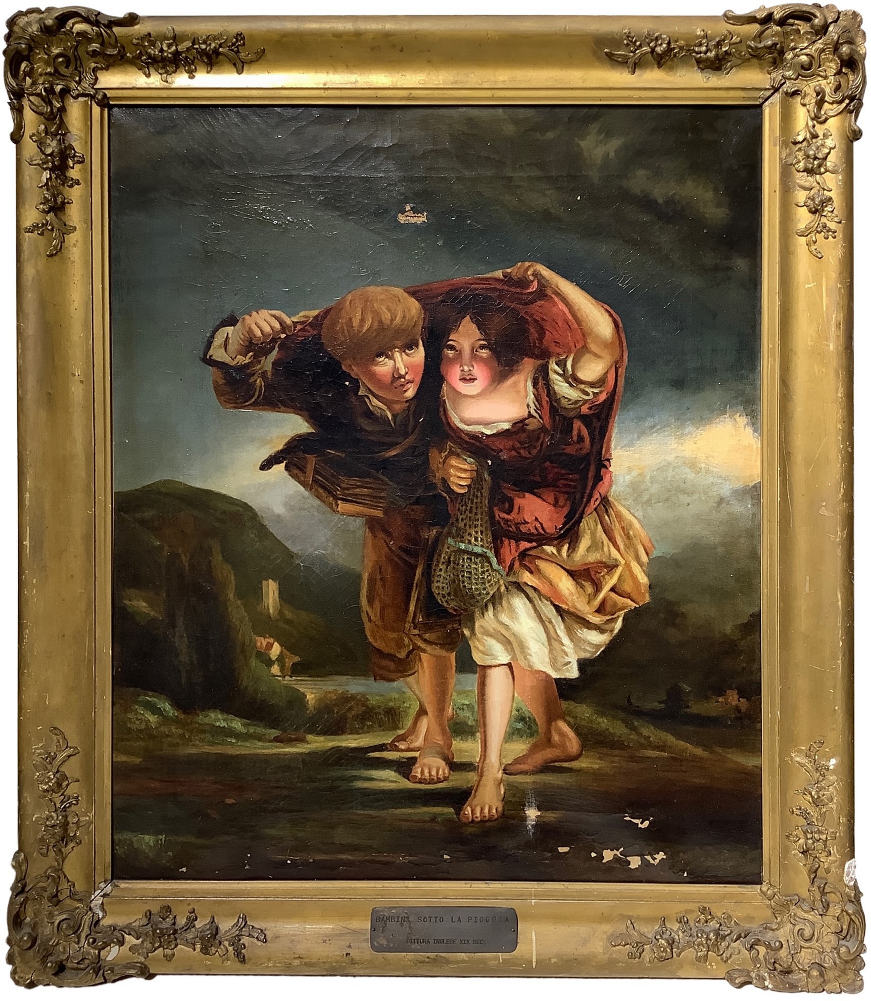h 60x49 cm, in cornice h 72x62 cm XIX secolo Due bambini sotto la pioggia Dipinto a olio su tela Pittore inglese del XIX secolo. In alto e in basso piccola caduta di colore.