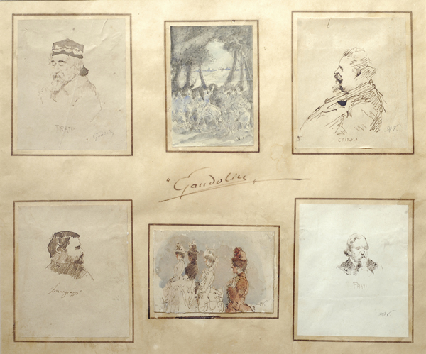 Anonimo del XIX sec. QUATTRO CARICATURE E DUE STUDI PER COMPOSIZIONI China; China e acquerello, cm. 12x10 (le quattro caricature); cm. 8x11(i due studi) Sei opere incorniciate in un’unica composizione, quattro fogli sono siglati: “A.V.”
