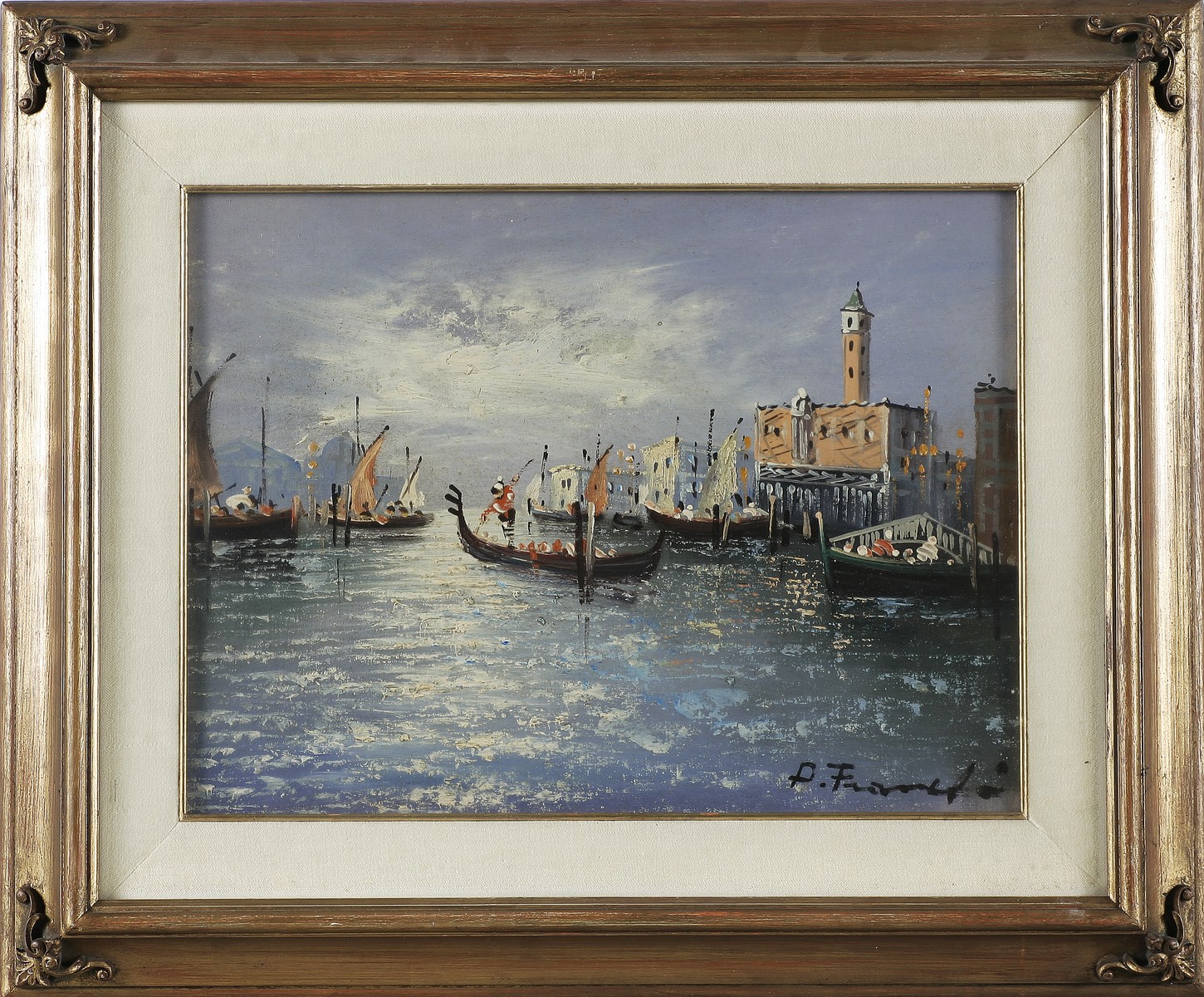 ANONIMO Gondole nella laguna. Olio su tavola. Cm 40,00 x 30,00. Firmato P. Franchi in basso a destra. Cornice presente
