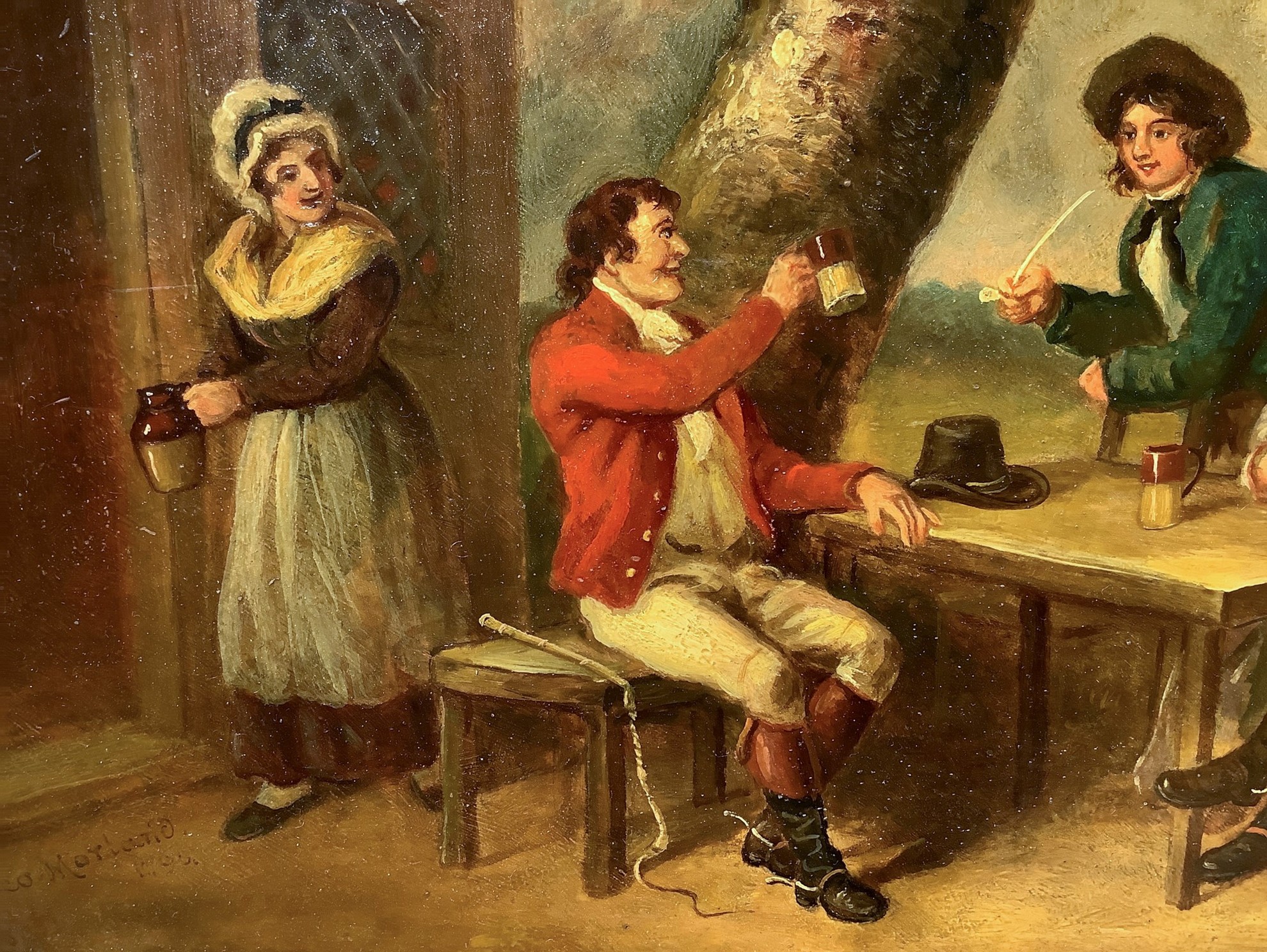 31x41 cm, in cornice 52x62 cm Personaggi al tavolo in una locanda all'aperto Dipinto a olio su tavola