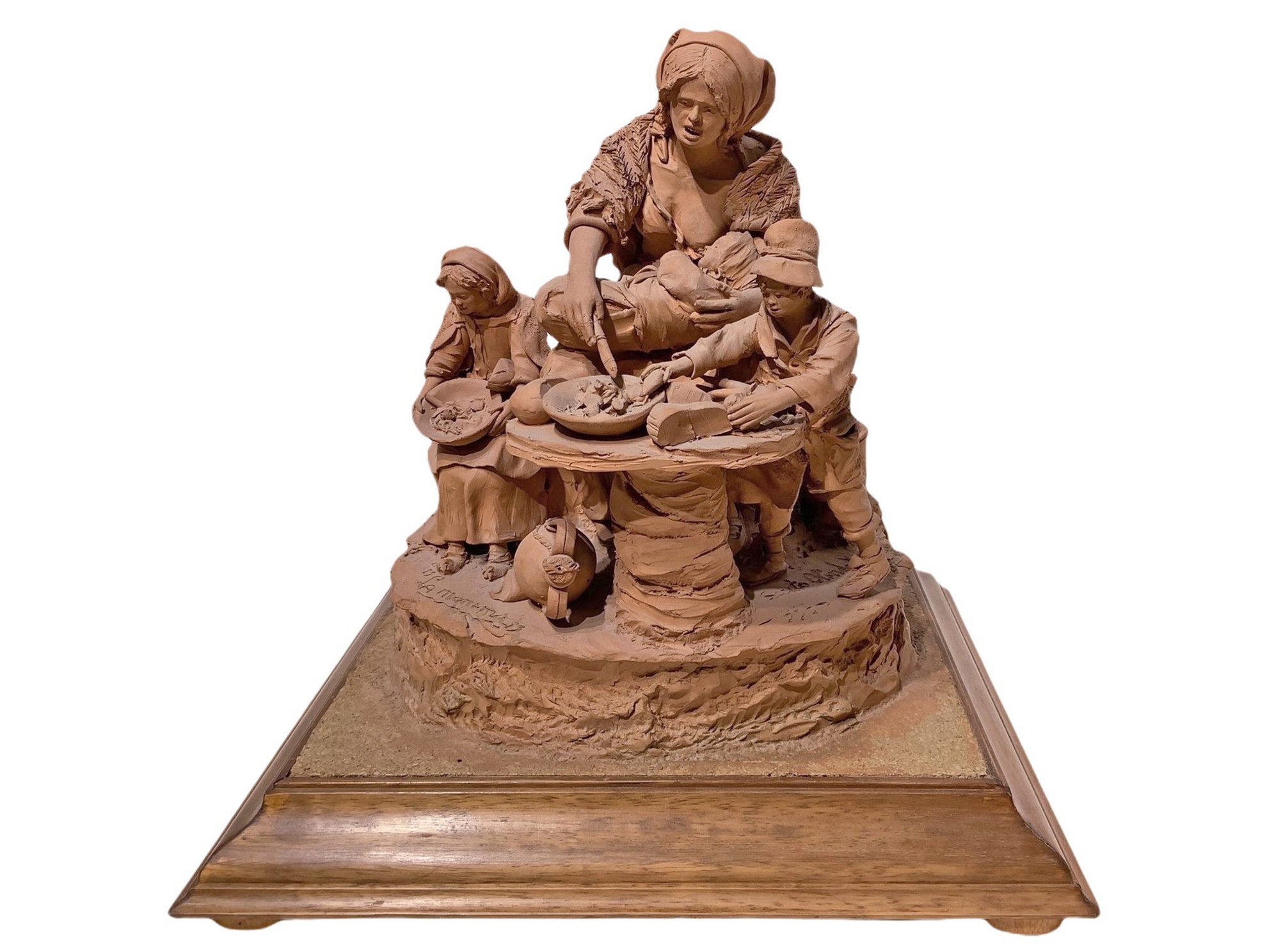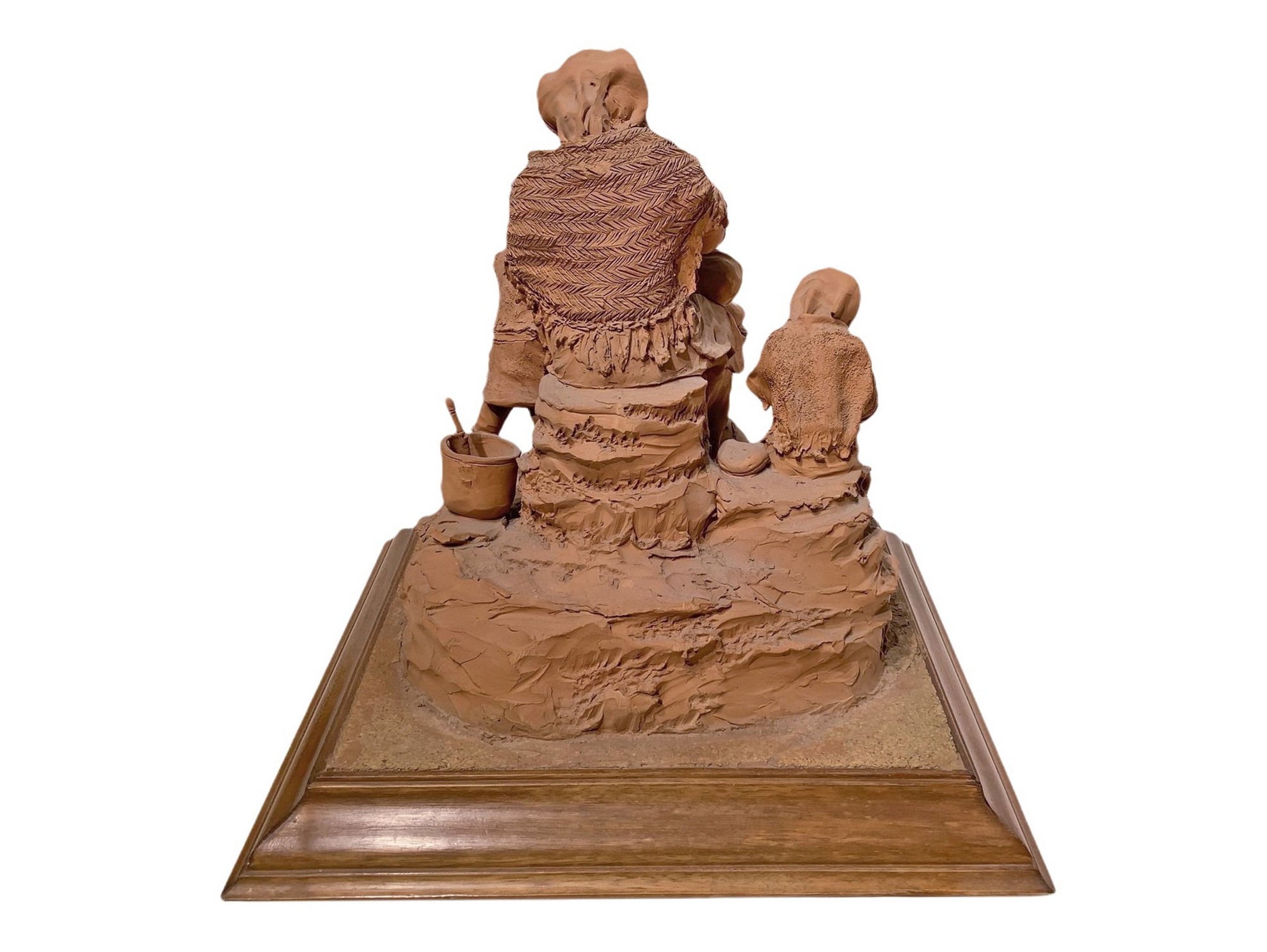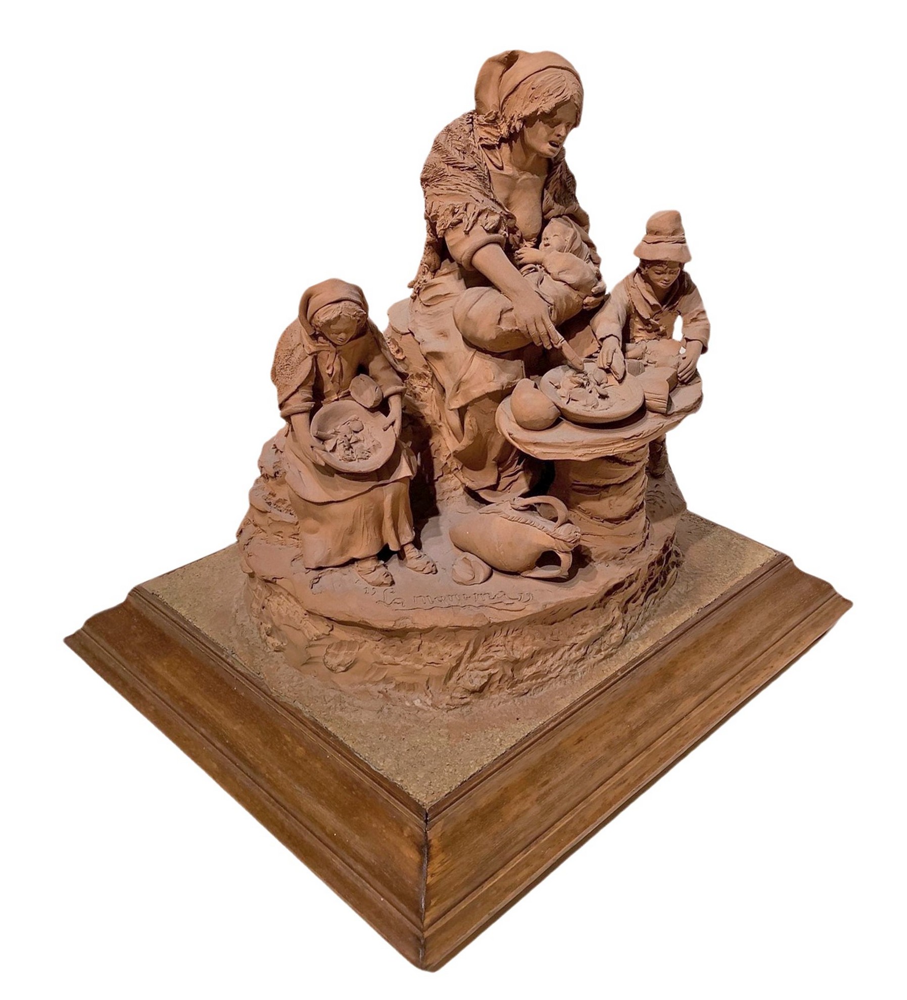 h 38 cm, b 39x34 cm 1993 Scena familiare, mamma con tre figli Scultura in terracotta con base in legno. Firmata Olindo Scuto Vaccaro, Caltagirone, 1993