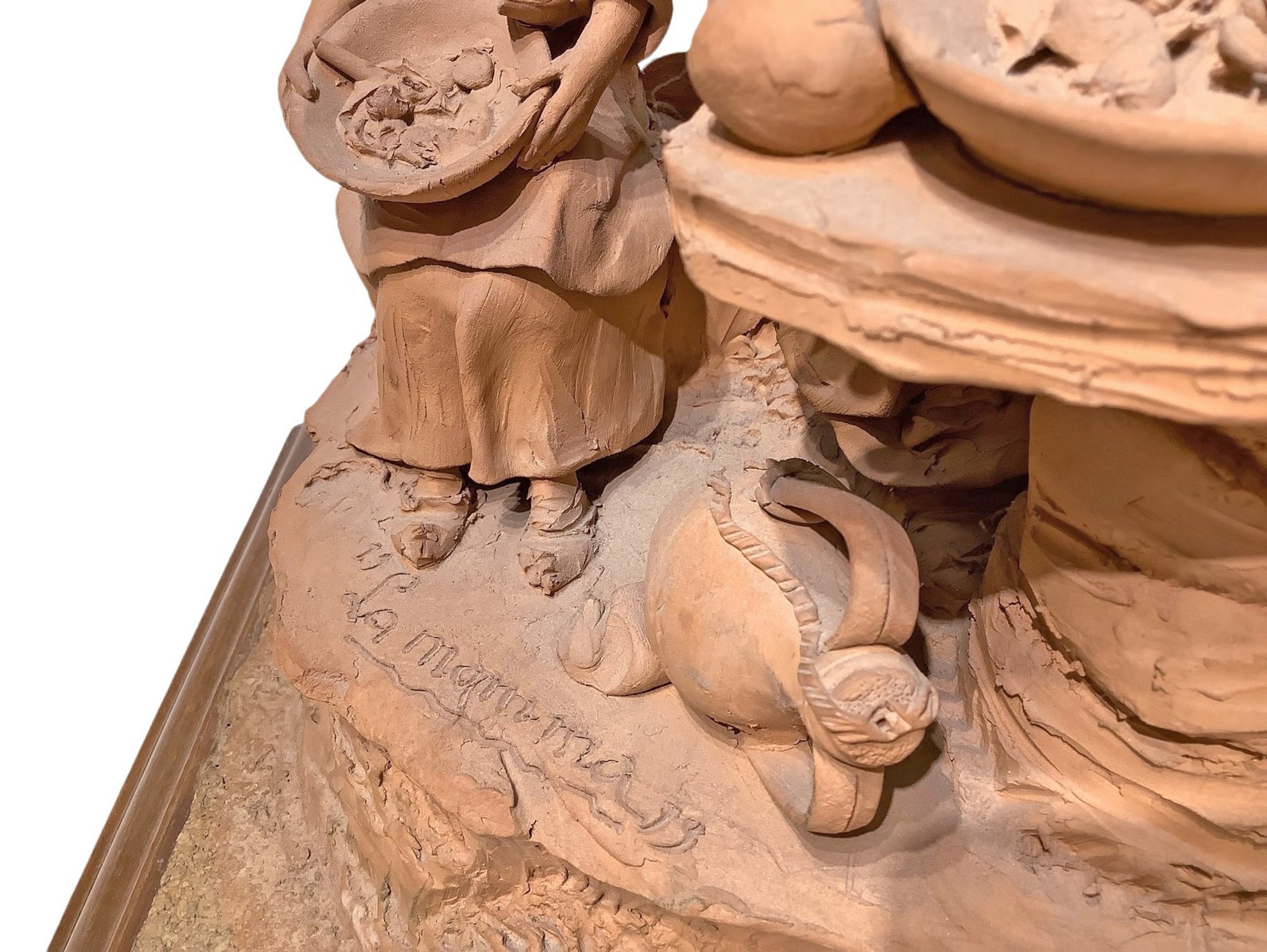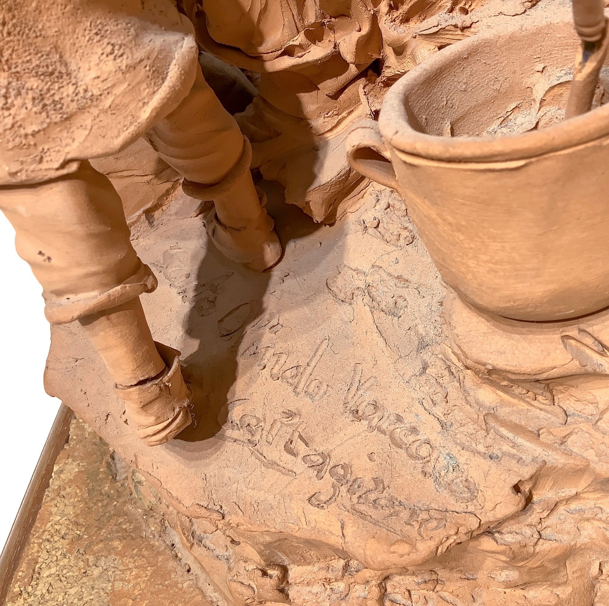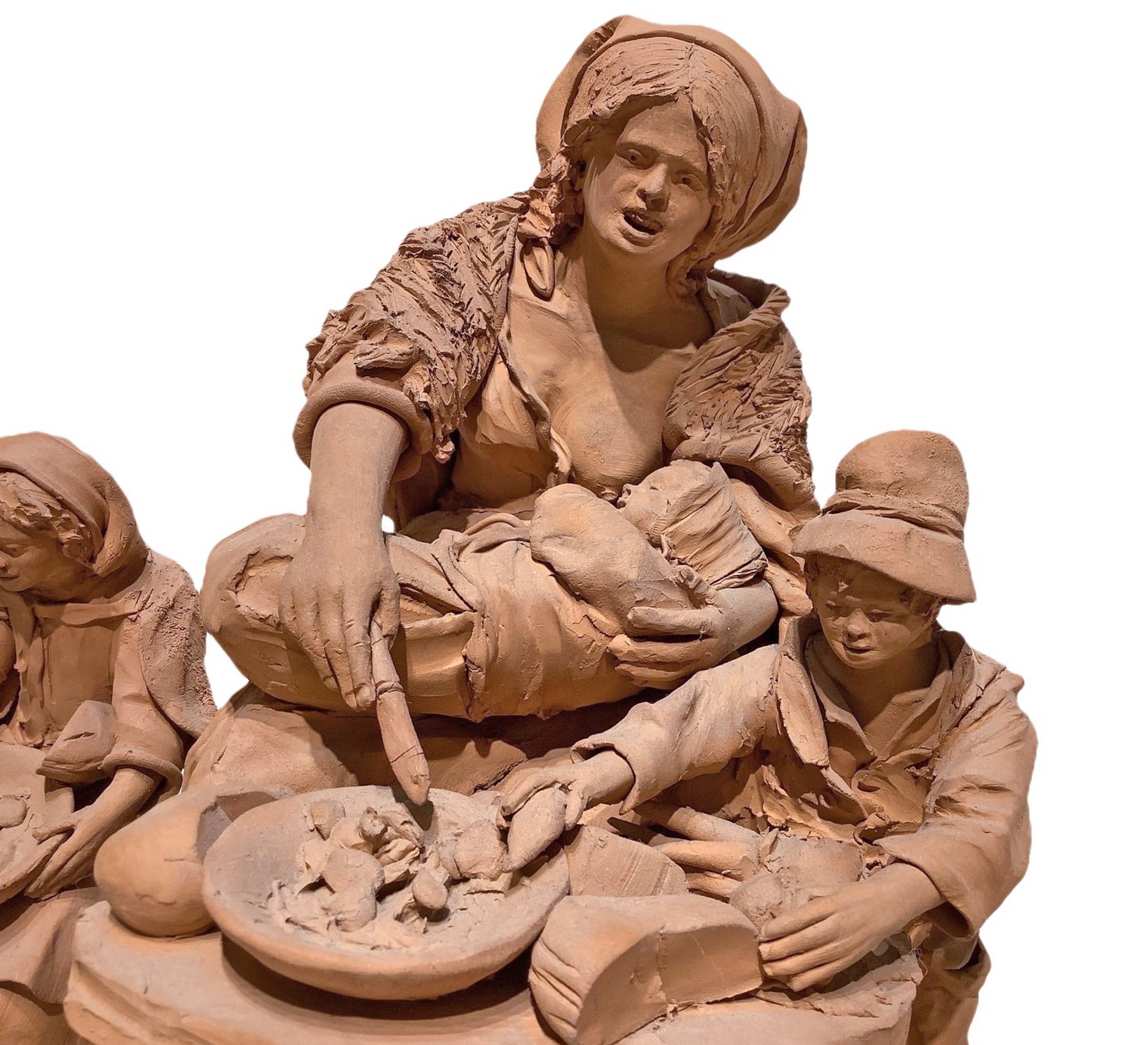 h 38 cm, b 39x34 cm 1993 Scena familiare, mamma con tre figli Scultura in terracotta con base in legno. Firmata Olindo Scuto Vaccaro, Caltagirone, 1993