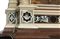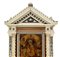 H 64 cm, larghezza 34 cm, profondità 10 1879 Piccola edicola/ancona in legno, avorio e madreperla Legno, avorio e madreperla All'interno mosaico ligneo in scala assonometrica in legno raffigurante Madonna in trono con bambino e San Giovannino. Firmata sul retro Alessandro Monteneri di Perugia e datata 1879.