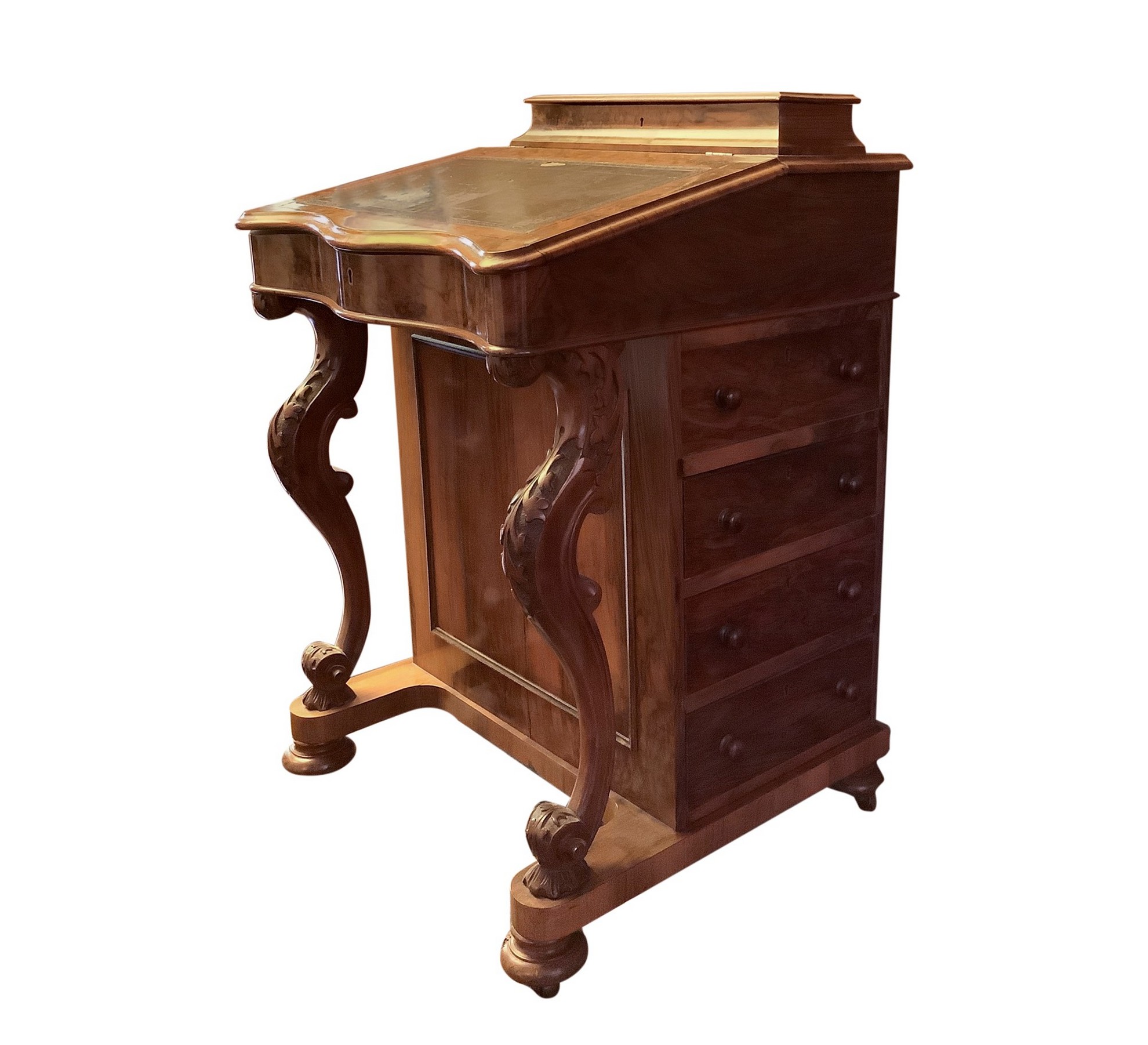 H cm 85x55x55 Mobile Davenport in legno e radica di noce 4 cassetti laterali, piedi a cabriol con foglie d'acanto intagliate. Base a cipolla schiacciate.