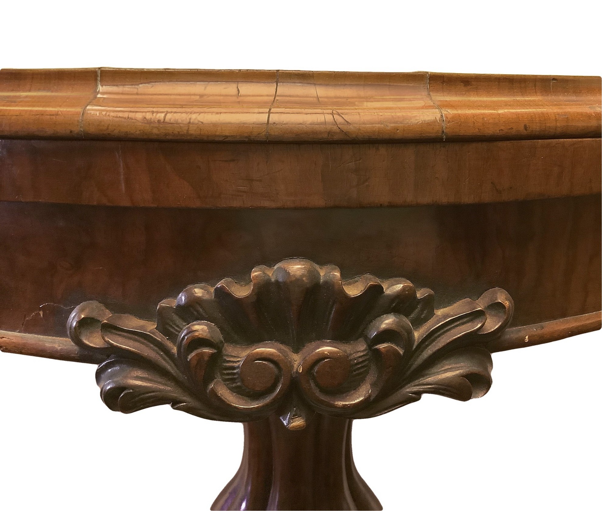 H cm 72x90x45 Tavolo da gioco con piano in radica, piedi a quattro razze con sostegno baccellato Piano apribile a cerchio sagomato. Piccoli difetti.