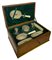 Set da toilette in argento 800 In elegante scatola di legno. Composto da 8 pezzi: 3 spazzole, 1 specchio, 1 pettine, 3 bottiglie da profumo.