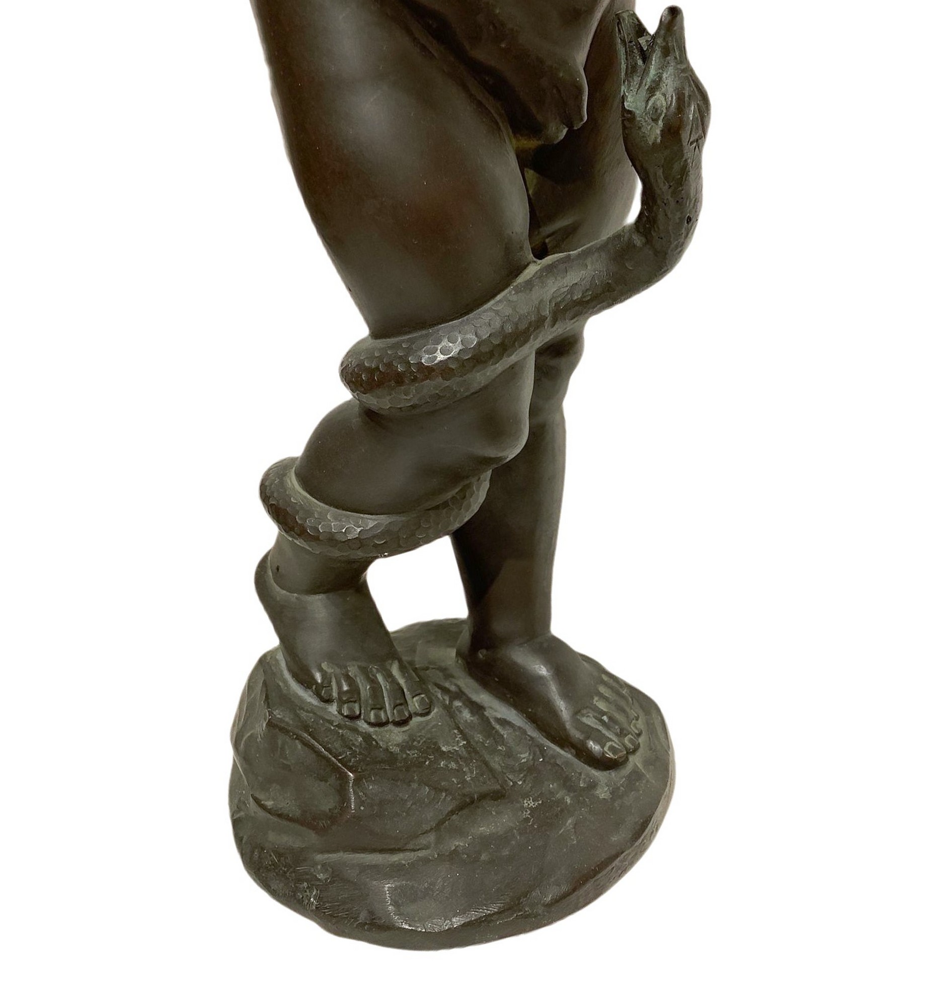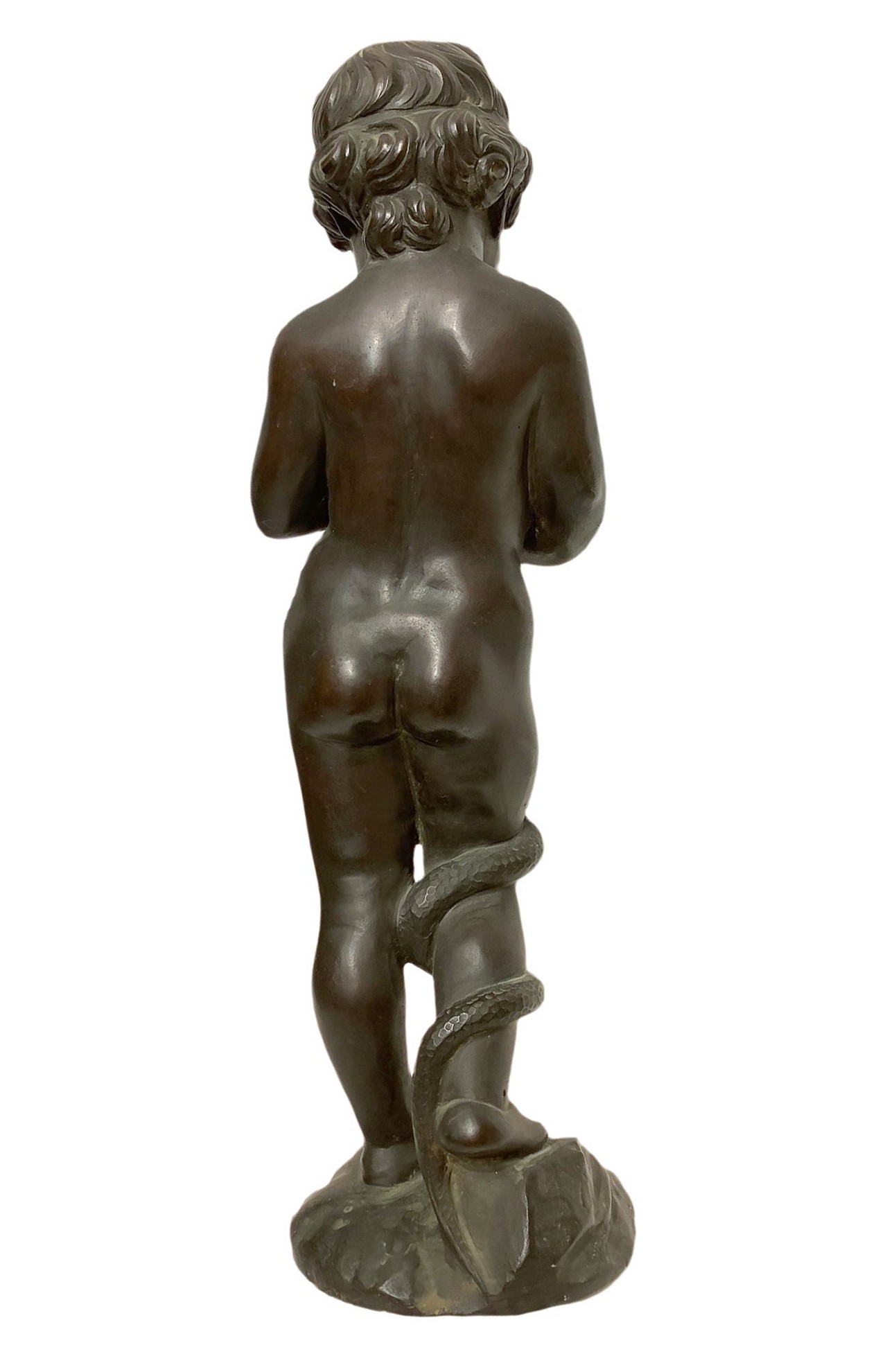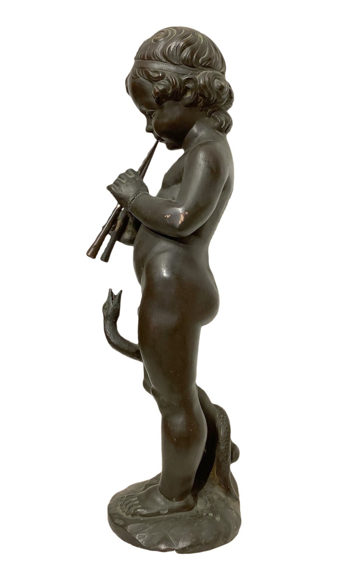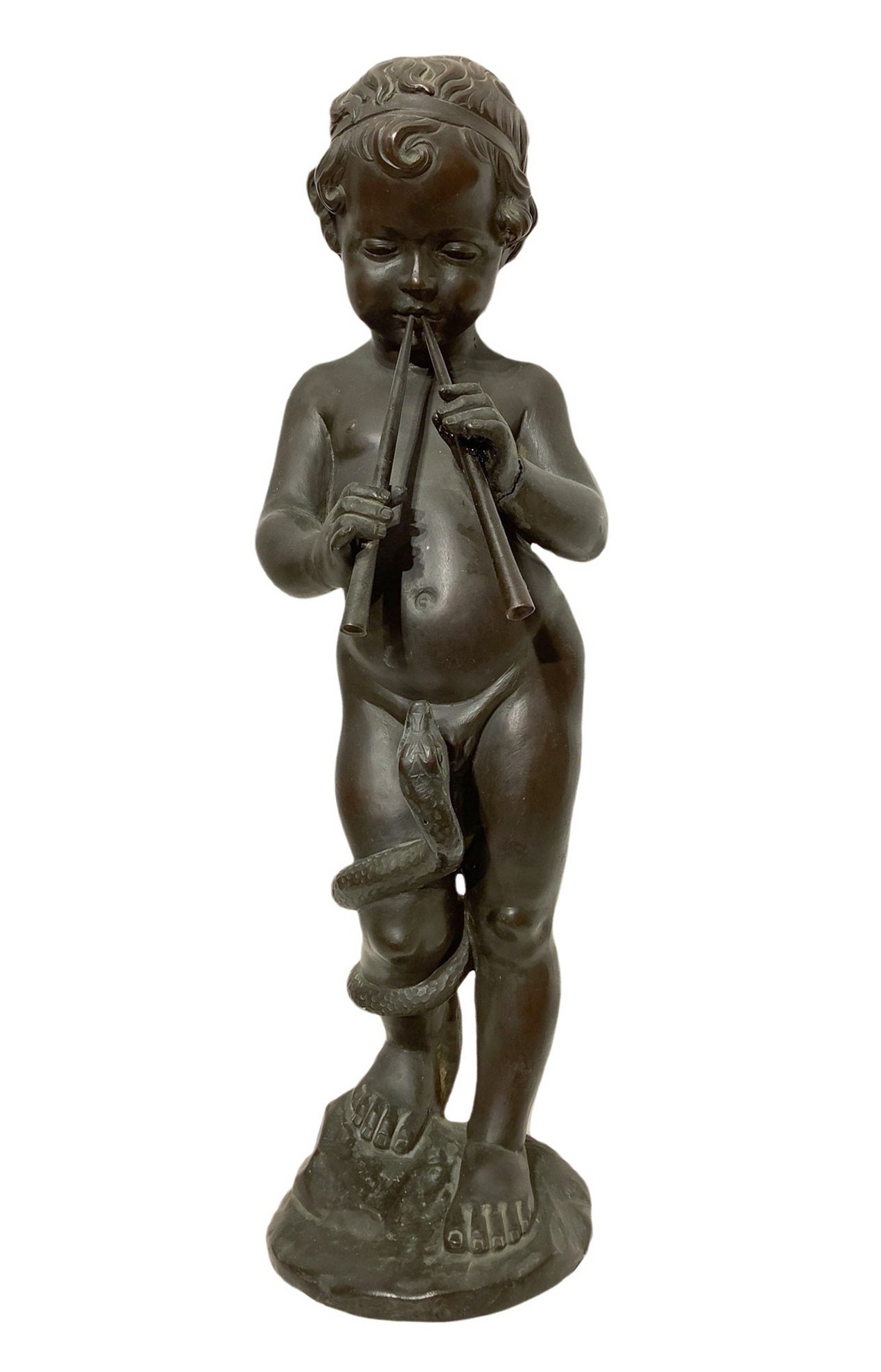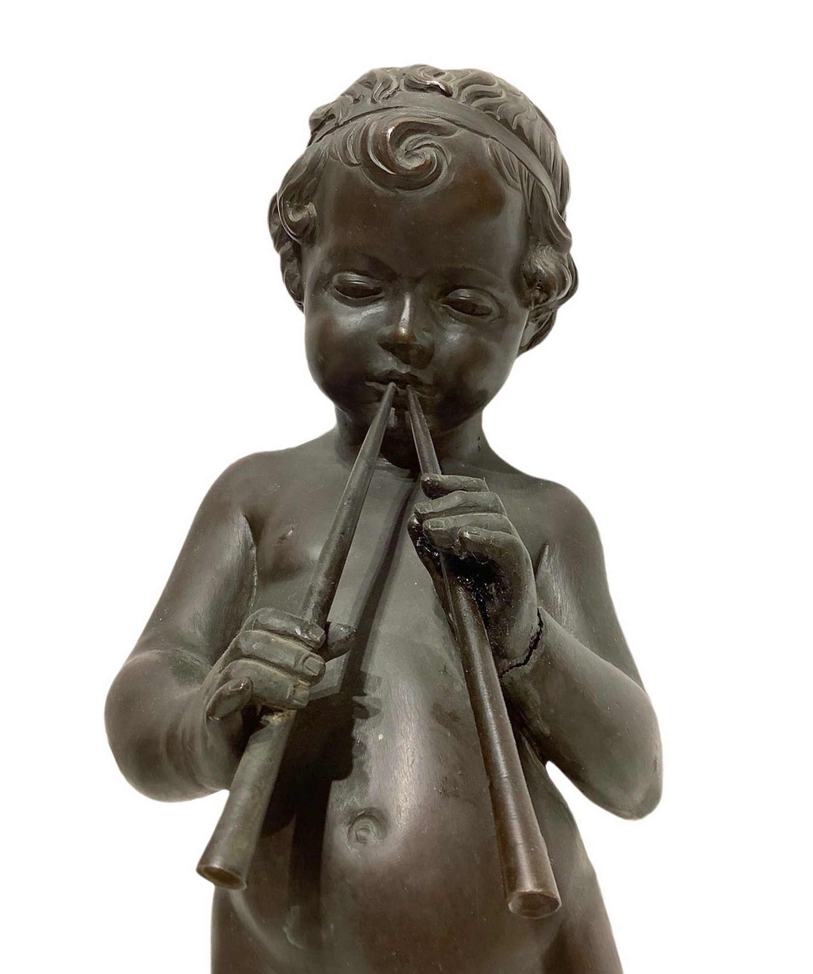 H cm 41 Bronzo raffigurante Bambino con strumento a fiato Inizi XX secolo Piccola lineatura sulla mano