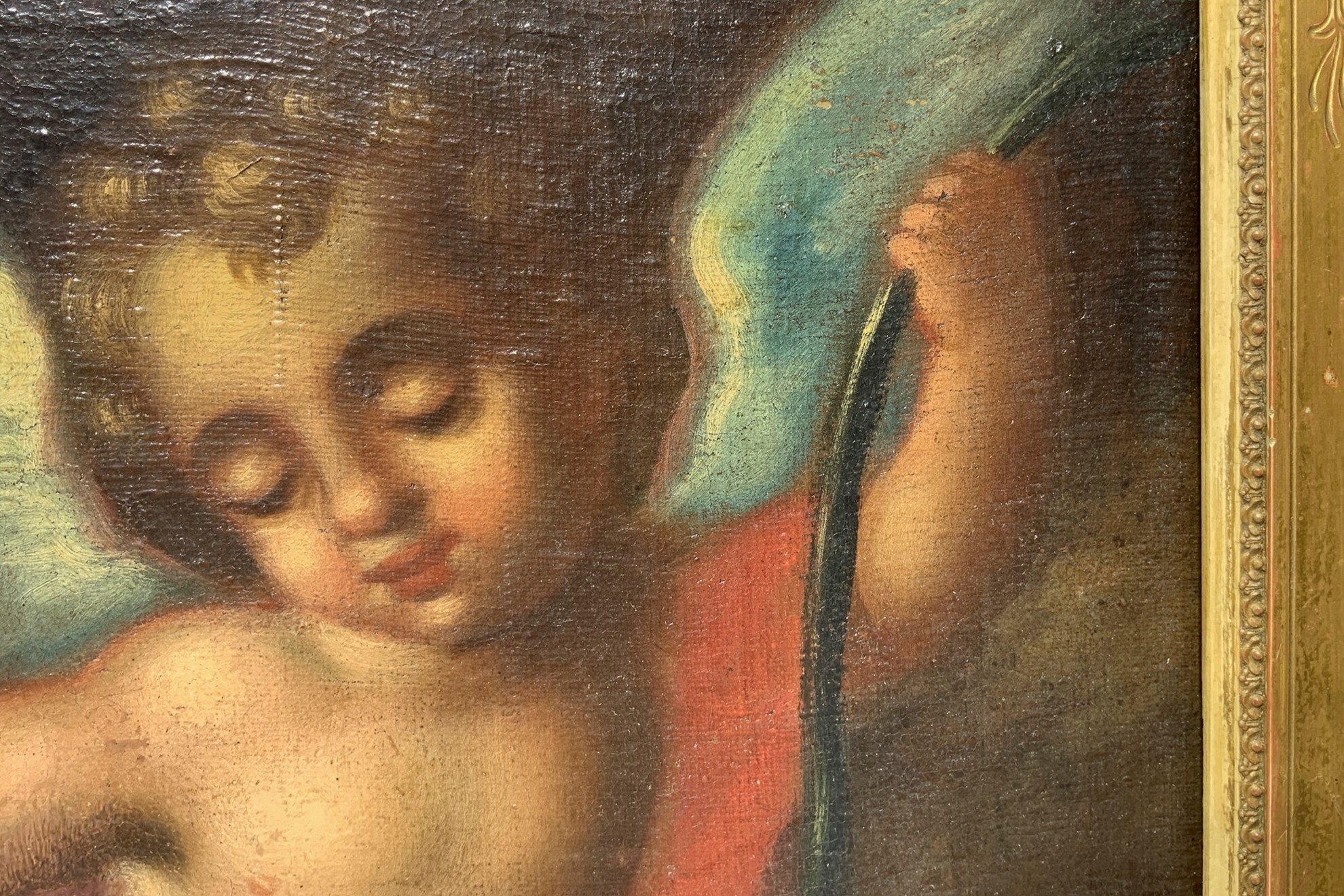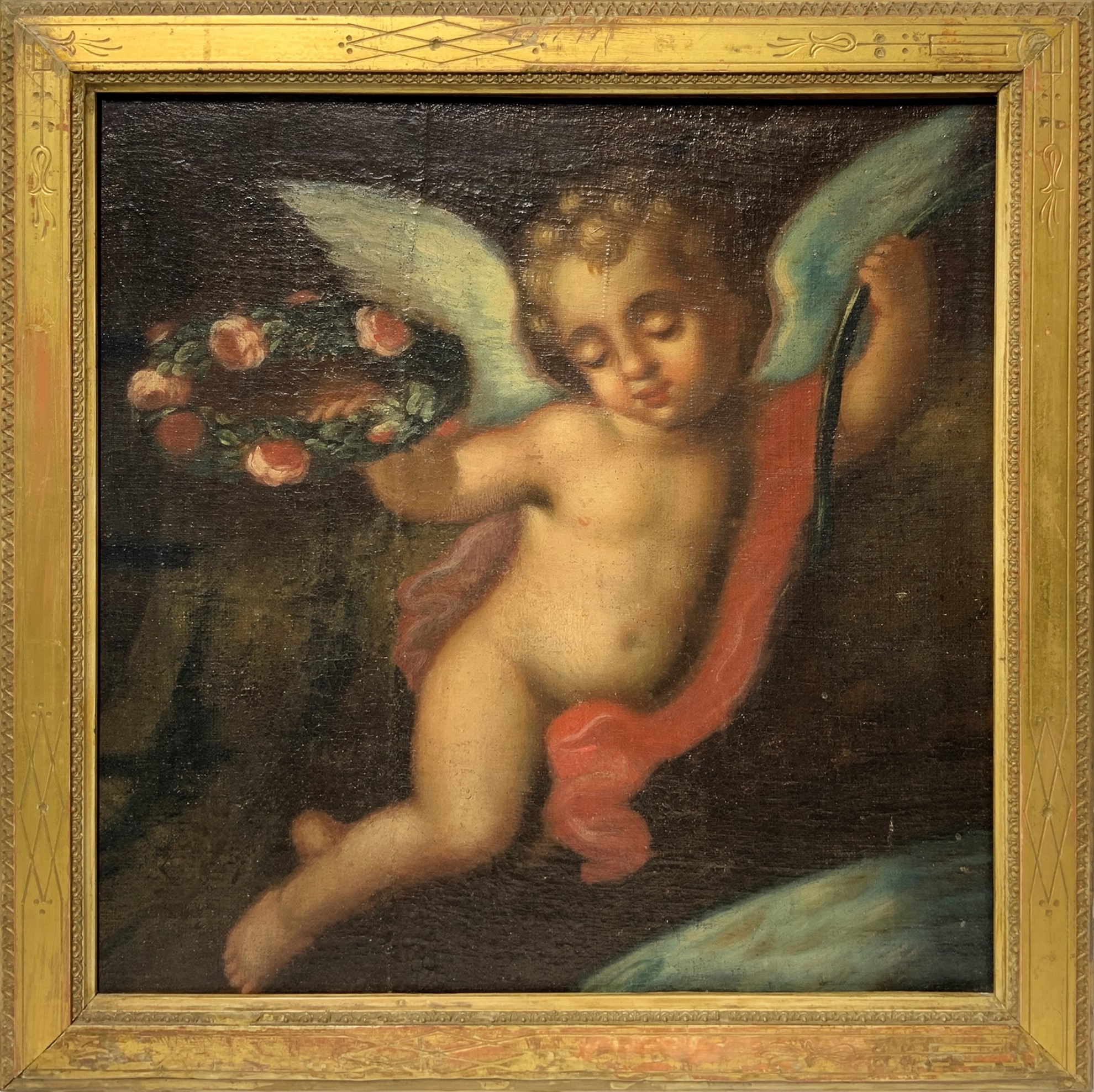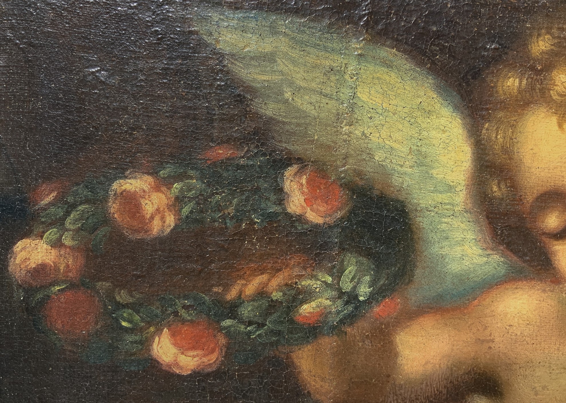 Cm 50x50 XVII secolo Cupido con arco e corona di fiori Dipinto ad olio su tela Presente vecchio reintelo. Pittore genovese del XVII secolo.
