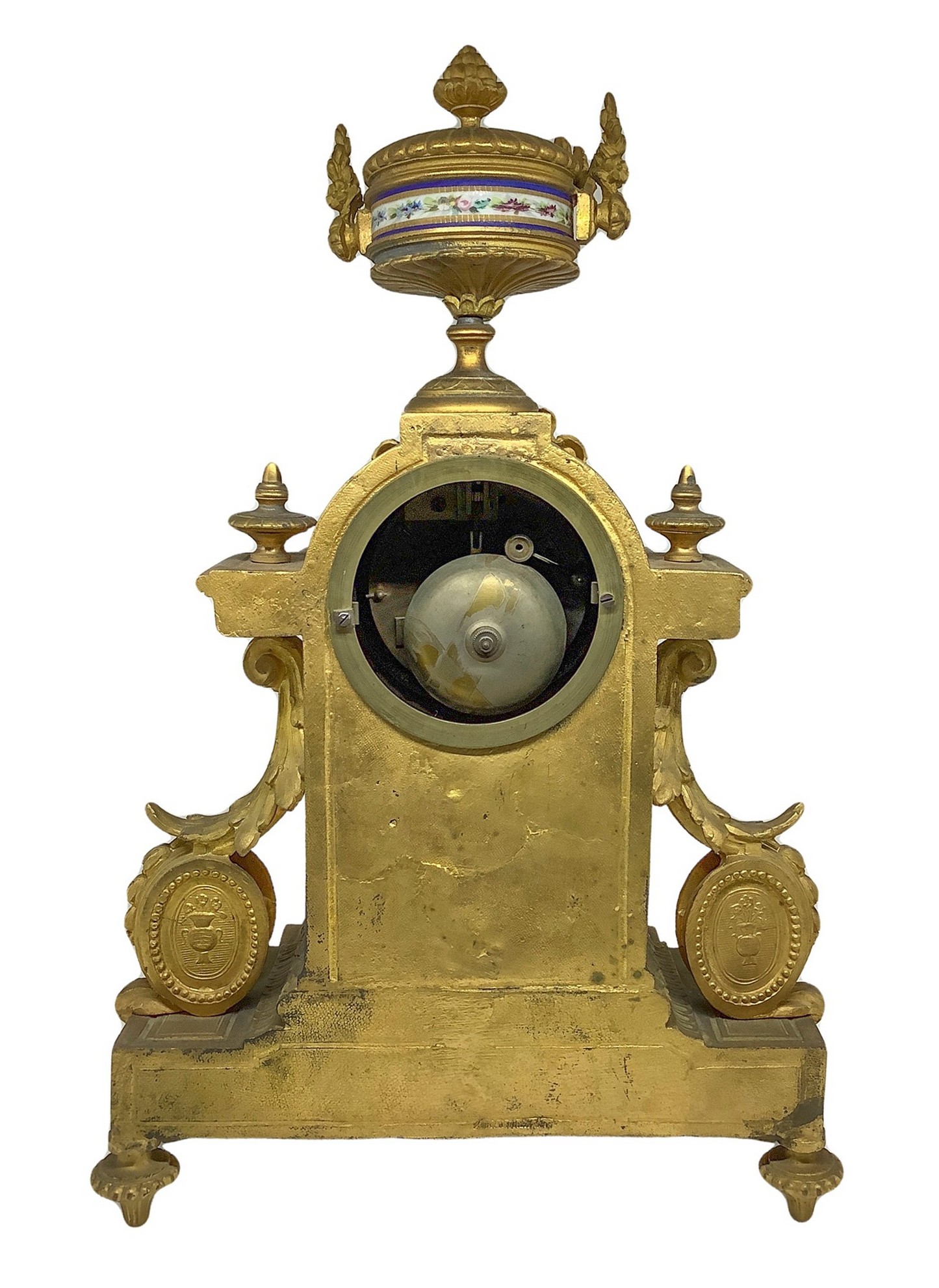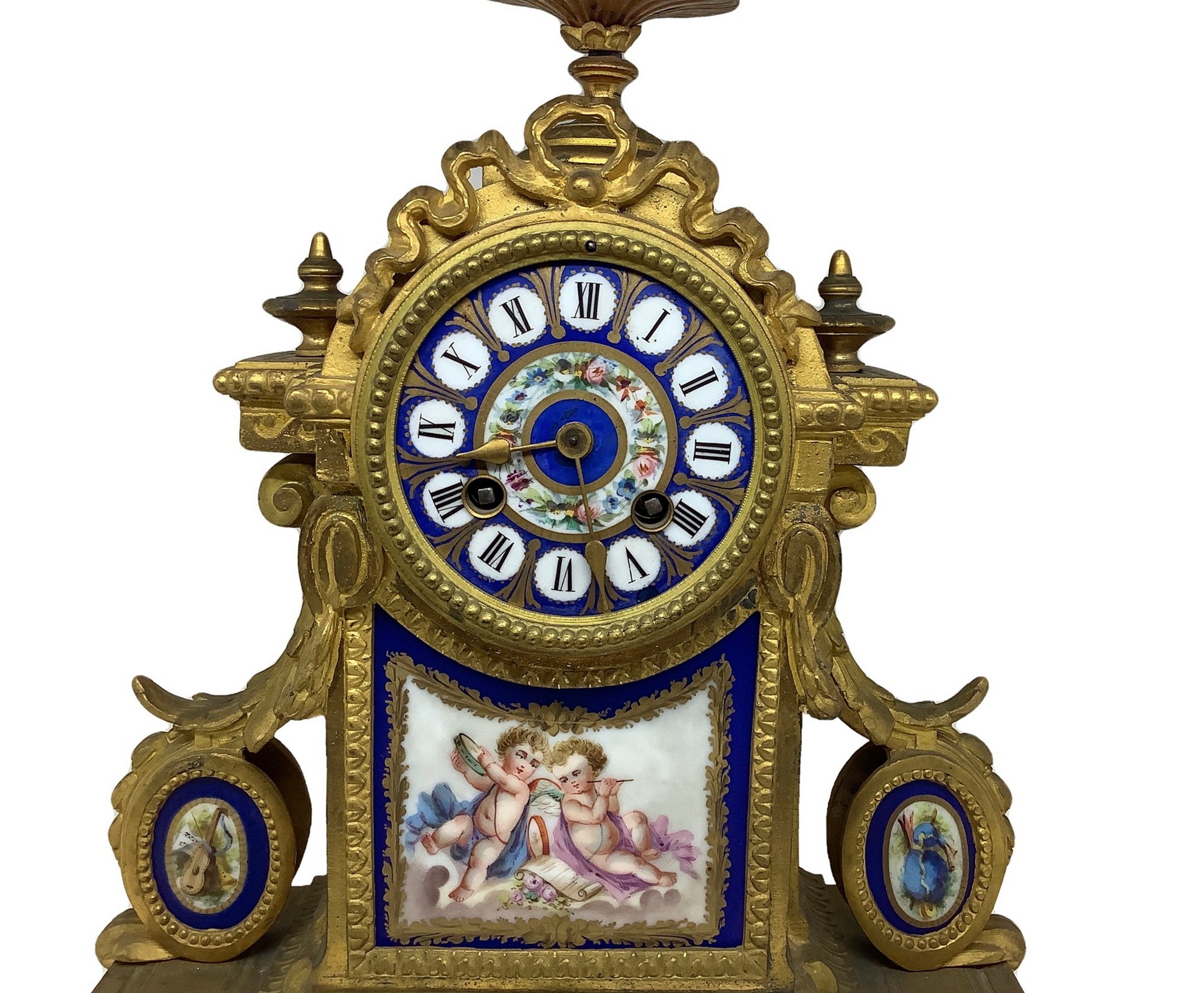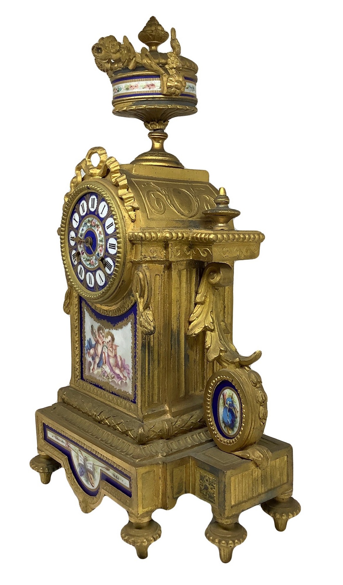 h 40 cm, 30x10 cm XIX secolo Orologio da tavolo a pendolo in bronzo dorato con porcellana raffigurante puttini al centro. Quadrante in porcellana blu floreale.