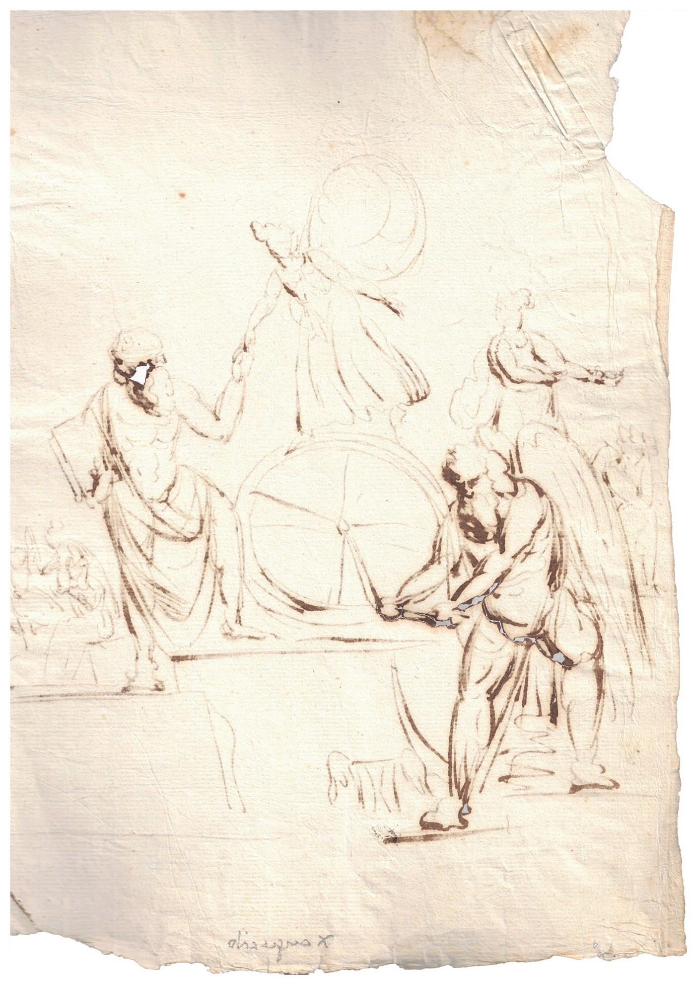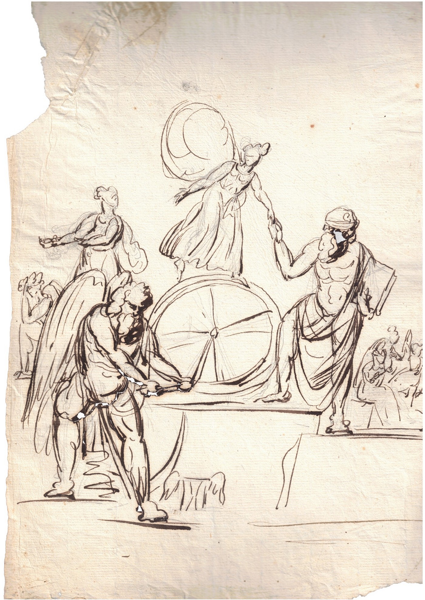 31x21 cm XVII secolo Scena mitologica raffigurante Tanato che fa girare la ruota della vita Disegno inchiostro nero su carta antica vergellata con filigrana con giglio