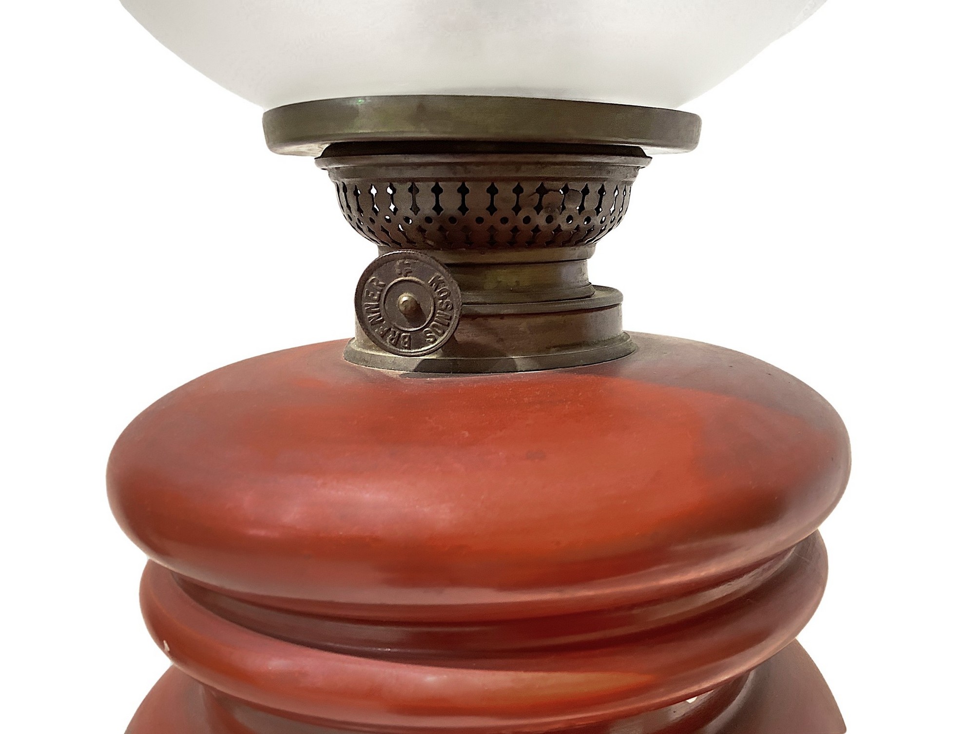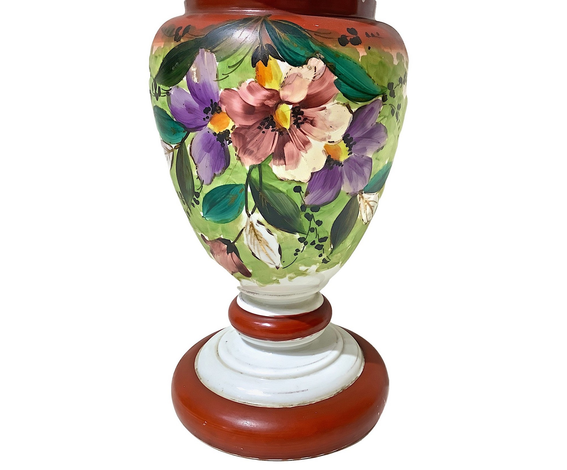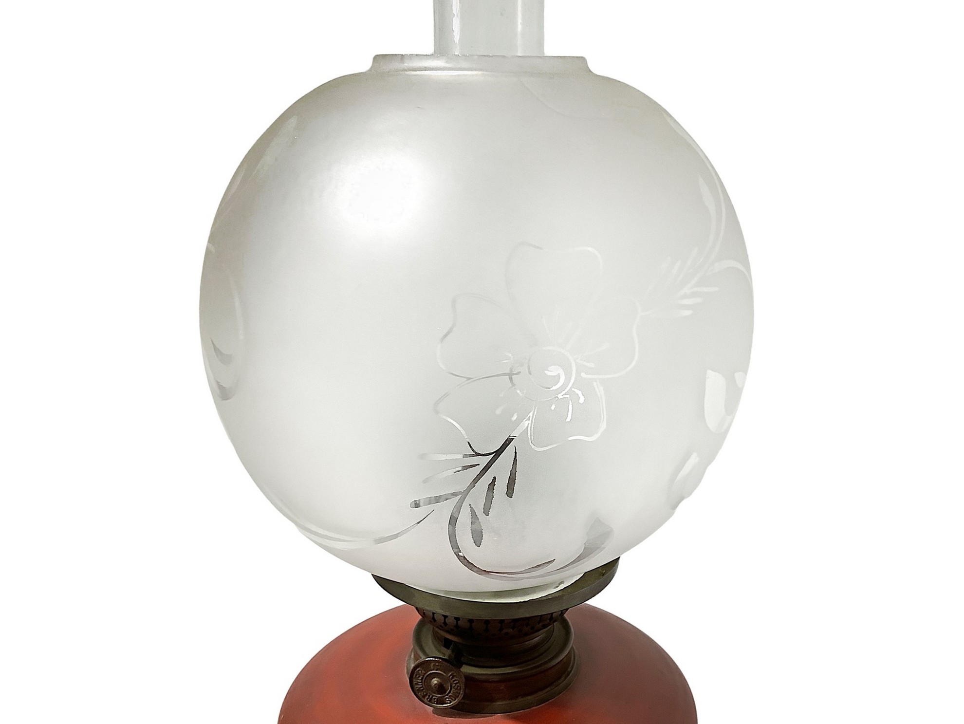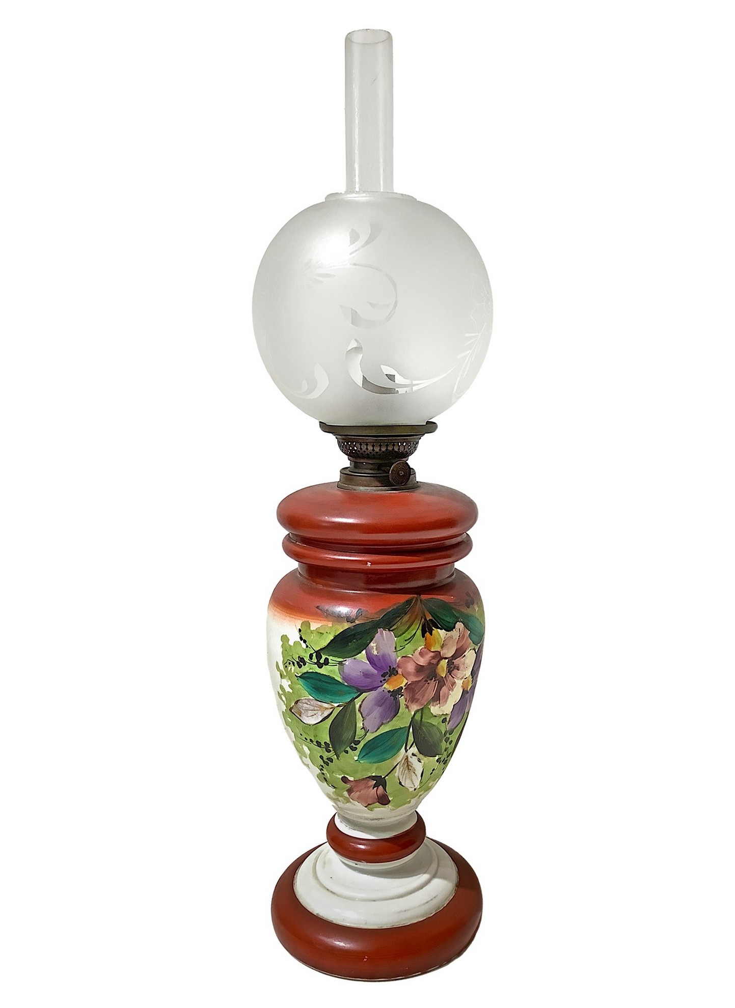 H 67 cm Lume a petrolio in opalina Decorato a mano con soggetti floreali, boccia a vetro con sabbiature riportante decori floreali