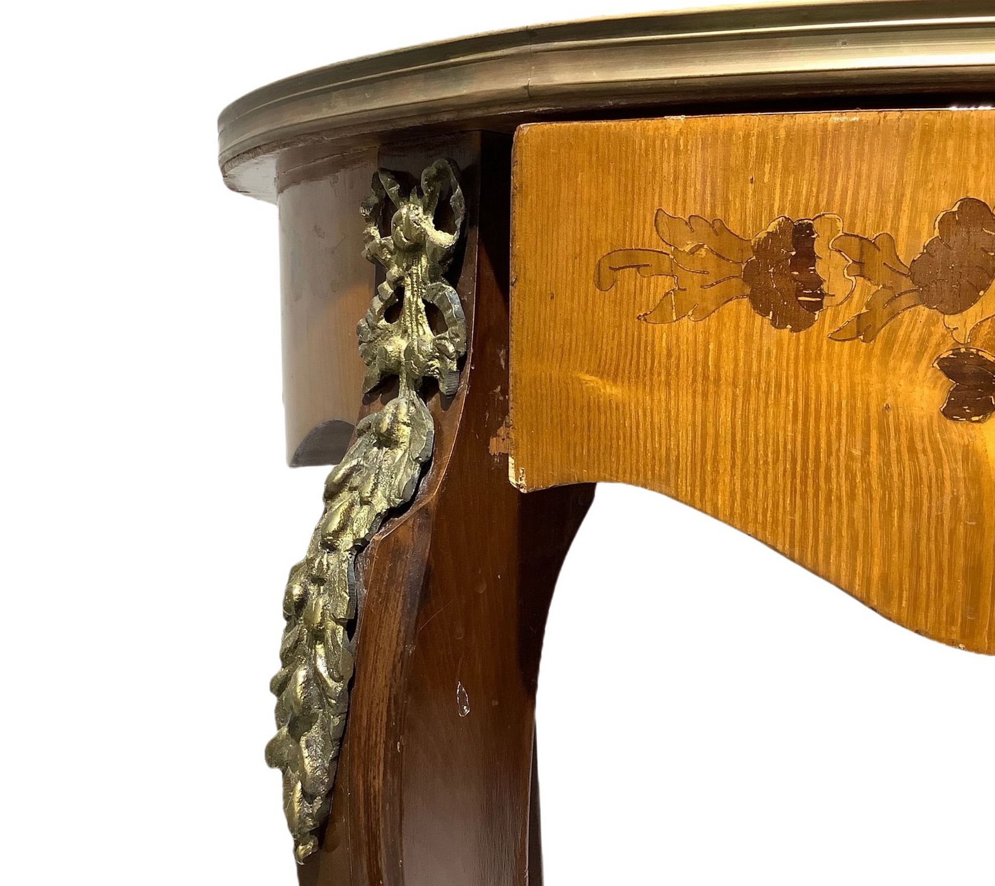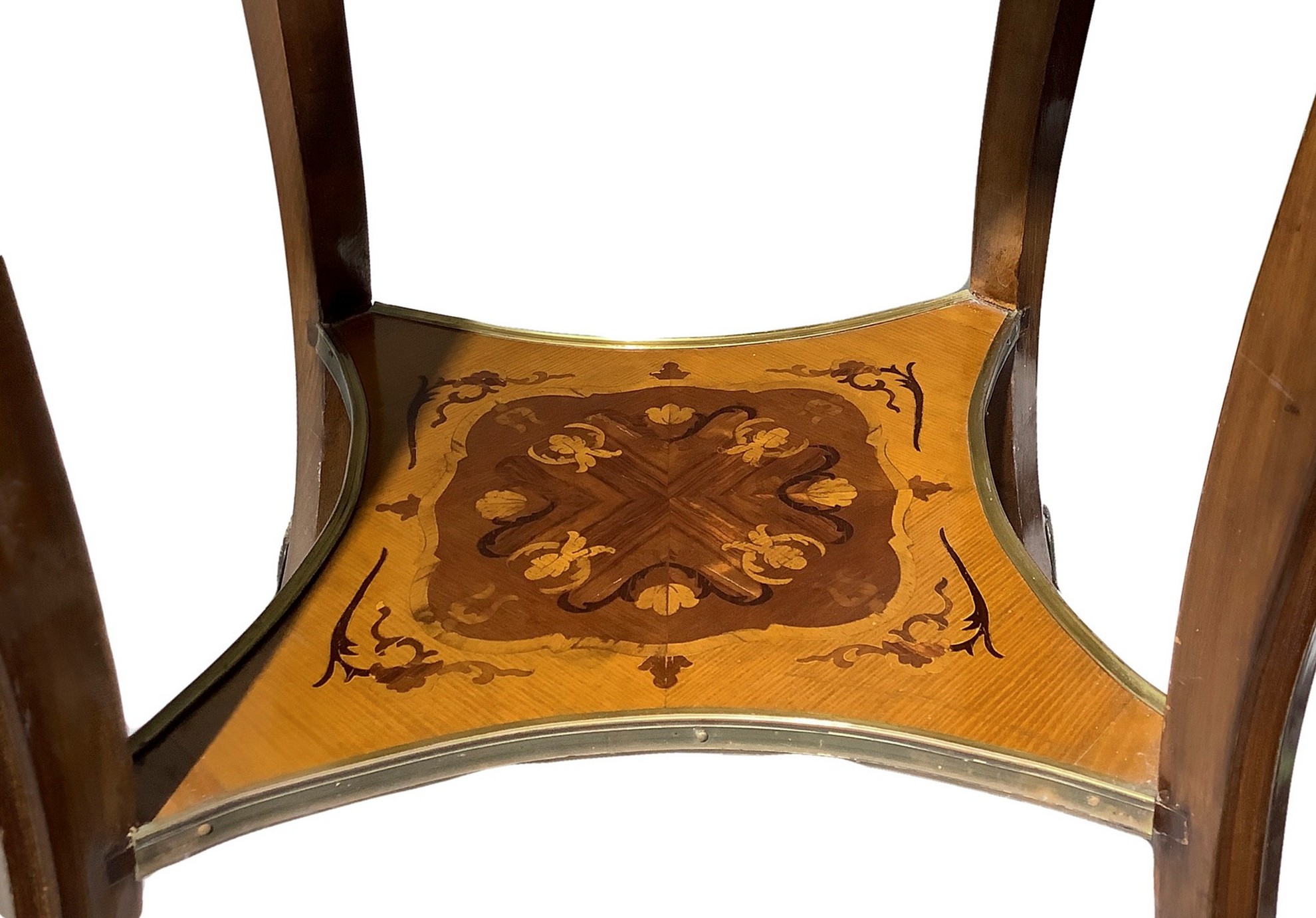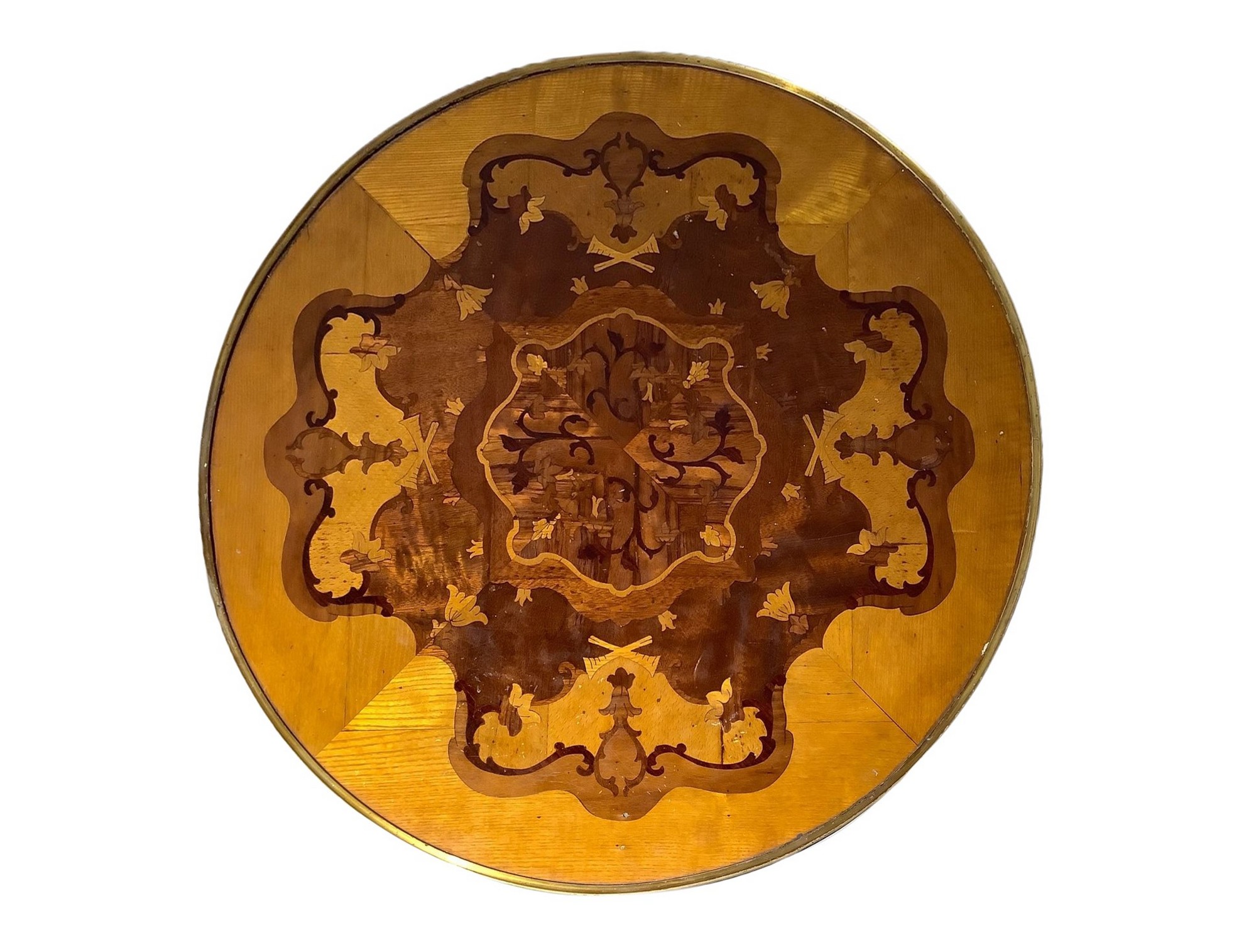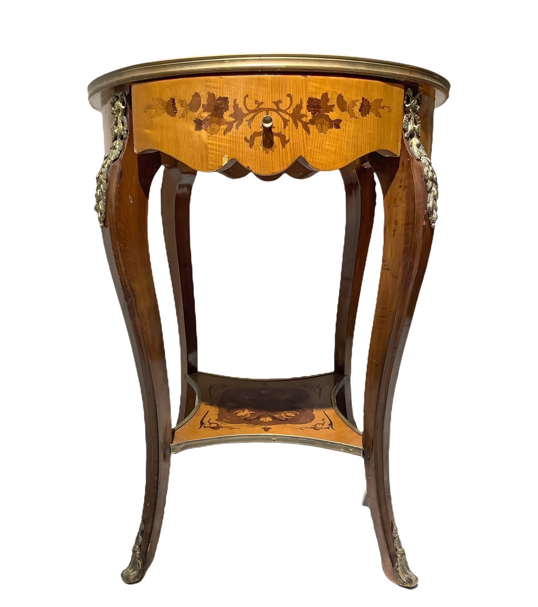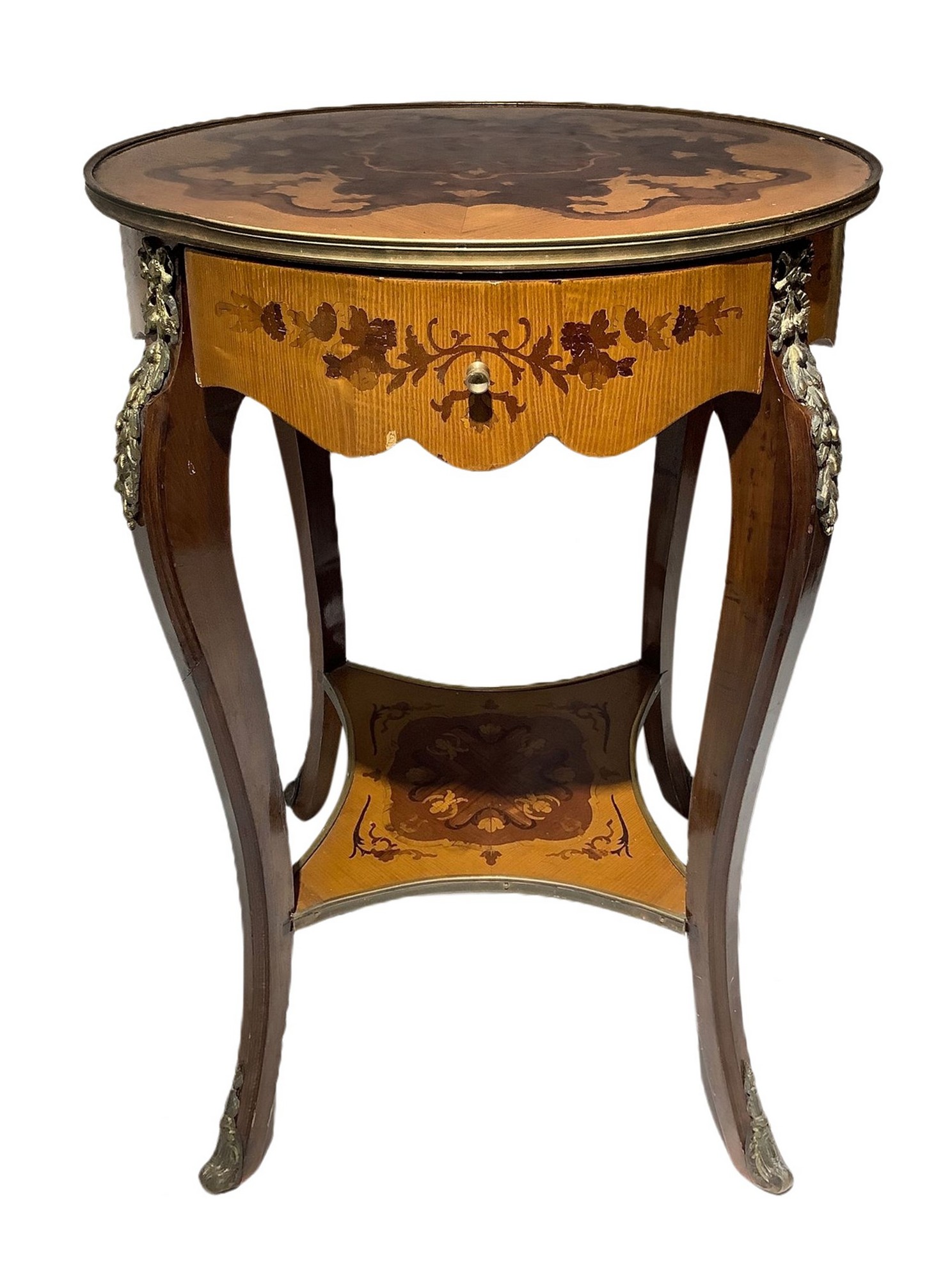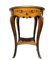 H 80 cm, diametro 60 cm Tavolinetto rotondo da centro in acero e palissandro Intarso al piano e al sottopiano. Cassetto centrale