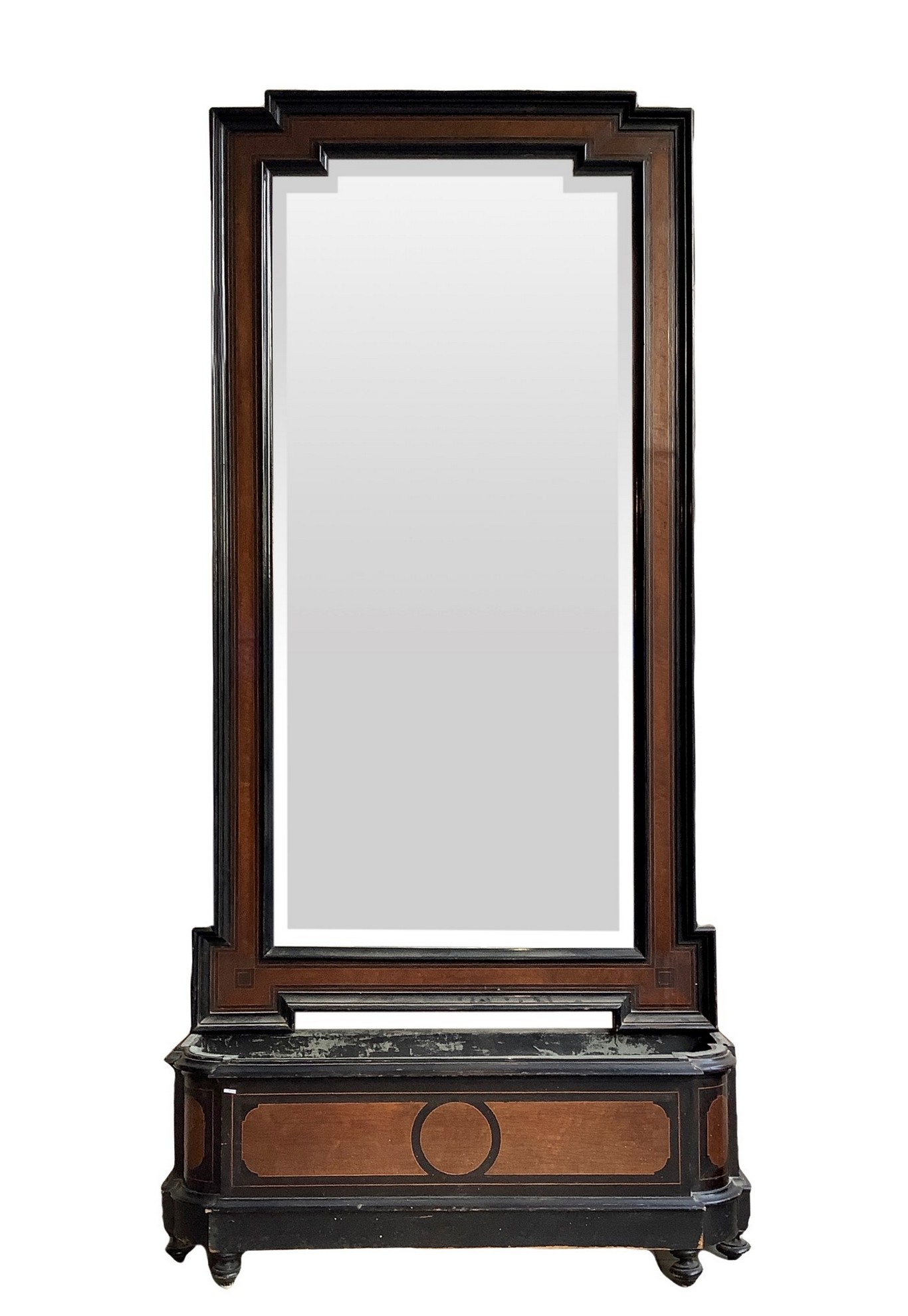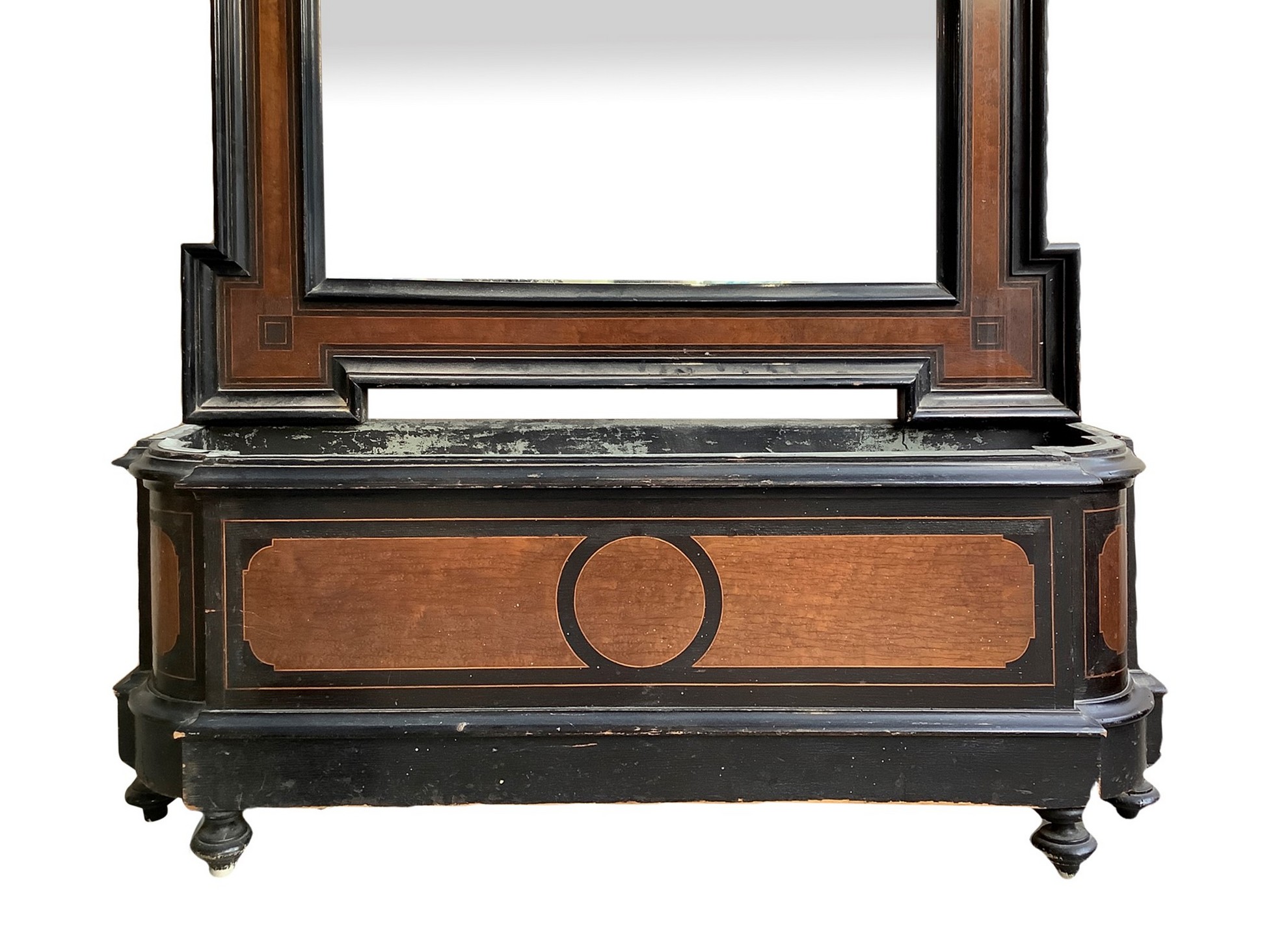 h 190 cm (47 cm base) 100x45 cm XIX secolo Specchiera con fioriera in legno di palissandro con cornici ebanizzate nere base staccabile in legno nero e riserve a contrasto. Piedi a cipolla, provenienza Sicilia.