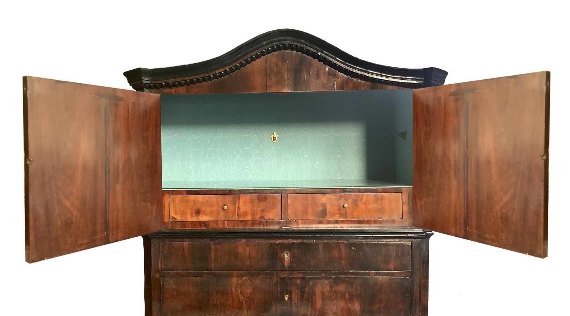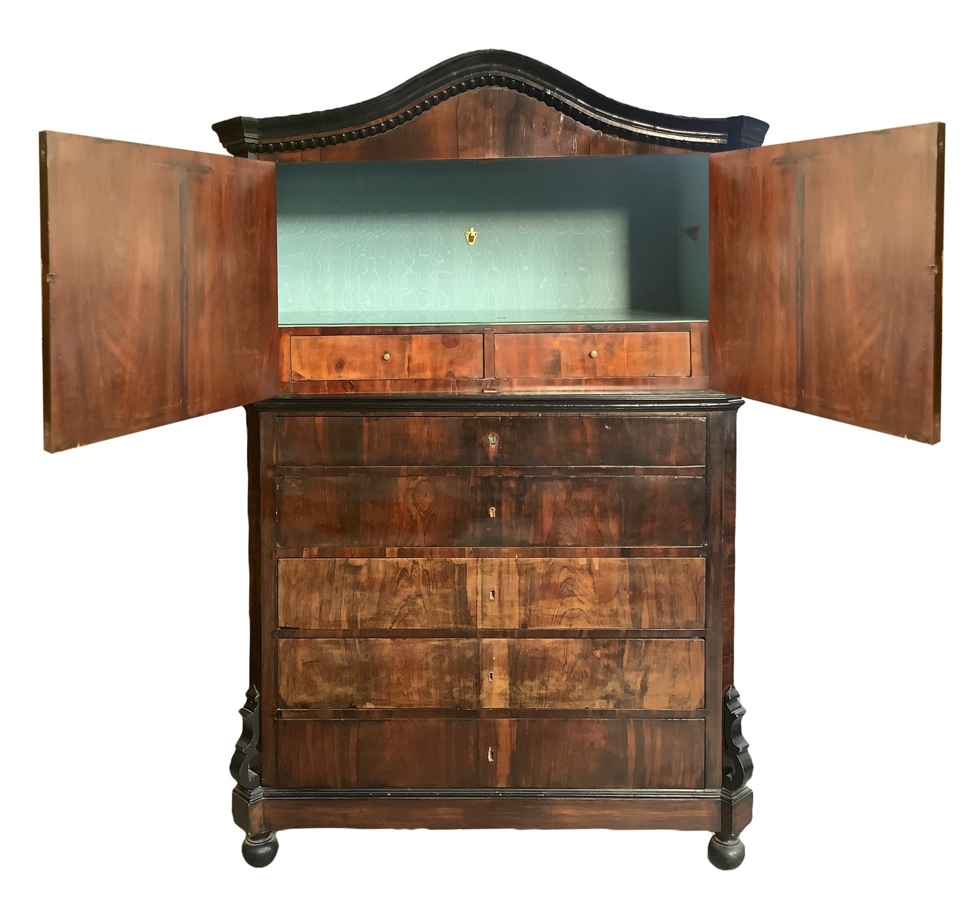 h 2,8 m, 119x55 cm Metà XIX secolo Chiffonier in legno di palissandro, corpo inferiore composto da cinque cassetti piedi a cipolla e sculture applicate agli angoli. Corpo superiore con due sportelli e cimasa modulata con cornice ebanizzata nera, sottolineata da appallottolato. Interno con vano centrale provvisto di due cassetti alla base. Provenienza Sicilia, ottime condizioni.