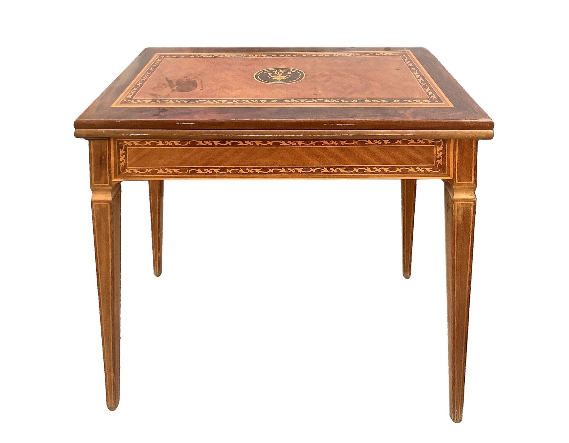 82x79x40 cm XIX secolo Tavolo da gioco in legno, pieghevole, con ribalta Intarsi floreali sul piano