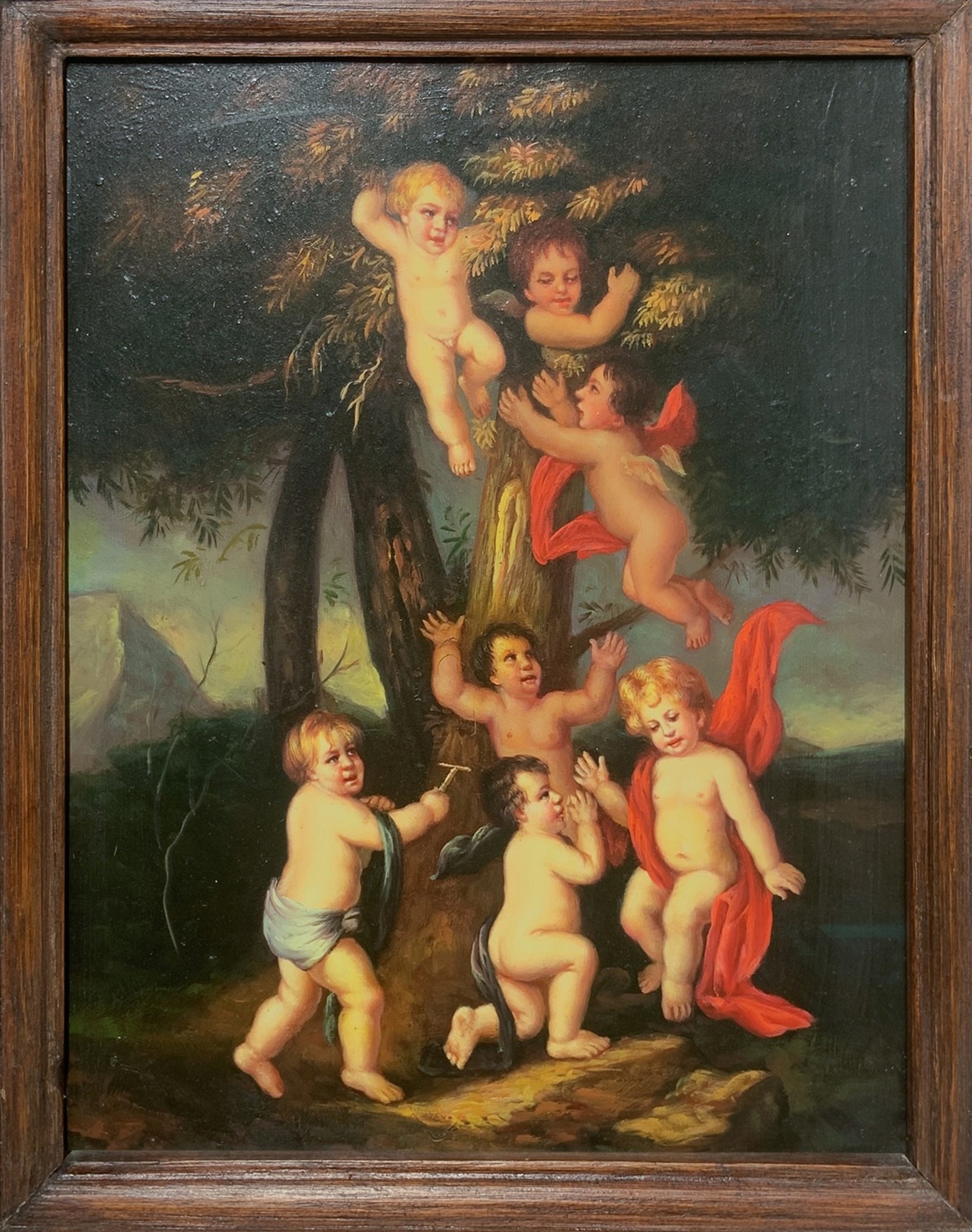 30x25 cm, in cornice 40x34 cm XIX secolo Gioco di putti Dipinto a olio su rame