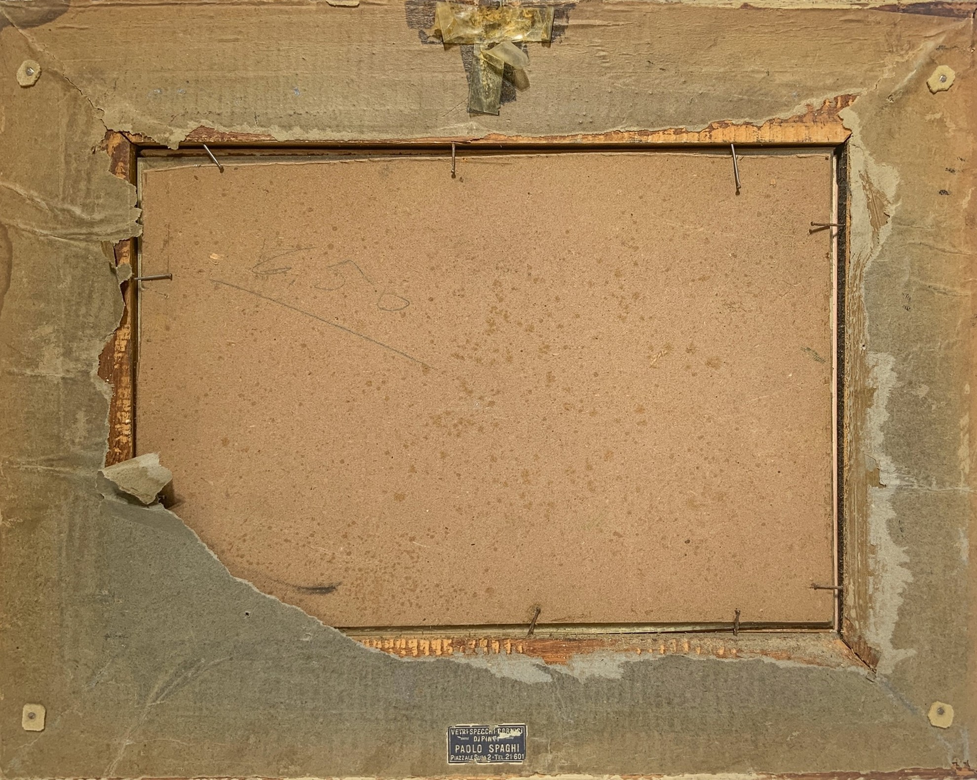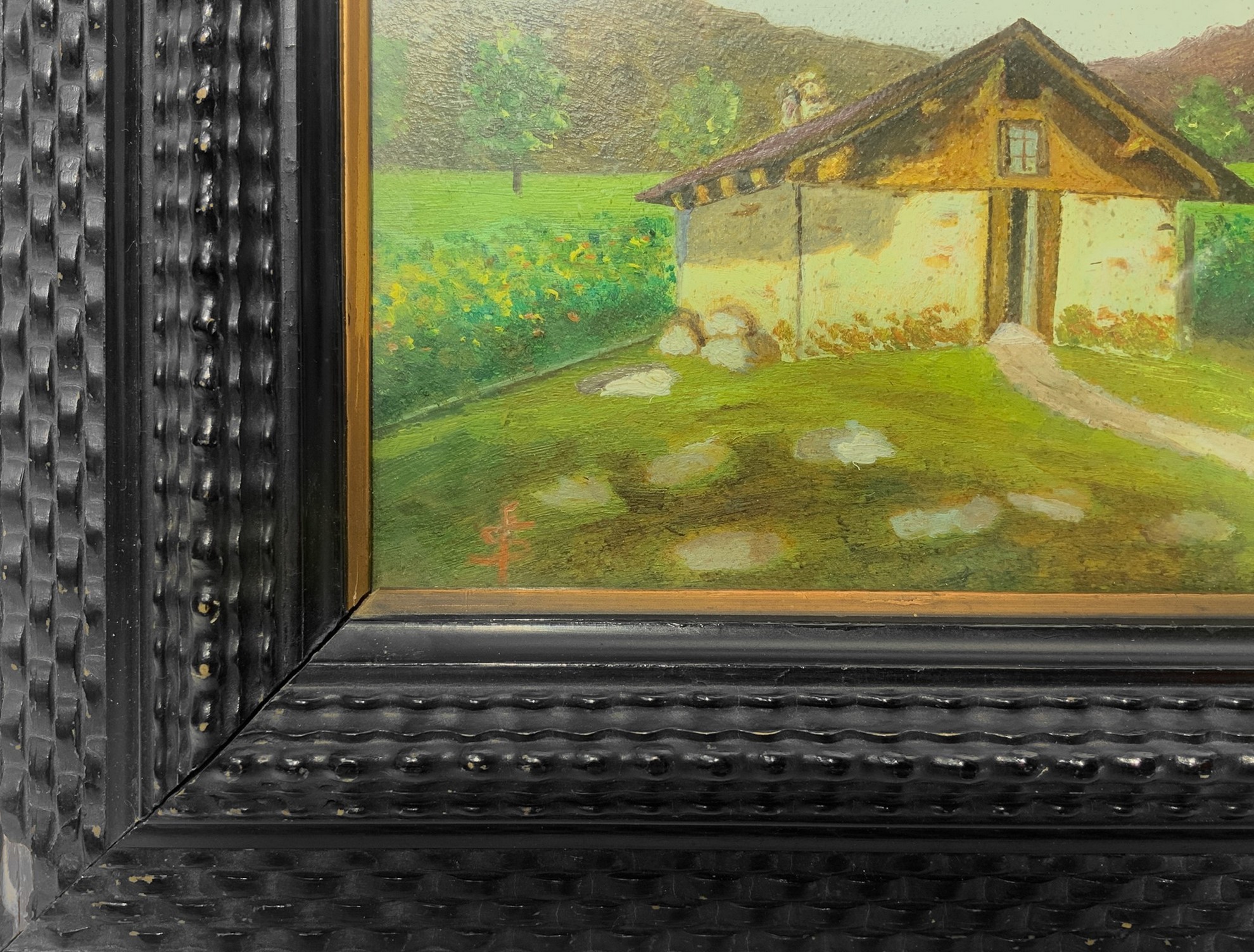 17x26 cm, in cornice 29x38 cm Paesaggio con casa Dipinto a olio su cartone pressato Firmato con monogramma S.P. in basso a sinistra, etichetta con nome dell'artista sul retro ed in basso al centro. In cornice nera ebanizzata guilloché