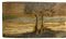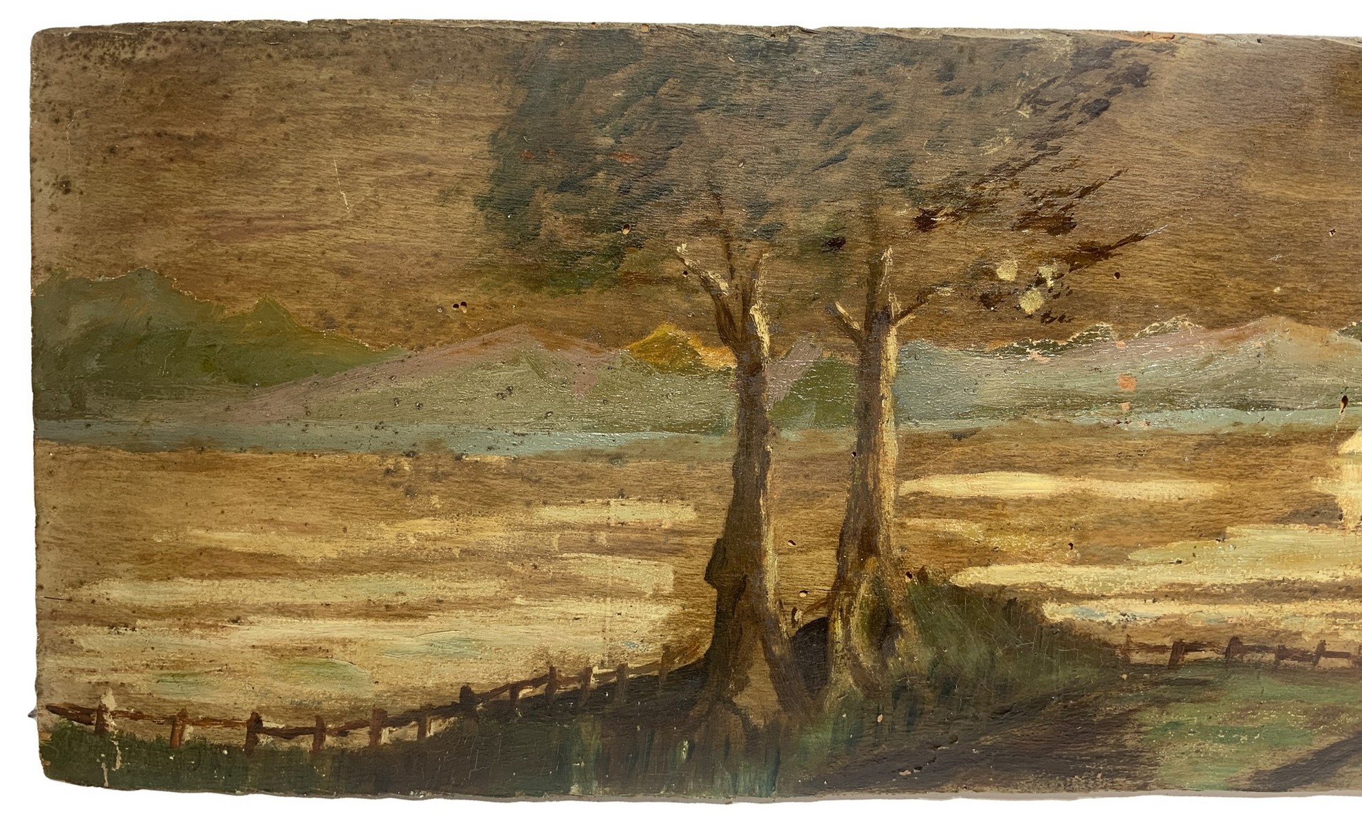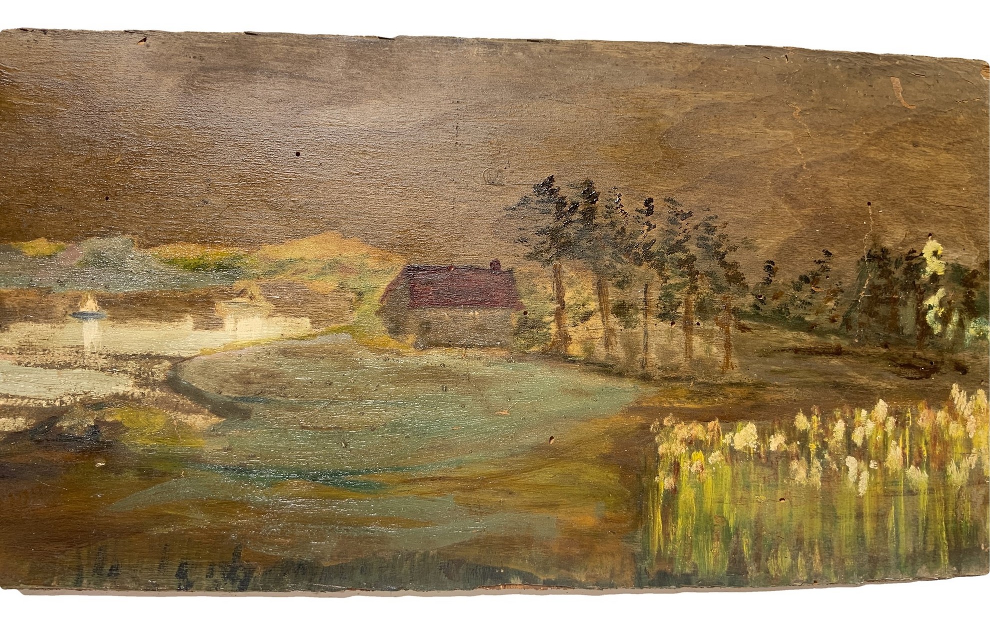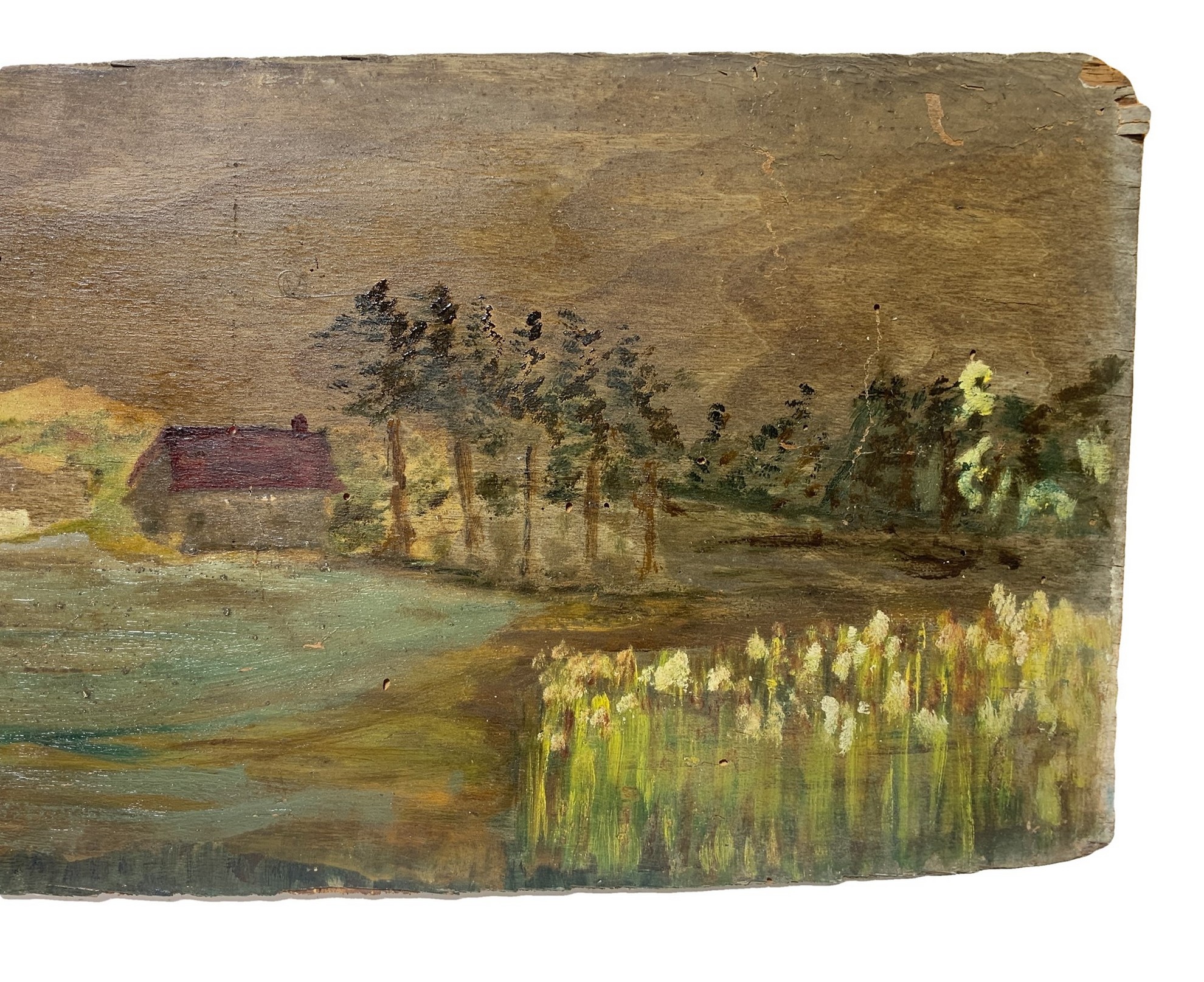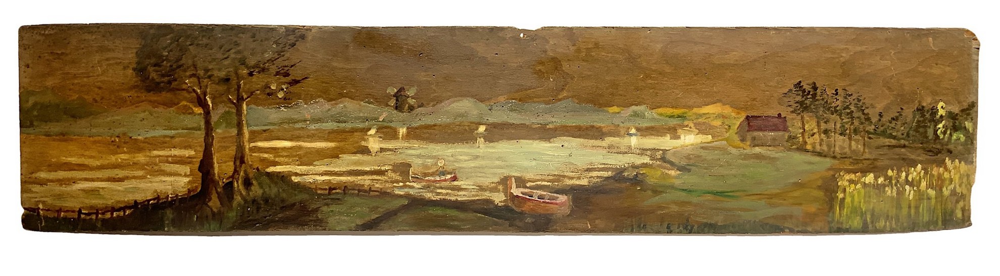 27x125 cm Inizio XX secolo Sopraporta raffigurante paesaggio con alberi e barche Olio su compensato Privo di cornice
