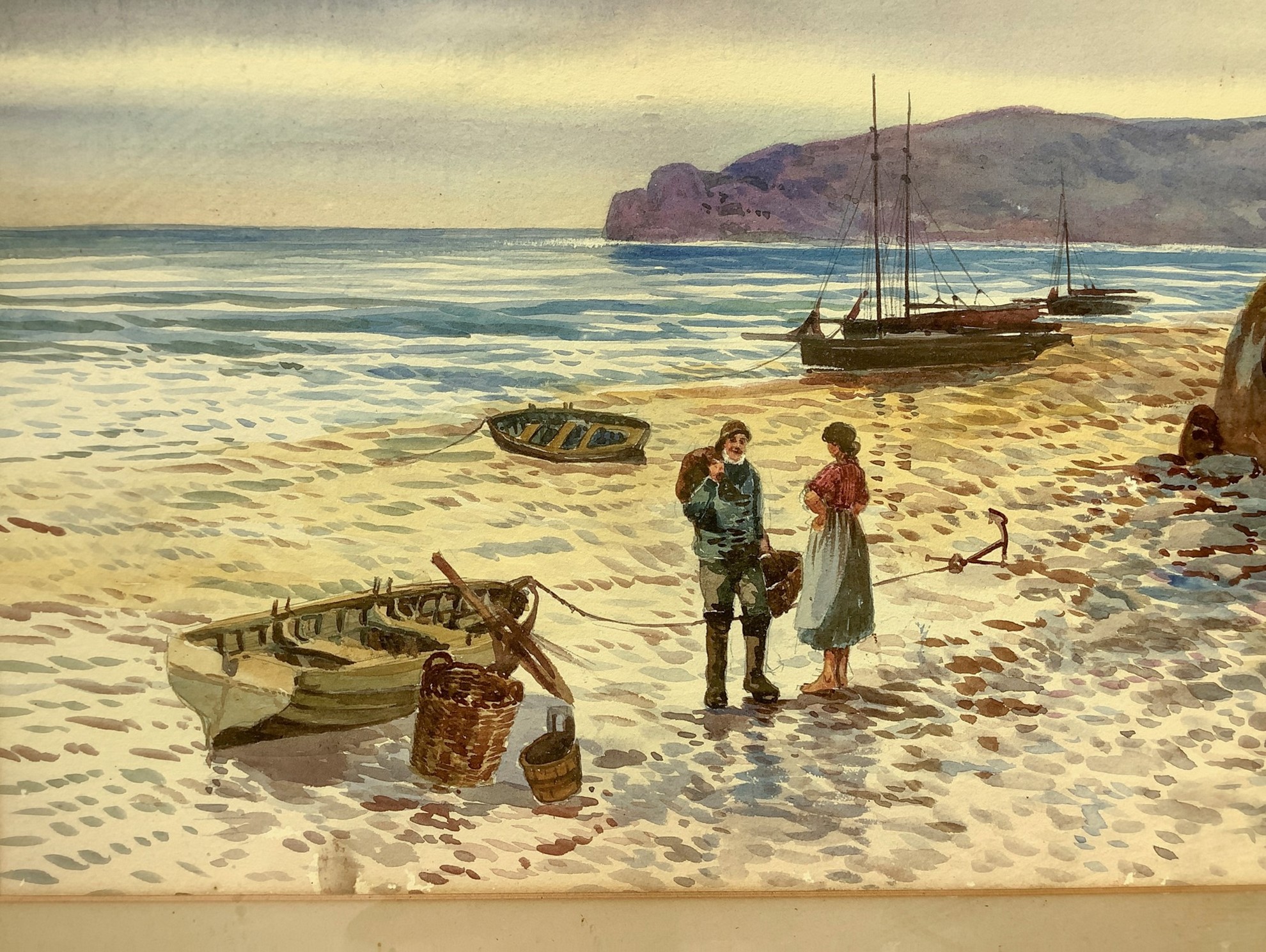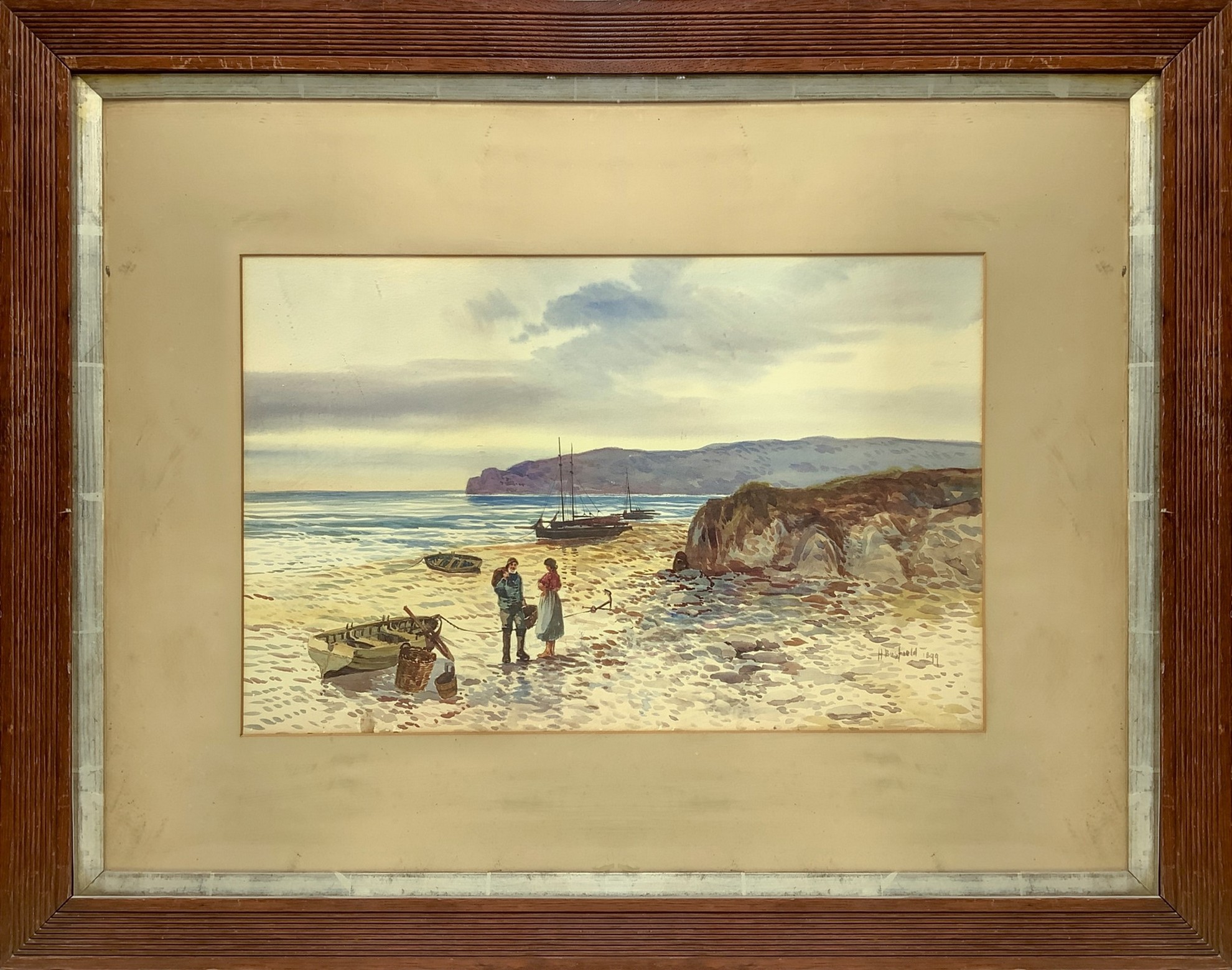 32x50 cm, in cornice 74x82 cm 1899 Marina con barche Acquerello Firmato H. Bustield