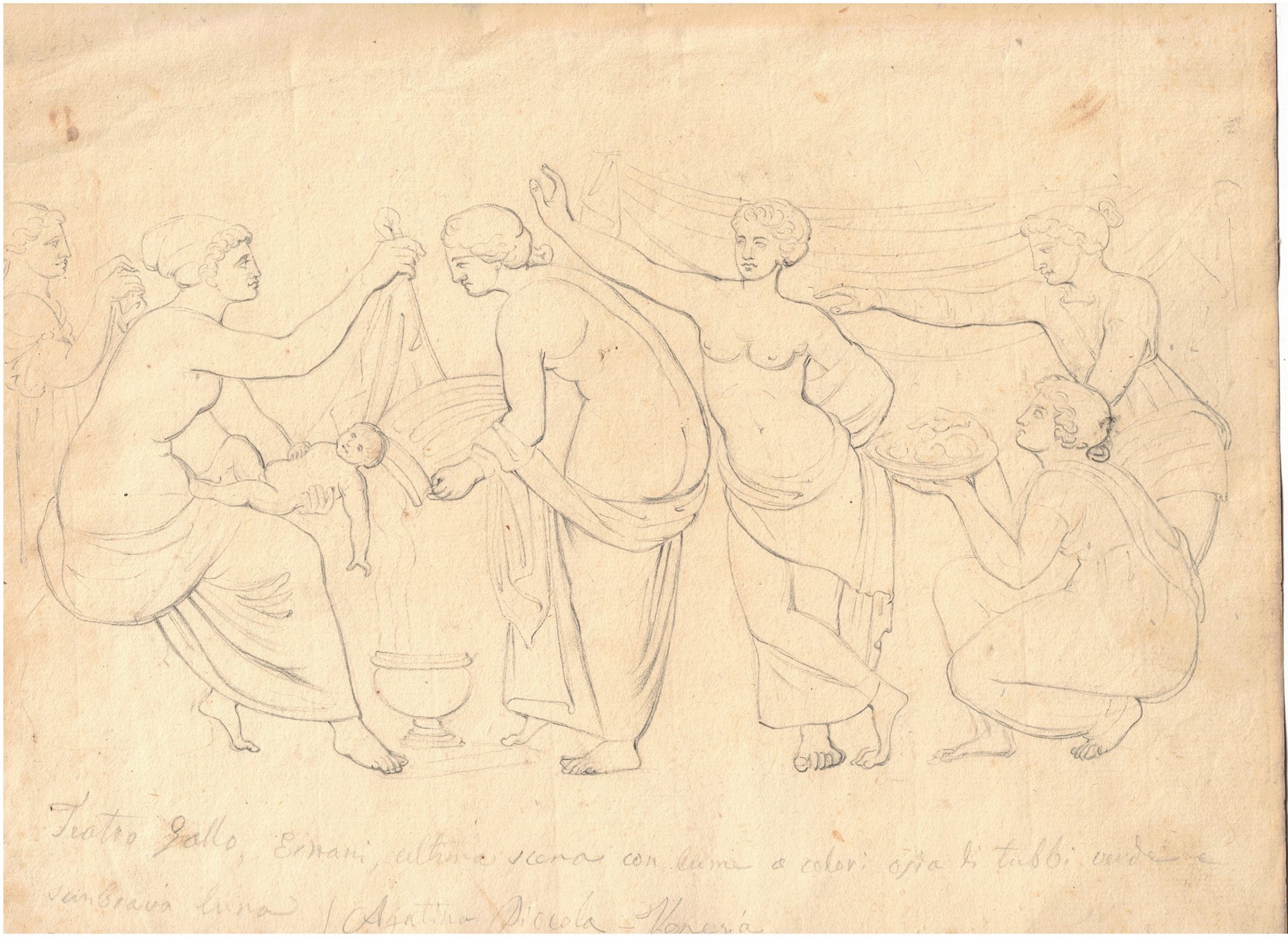 23x29,5 cm Inizi XIX secolo Ancelle nell'atto di lavare un neonato Disegno a matita Maestro neoclassico