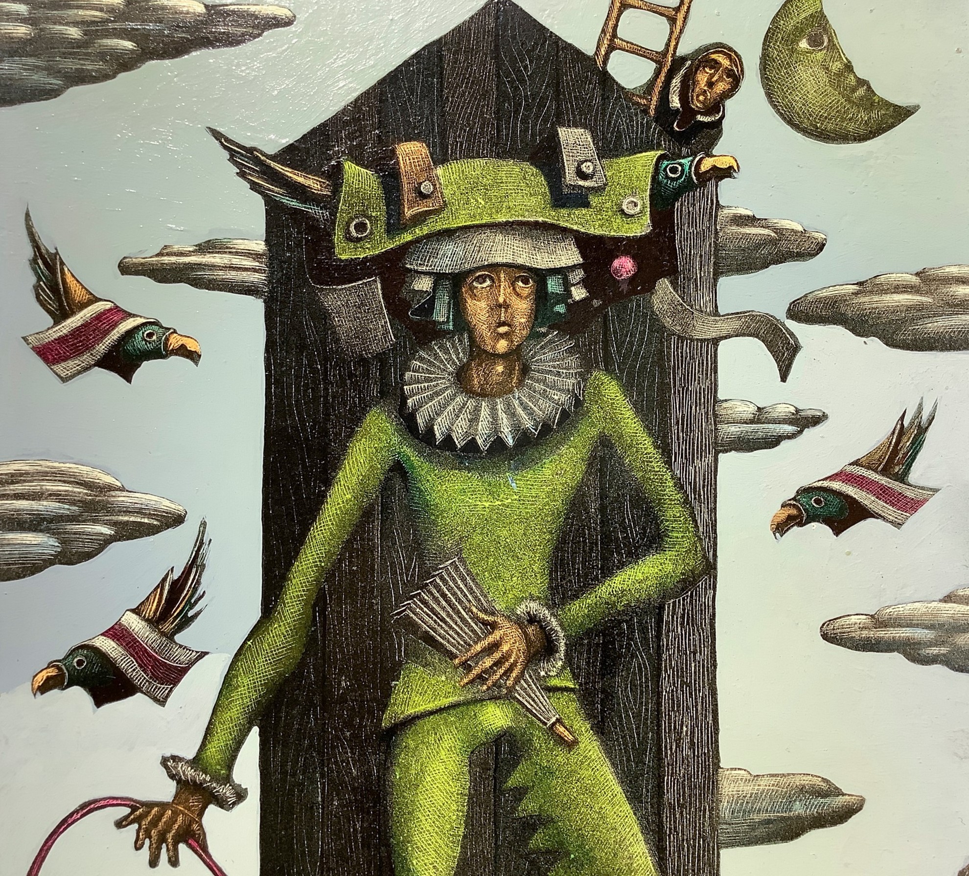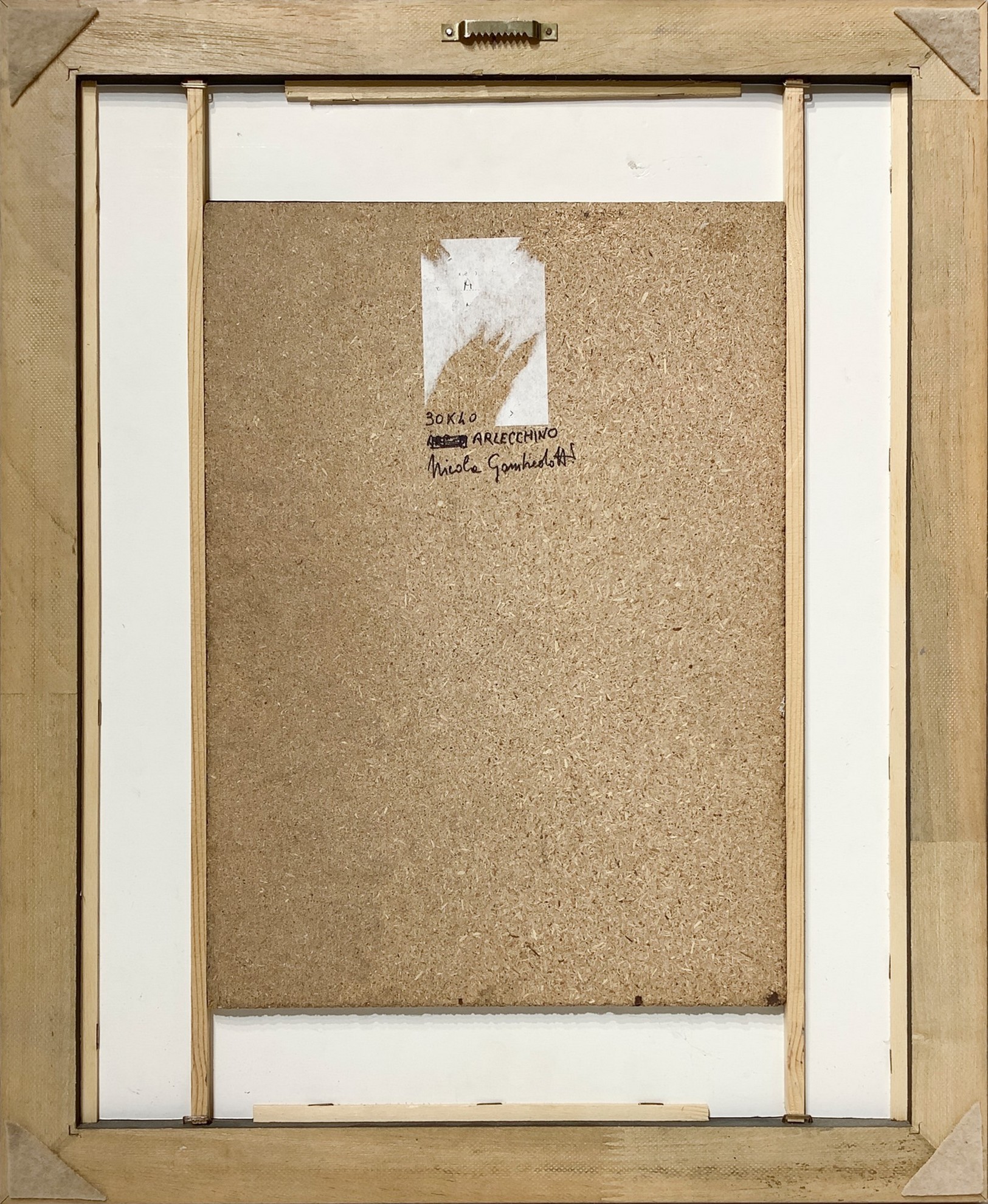 H cm 40 x30, in cornice H cm 58x48 Arlecchino Dipinto ad olio su tavola. Firmato in basso a sinistra ed al retro.